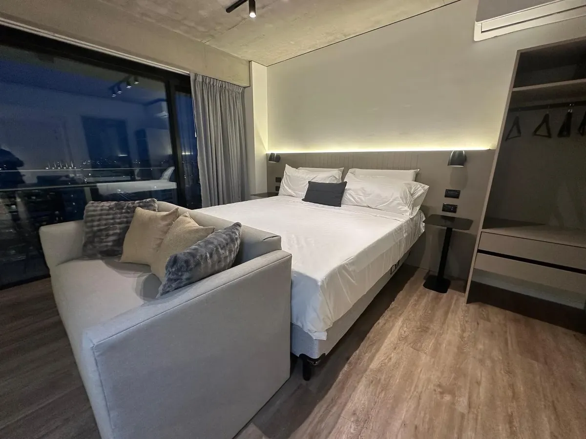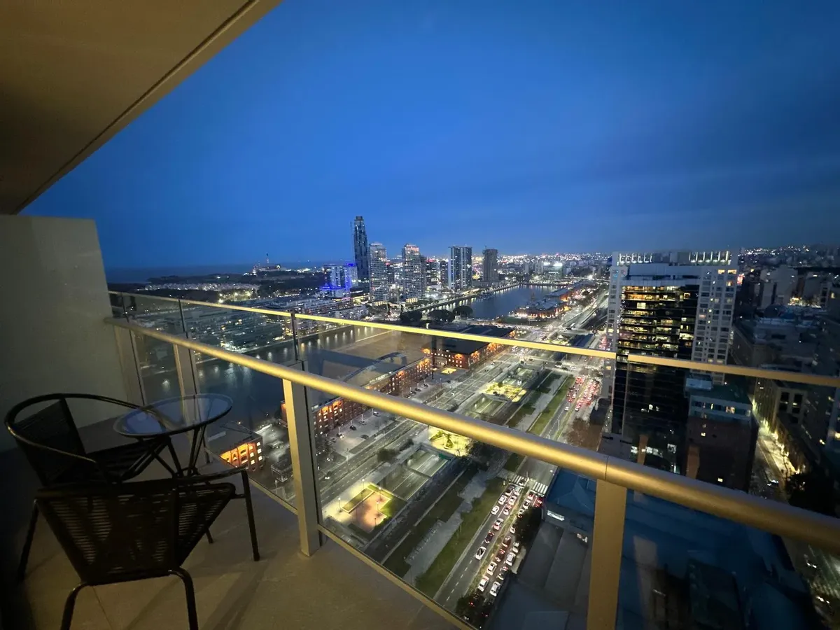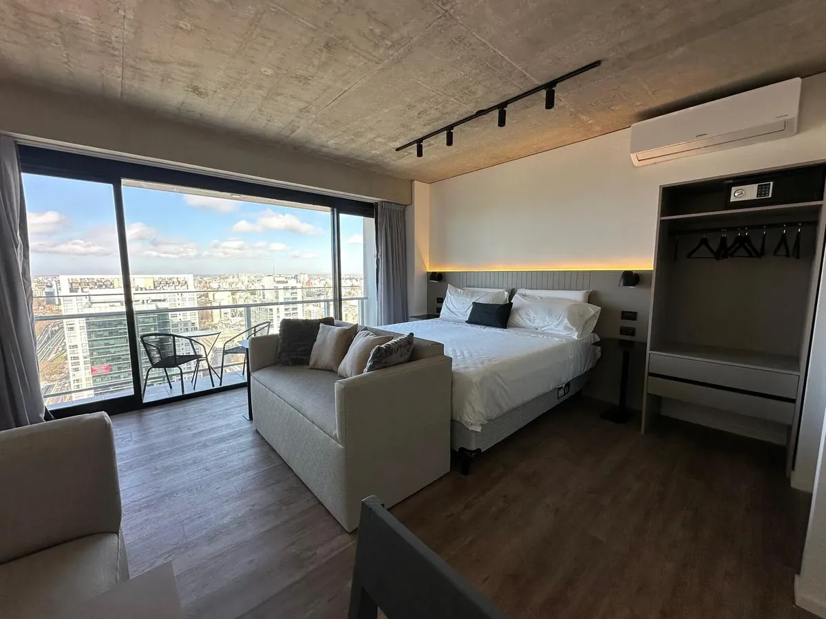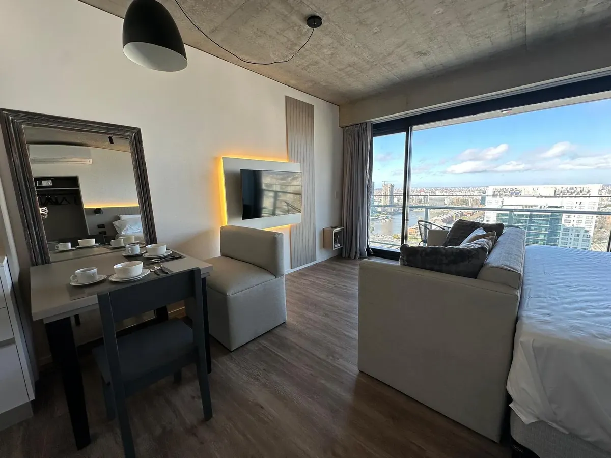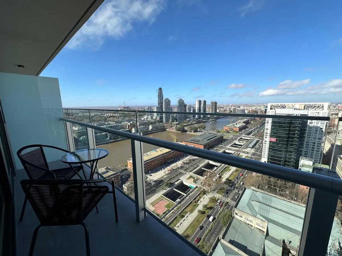 Квартира-студия площадью не указана, расположена на 30+ этаже в Quartier del Bajo, Puerto Madero, с балконом и панорамным видом на реку и город. Студия полностью меблирована и оборудована: полусопряжённая кухня с бытовой техникой Samsung и Electrolux, ванная комната, кофеварка Nespresso с Aeroccino, установлен сейф. Предусмотрены WiFi и Smart TV с доступом к платформам потокового вещания; предоставляется бельё. Срок аренды от 3 месяцев: USD 1.200 в месяц + коммунальные платежи здания.
