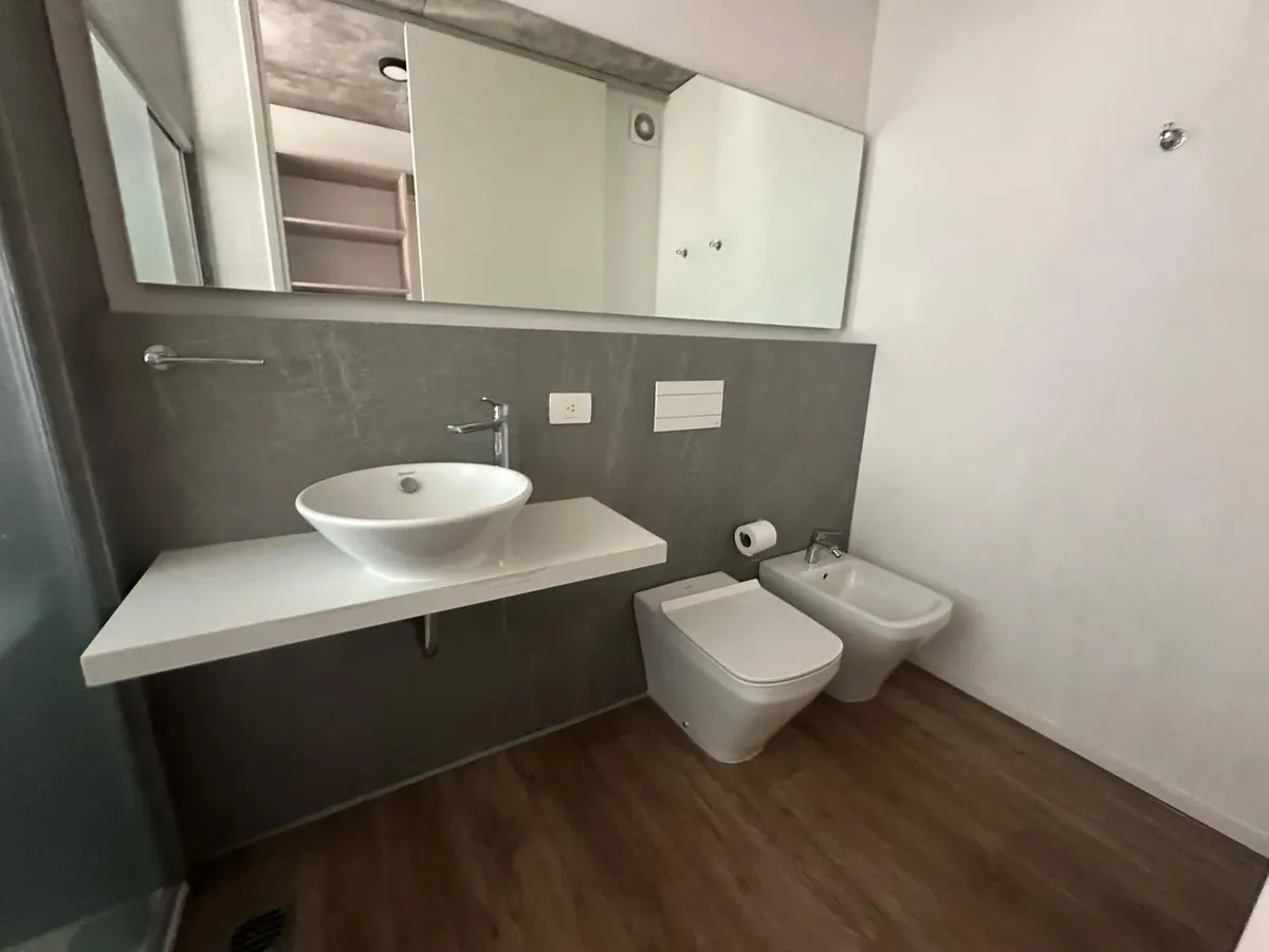 Квартира-лофт в формате 2 ambientes с возможностью разделения, с 1 спальней в suite. Площадь и этаж не указаны. Гостиная-столовая совмещена с кухней; есть выход на балкон. Также предусмотрен гостевой туалет, кухня с полуинтегрированной мебелью под столешницей. В аренду входит (закреплённое) парковочное место под крышей. В здании есть бассейн, общая гостиная для жильцов (SUM), зона гриля, подогреваемый бассейн, тренажёрный зал, сауна, массажный кабинет, гидромассаж, прачечная и охрана 24 часа. Qu