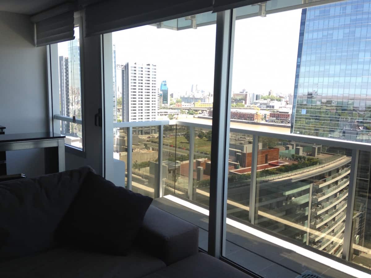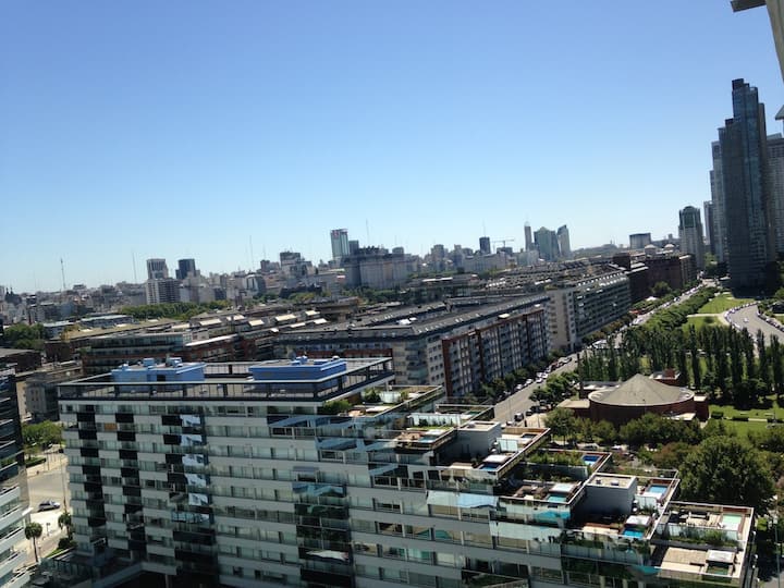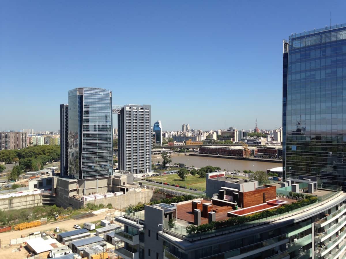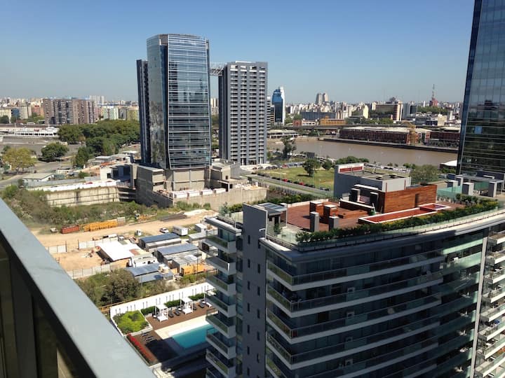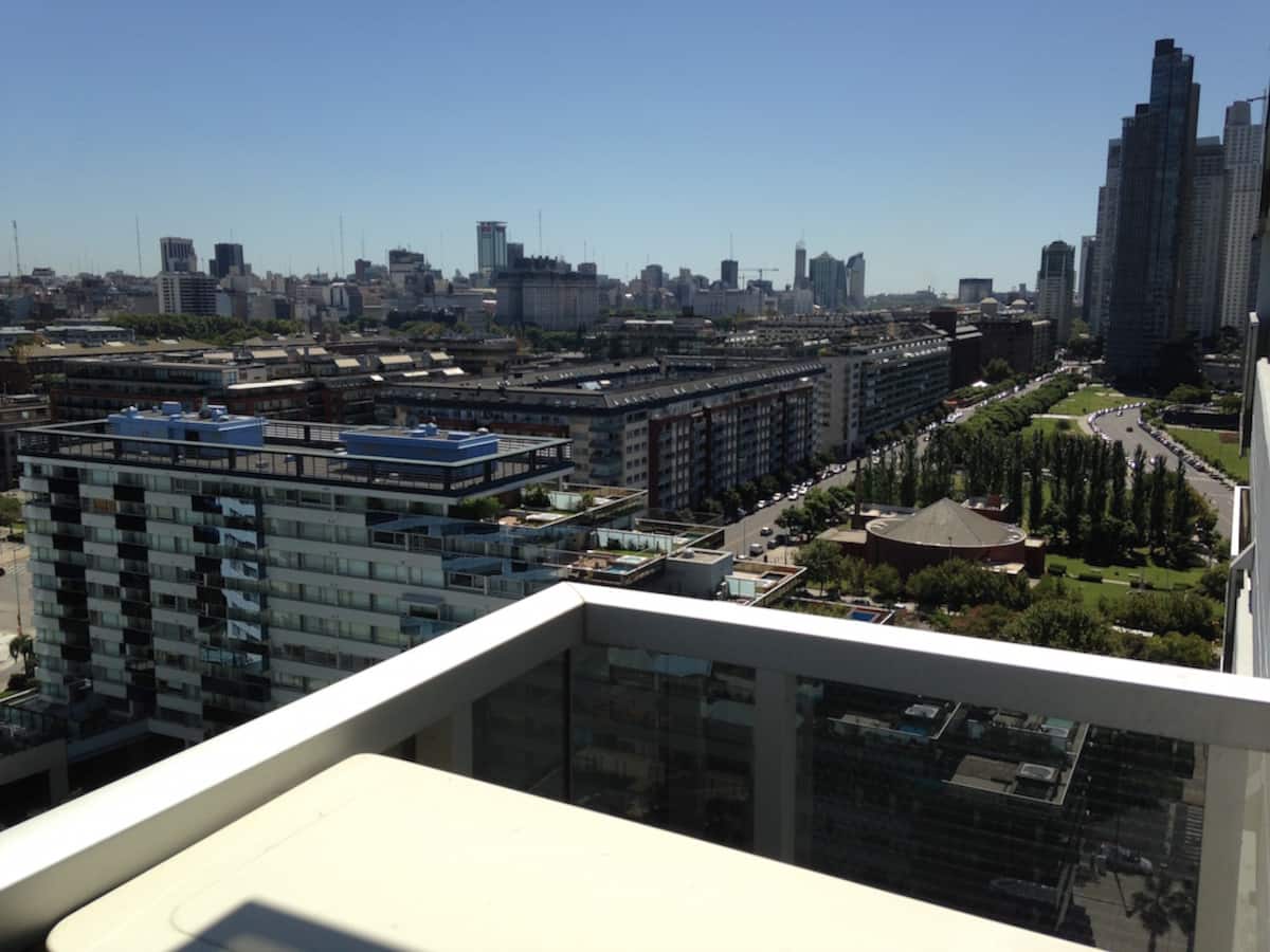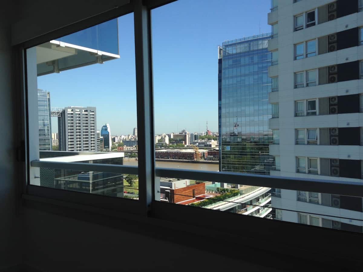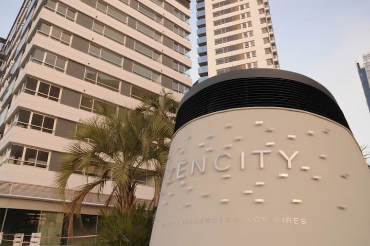 Квартира в Puerto Madero в комплексе Zencity, 2 комнаты. Планировка включает спальную с ванной комнатой en-suite и гардеробной, столовую и гостиную с паркетом и балкон с панорамным видом. В квартире есть холодильник, кухня с духовкой и телевизор, кондиционер hot/cold. В здании работают круглосуточная охрана, 3 бассейна с водопадами и подогревом воды, тренажёрный зал, сауна, джакузи, общая гостиная для жильцов (SUM), переговорная и видео-зона. Предусмотрены гостевой туалет и (закреплённое) парков