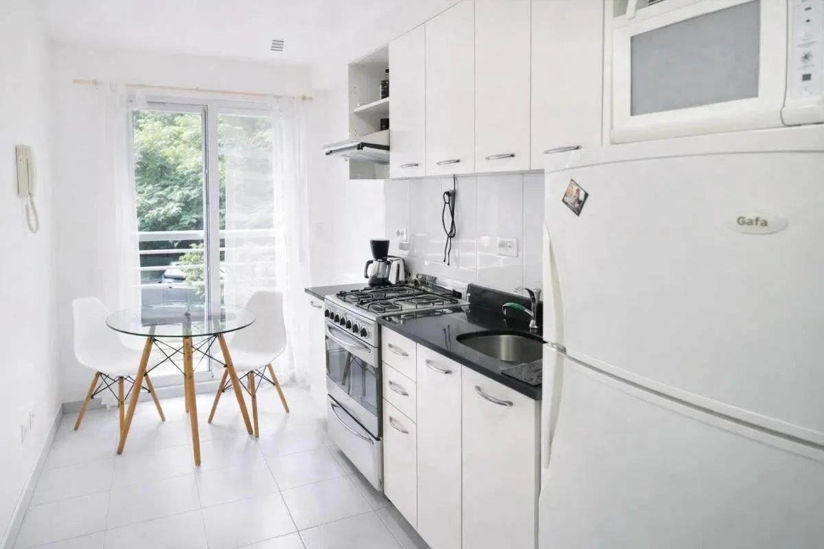 Квартира с двумя комнатами (1 спальня) площадью 60 m², из них 56 m² крытых, в Puerto Madero. Жилая зона с обеденной зоной выходит на балкон; в ней есть мебель, телевизор с тумбой и раскладной диван. В спальне — двуспальная кровать, тумбы, постельное бельё и большой шкаф; окна оснащены жалюзи и blackout-занавесками. Отдельная кухня с выходом на балкон оборудована холодильником, микроволновой печью, вытяжкой и включает посуду и кухонные принадлежности; есть встроенная прачечная. Полная ванная с ва