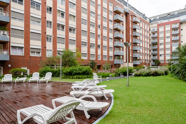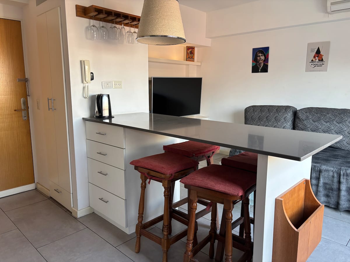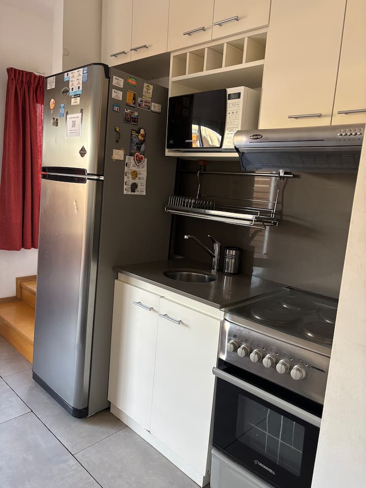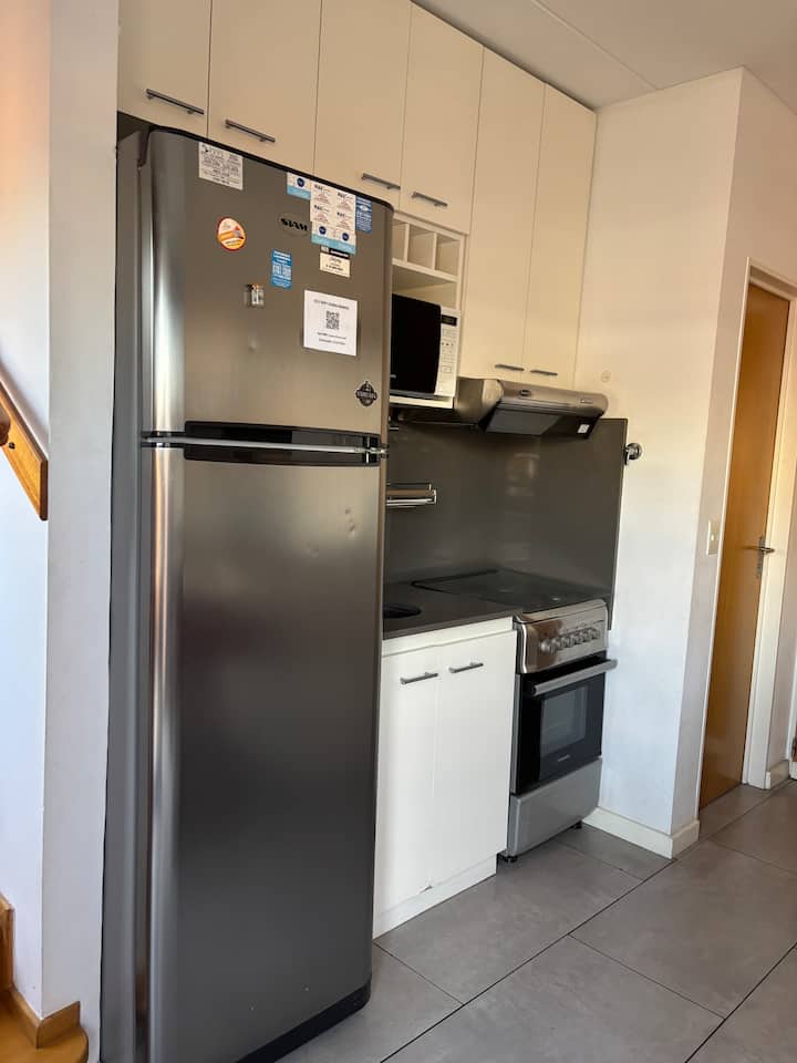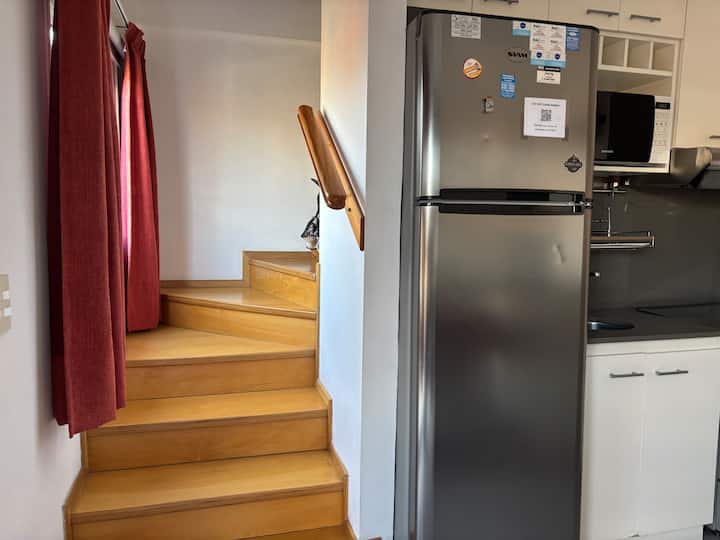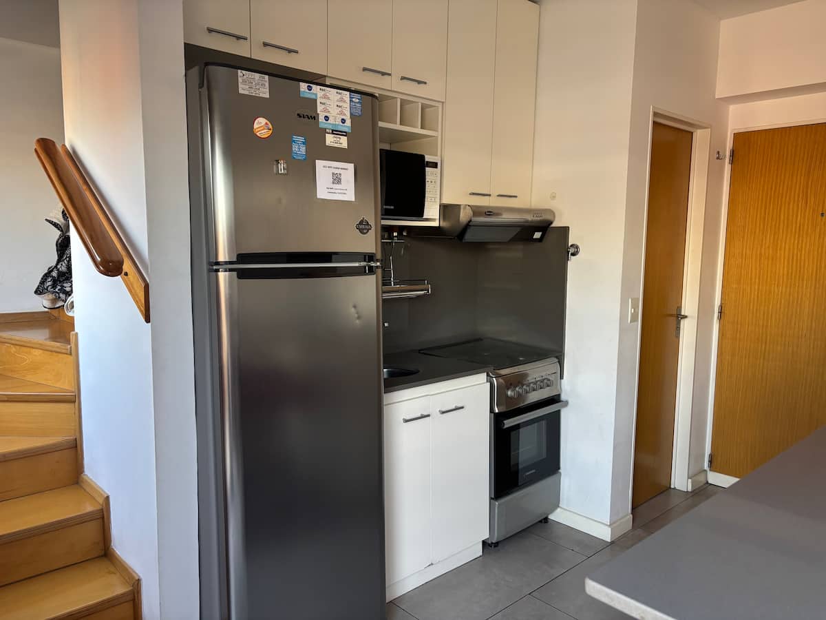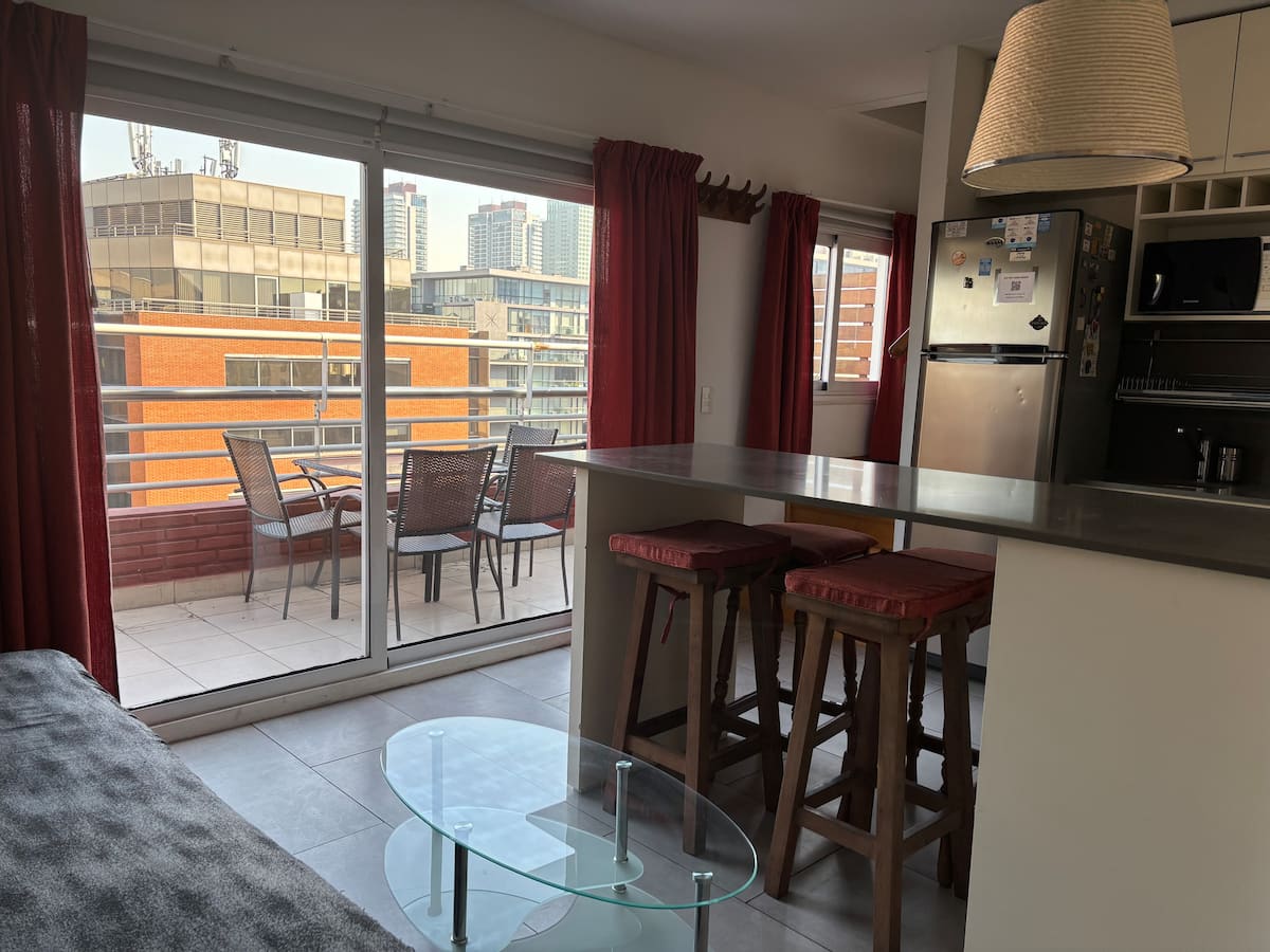Двухуровневая квартира в Puerto Madero, в районе улиц Juana Manso и Encarnación Ezcurra. Внизу: гостиная-столовая с раскладным диваном-кроватью, телевизор, интегрированная кухня с электрической духовкой, микроволновой печью, холодильником с морозильной камерой и стиральной машиной, гостевой туалет. Вверху: спальня с двуспальной кроватью, телевизор, ванная комната и рабочий стол. В квартире есть кондиционер в обеих зонах и быстрый Wi‑Fi; предоставлены кофе-машина и тостер. В здании есть открытый
