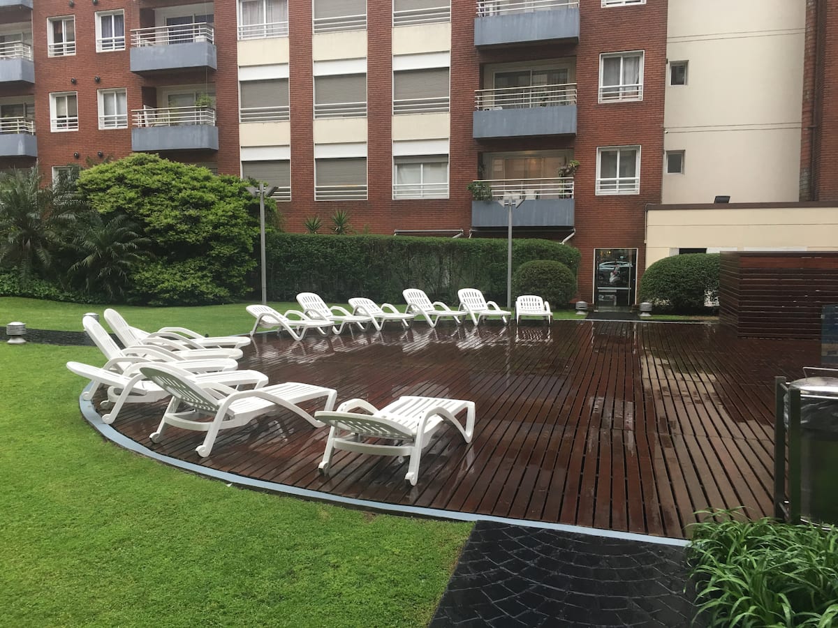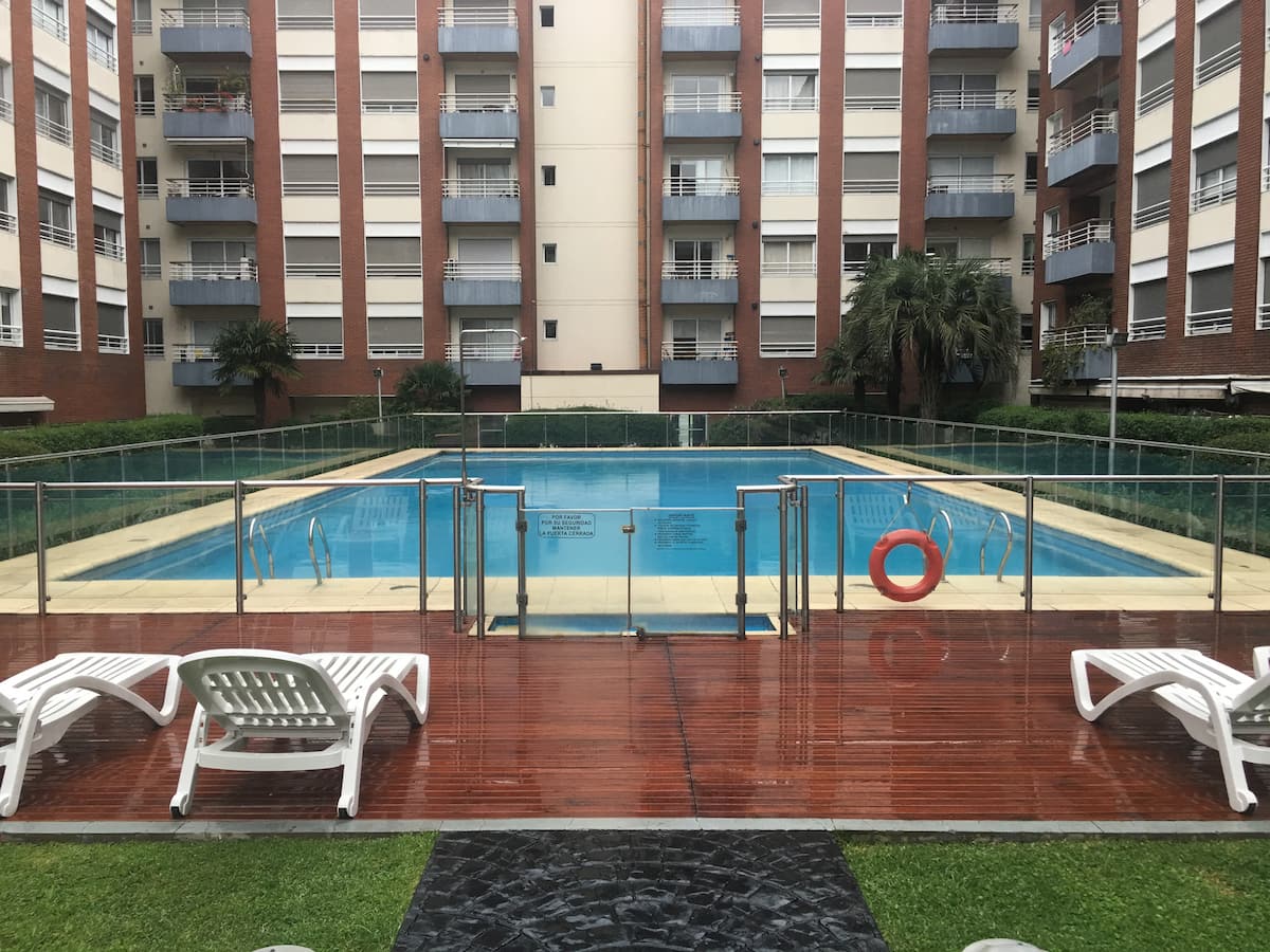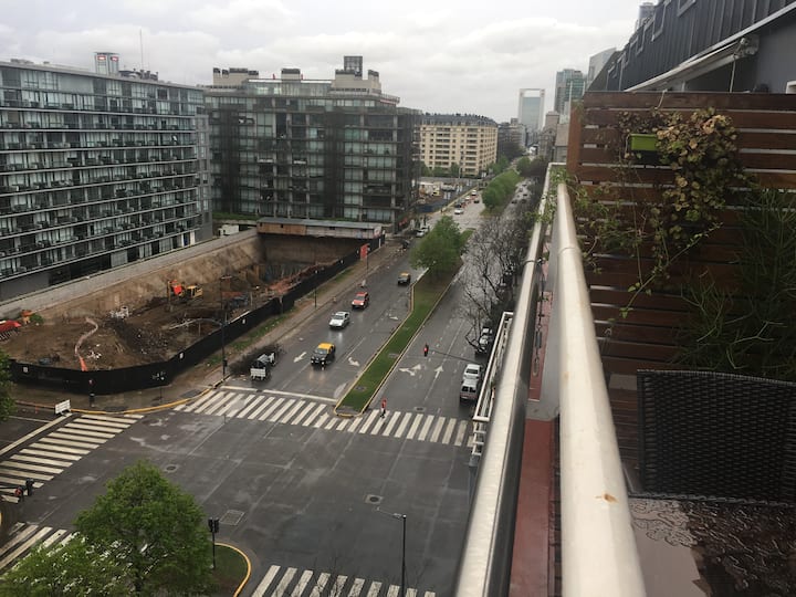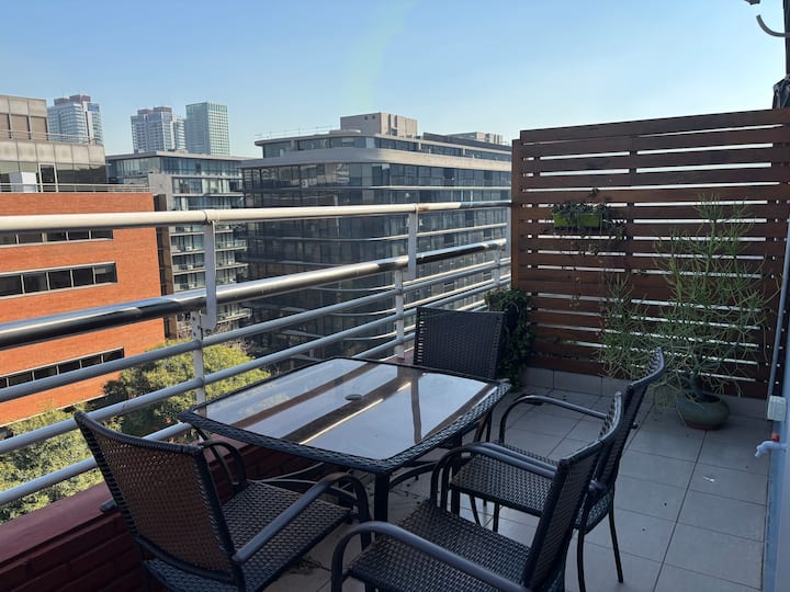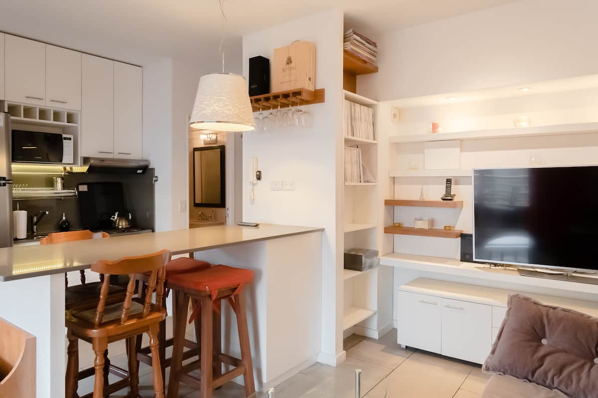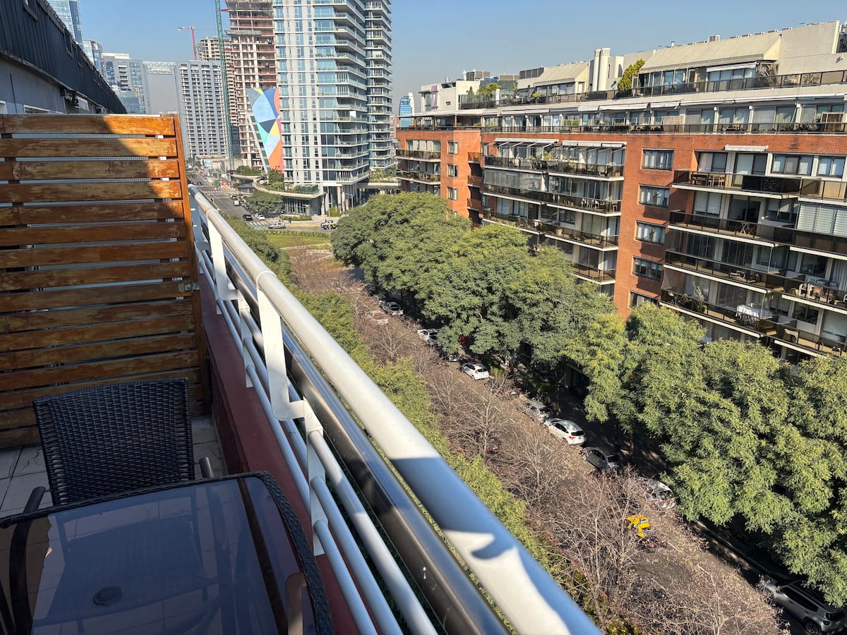 Двухуровневая квартира в Puerto Madero, в районе улиц Juana Manso и Encarnación Ezcurra. Внизу: гостиная-столовая с раскладным диваном-кроватью, телевизор, интегрированная кухня с электрической духовкой, микроволновой печью, холодильником с морозильной камерой и стиральной машиной, гостевой туалет. Вверху: спальня с двуспальной кроватью, телевизор, ванная комната и рабочий стол. В квартире есть кондиционер в обеих зонах и быстрый Wi‑Fi; предоставлены кофе-машина и тостер. В здании есть открытый