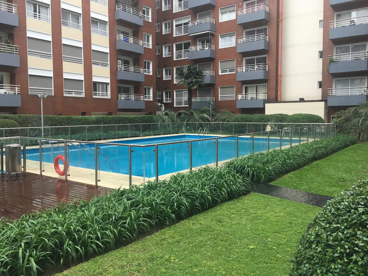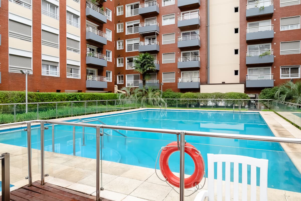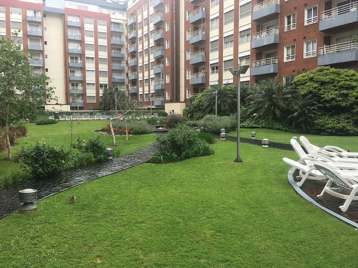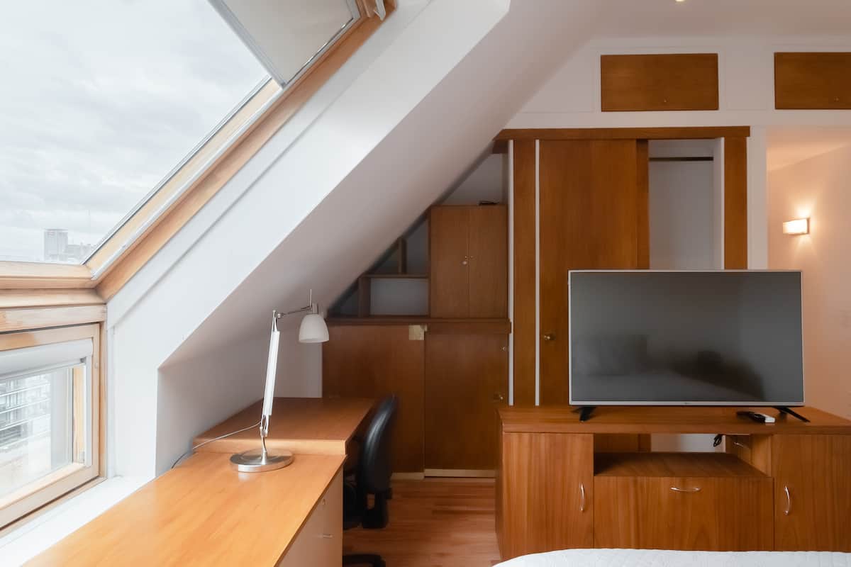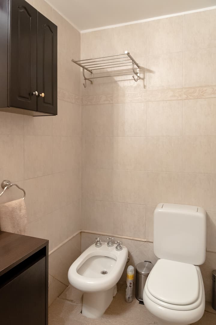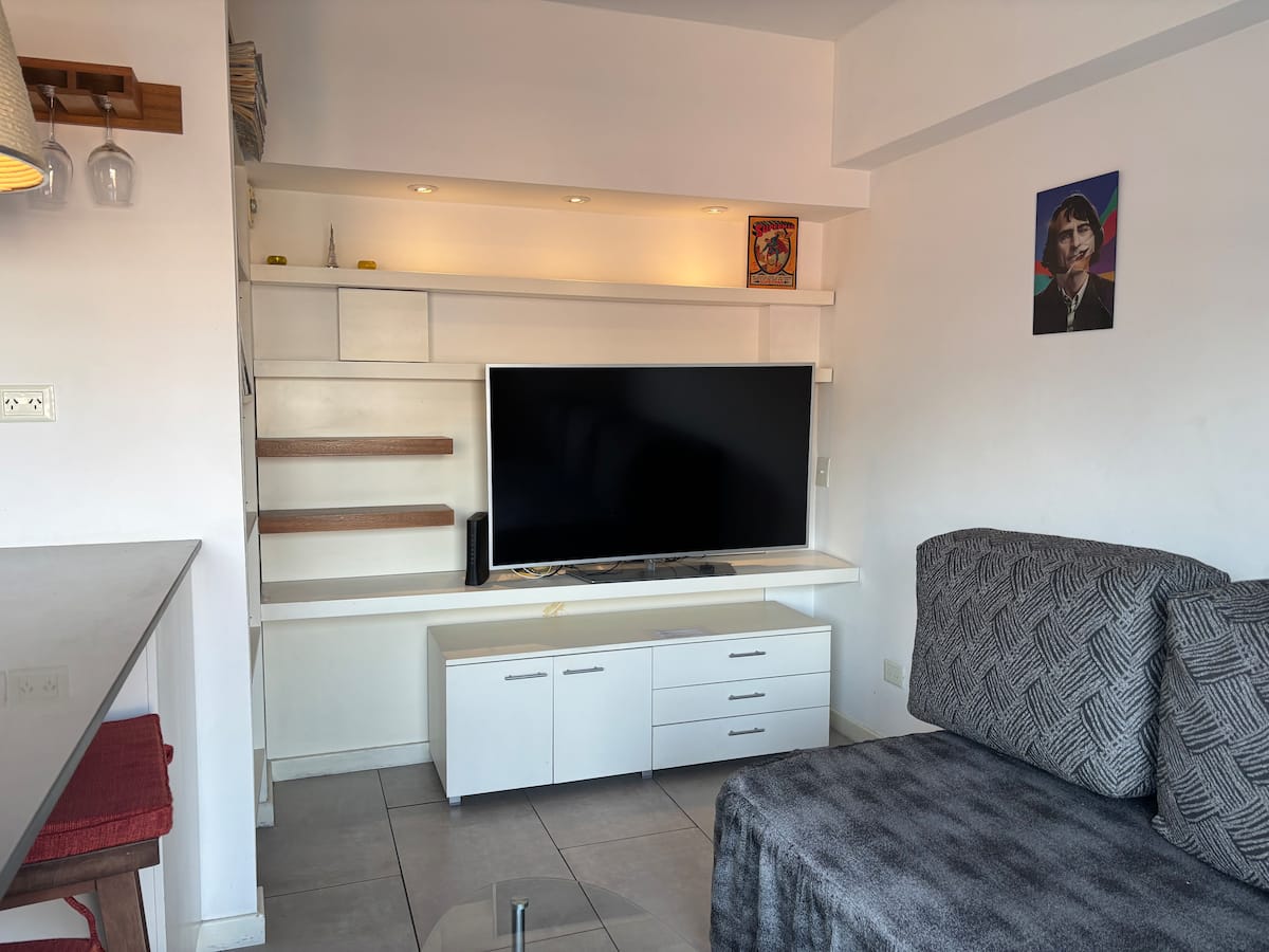 Двухуровневая квартира в Puerto Madero, в районе улиц Juana Manso и Encarnación Ezcurra. Внизу: гостиная-столовая с раскладным диваном-кроватью, телевизор, интегрированная кухня с электрической духовкой, микроволновой печью, холодильником с морозильной камерой и стиральной машиной, гостевой туалет. Вверху: спальня с двуспальной кроватью, телевизор, ванная комната и рабочий стол. В квартире есть кондиционер в обеих зонах и быстрый Wi‑Fi; предоставлены кофе-машина и тостер. В здании есть открытый