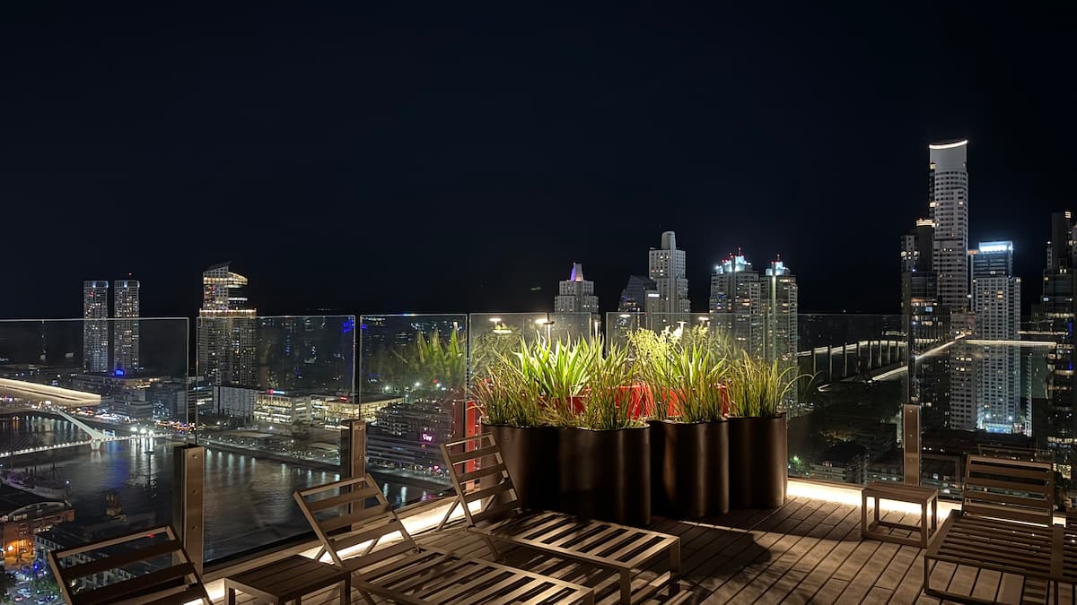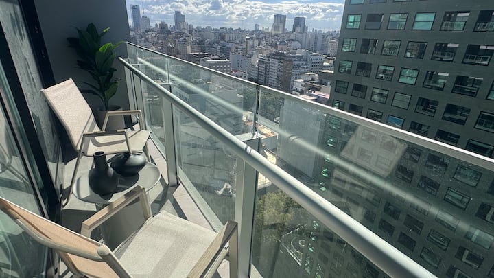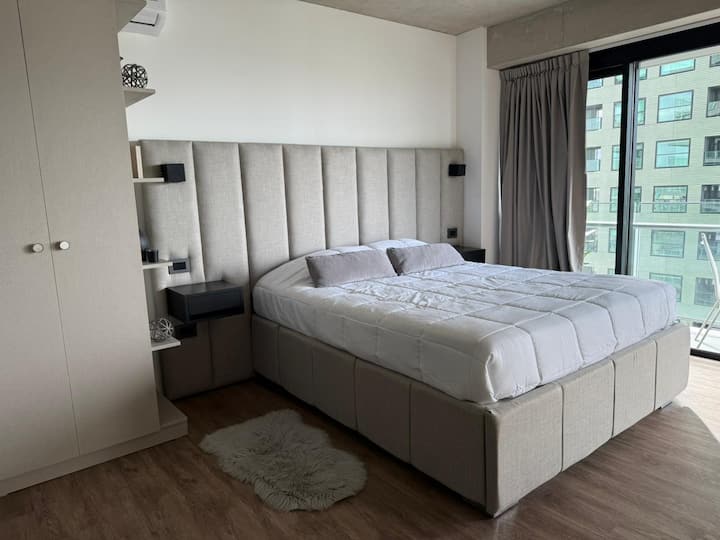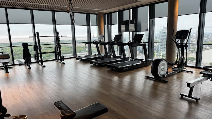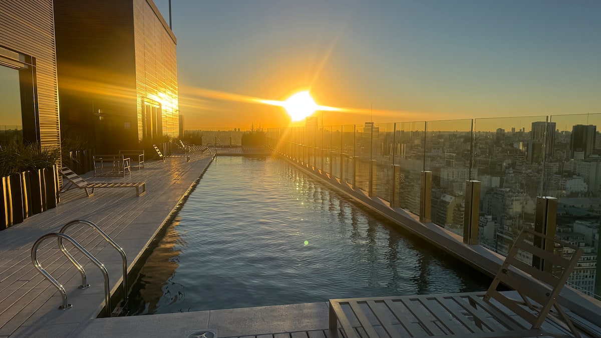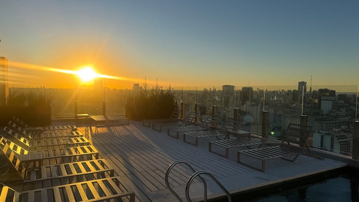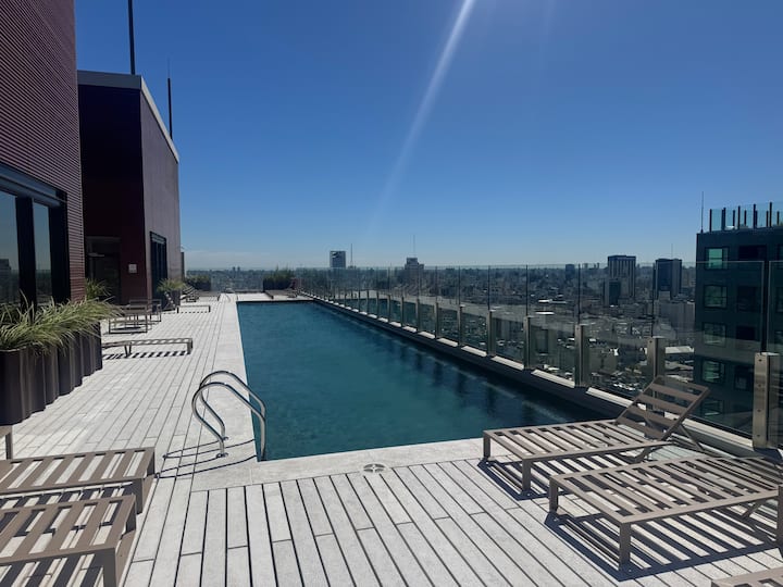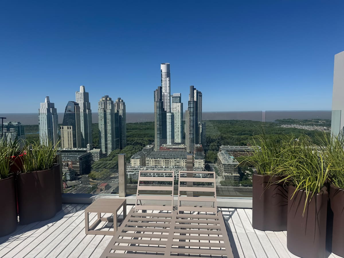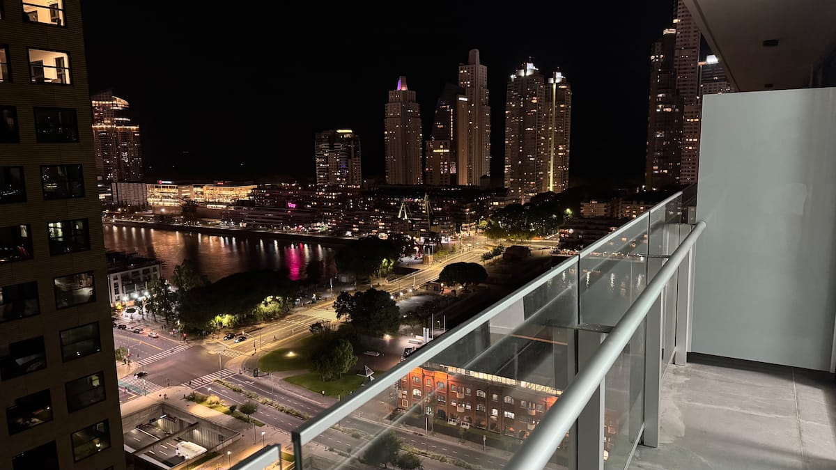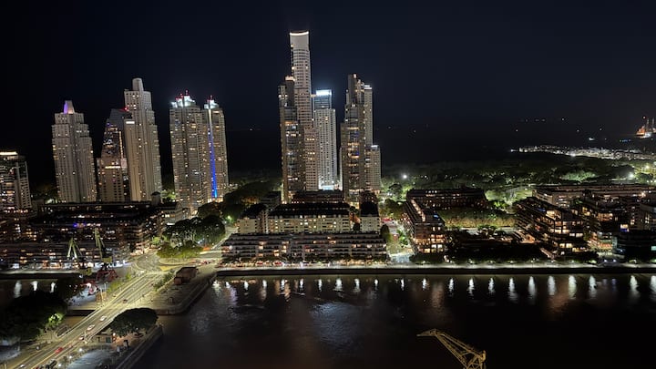 Квартира-студия на 23-м этаже в здании Quartier del Bajo в Puerto Madero. Окна выходят на реку и город; в здании работает круглосуточная охрана. На 35-м и 36-м этажах предусмотрены панорамные зоны с тренажёрным залом, спа с джакузи, сухой и паровой сауной, открытым бассейном и террасой на крыше с зоной гриля. В нескольких минутах находится historic center, рядом — Puente de la Mujer.