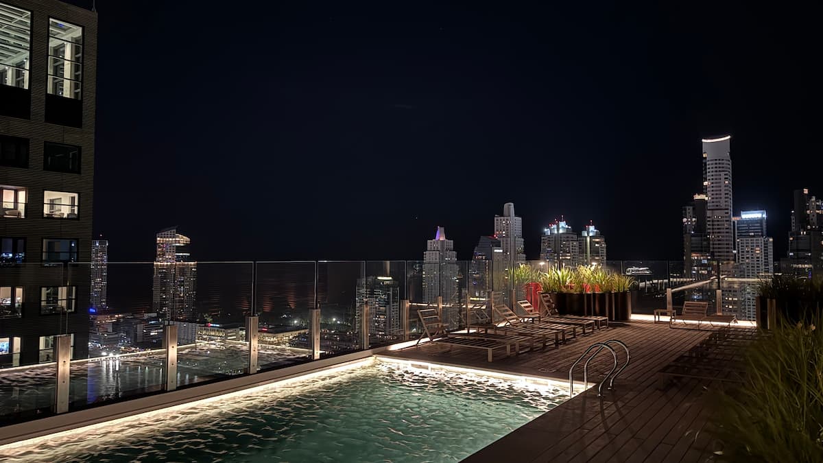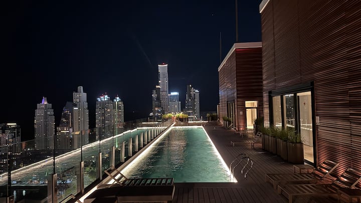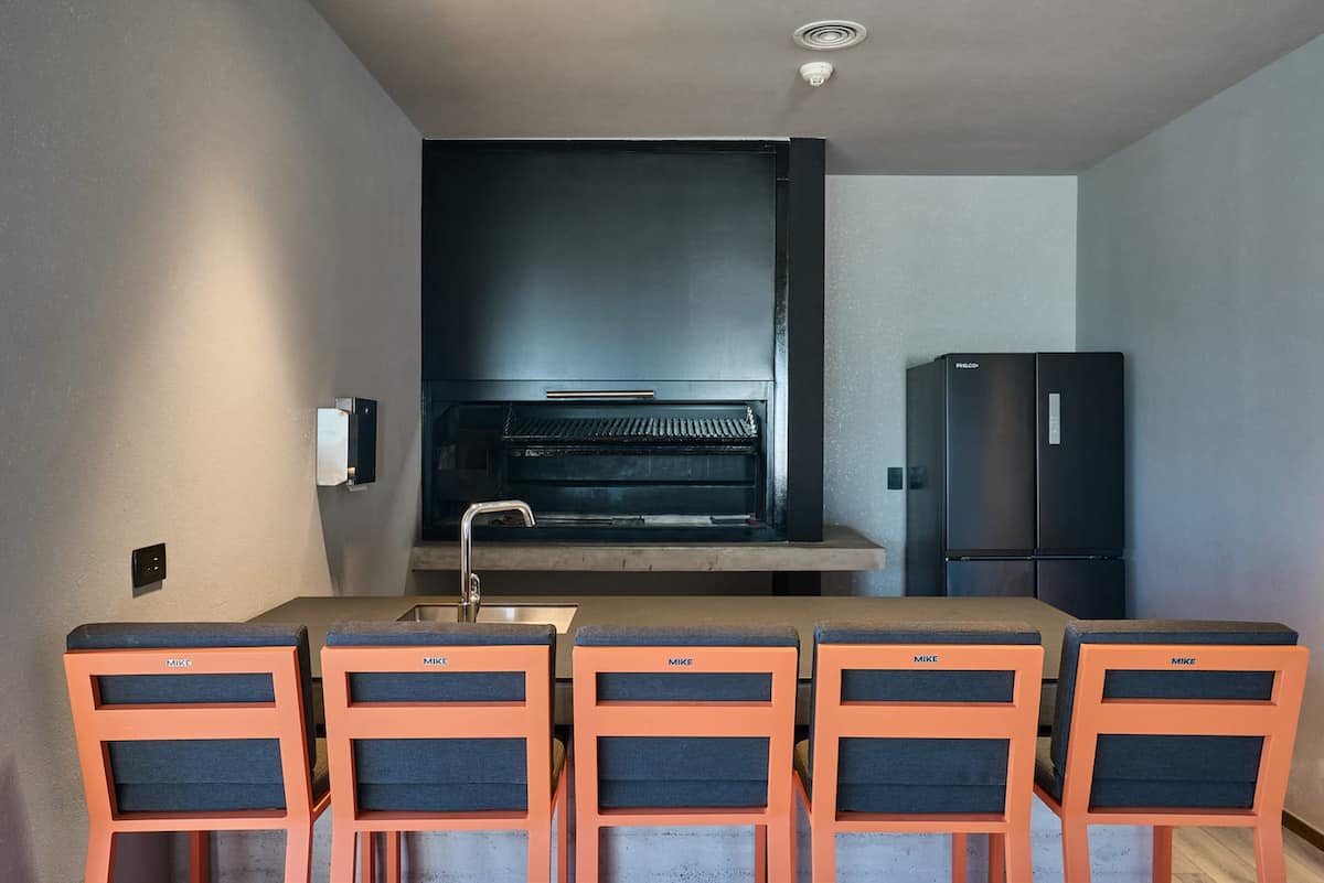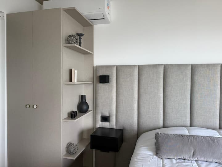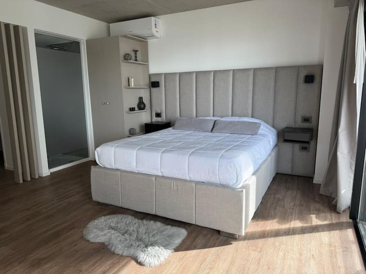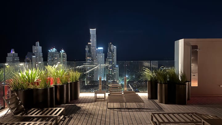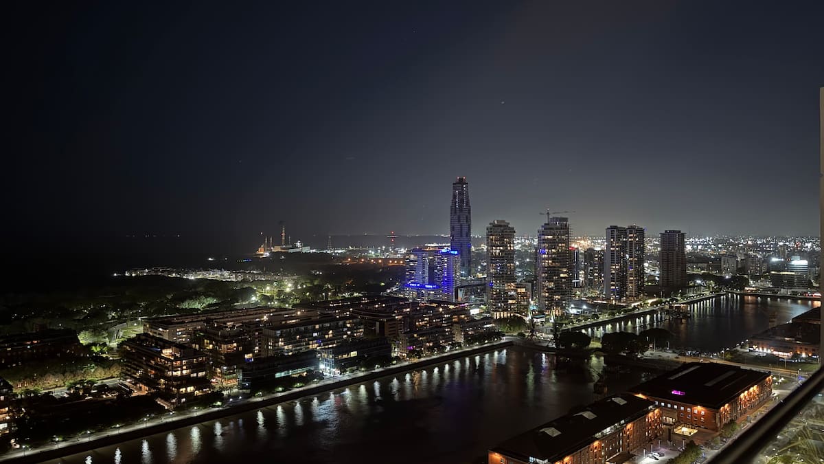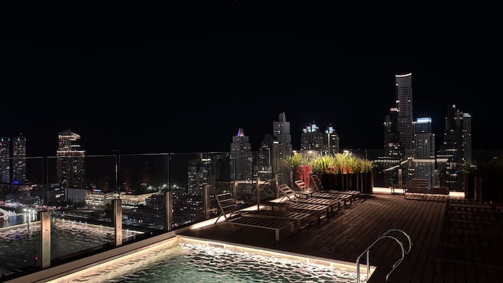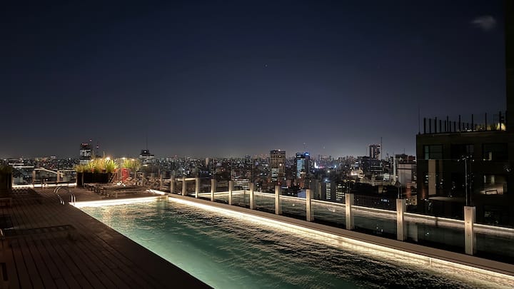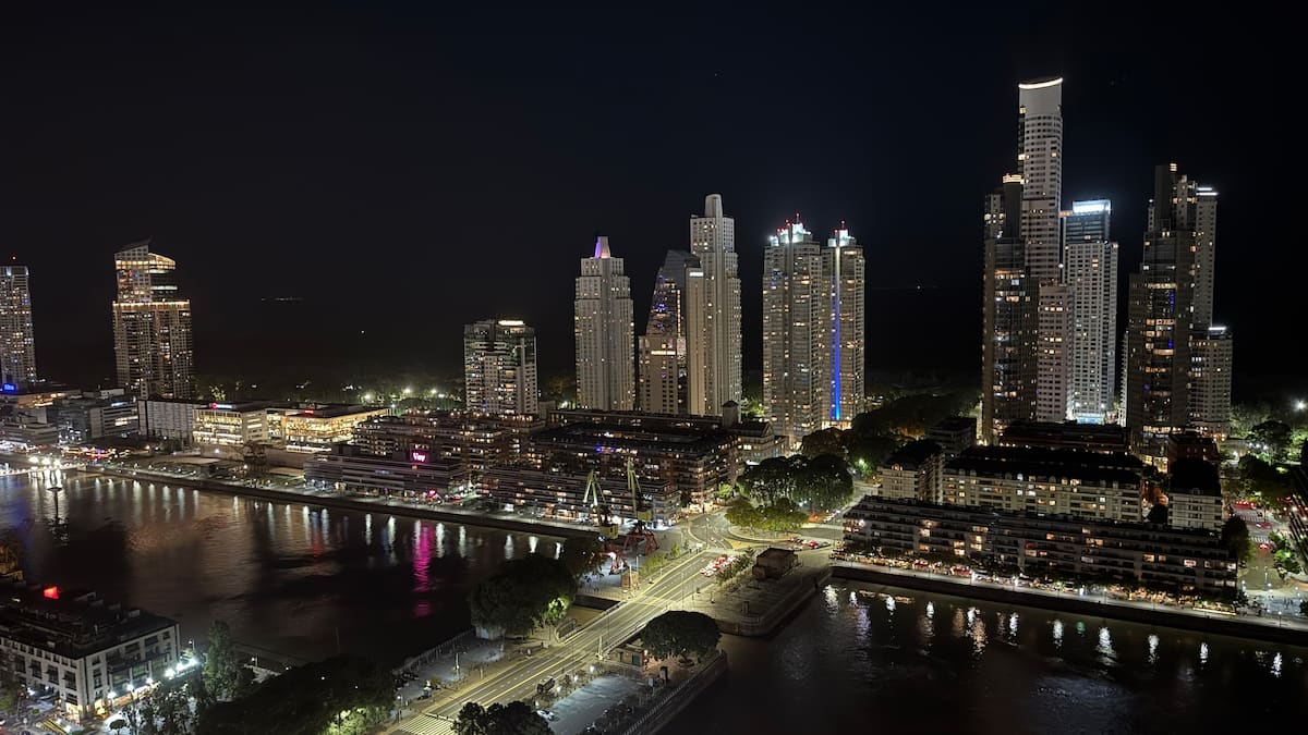 Квартира-студия на 23-м этаже в здании Quartier del Bajo в Puerto Madero. Окна выходят на реку и город; в здании работает круглосуточная охрана. На 35-м и 36-м этажах предусмотрены панорамные зоны с тренажёрным залом, спа с джакузи, сухой и паровой сауной, открытым бассейном и террасой на крыше с зоной гриля. В нескольких минутах находится historic center, рядом — Puente de la Mujer.