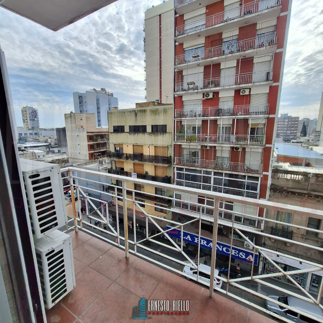 Квартира в Quilmes Centro в формате 2 ambientes на 4-м этаже, окна на улицу и вид на север. С мебелью не указано; в описании указаны кондиционер, отопление и газовая плита. В гостиной-столовой установлен кондиционер, рядом балкон с сеткой. Кухня интегрирована, есть кухонная плита на газе и водонагреватель (calefón), предусмотрены столешница и нижние шкафы; отдельный сектор для прачечной. Спальня с кондиционером и шкафом. Ванная комната с ванной. В аренду включены (если не указано иное) коммуналь