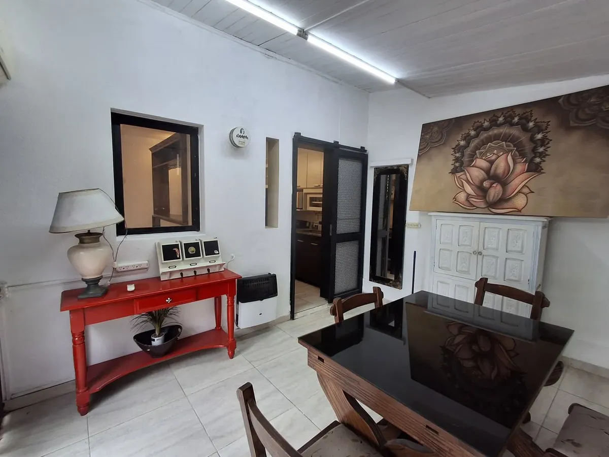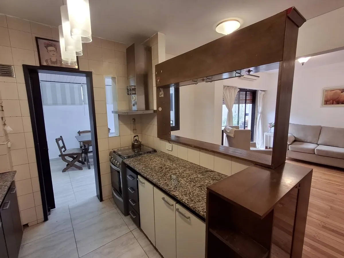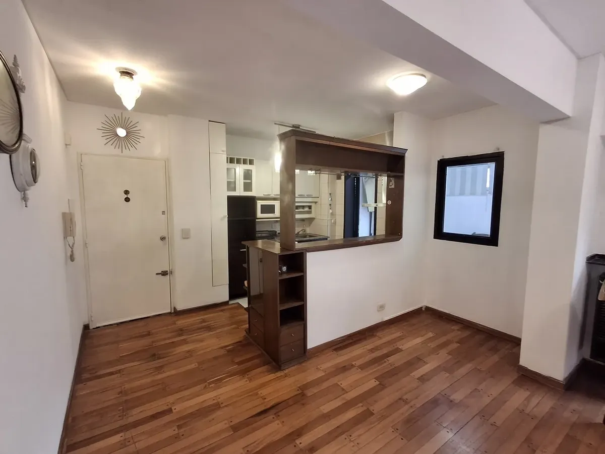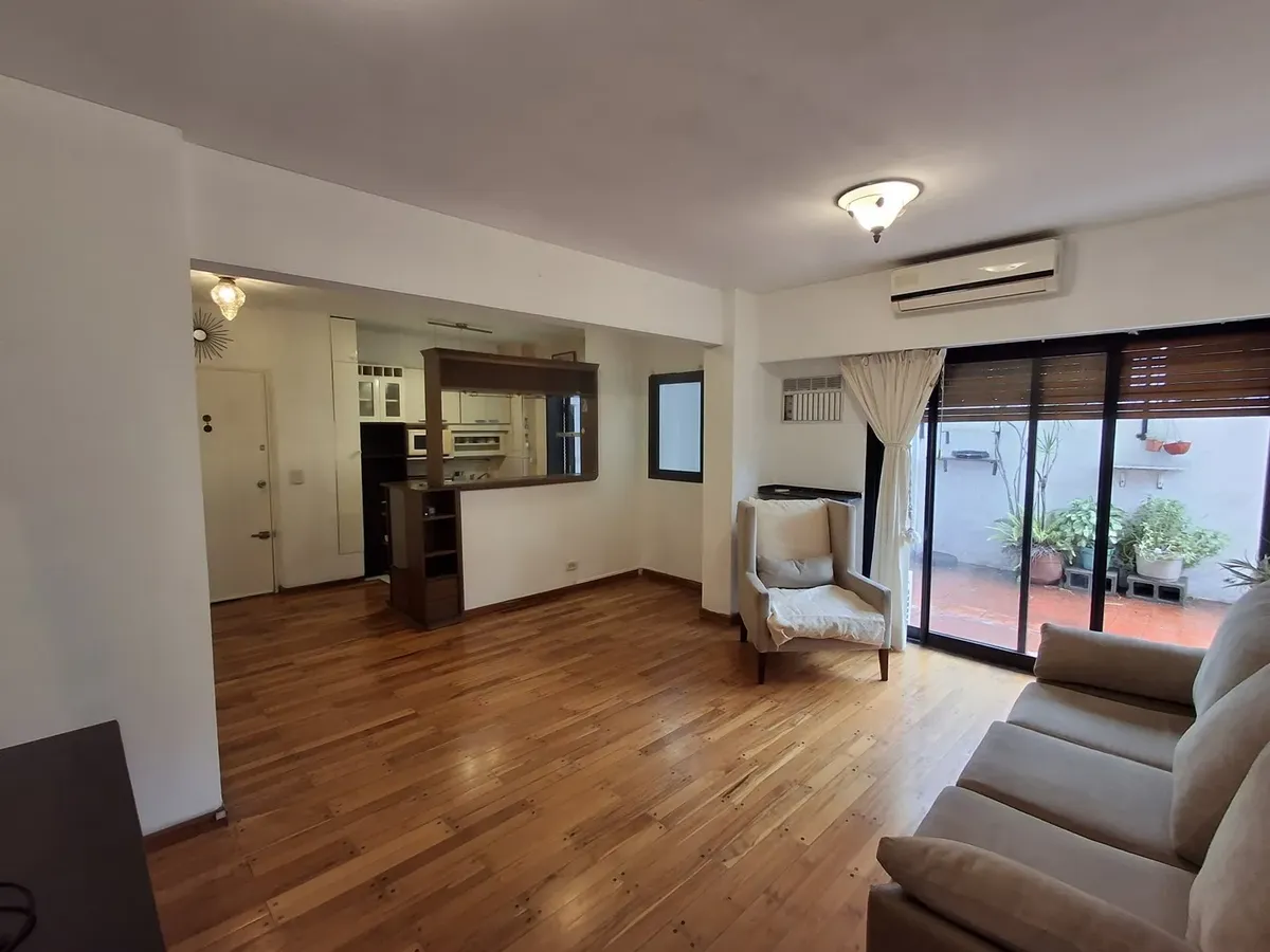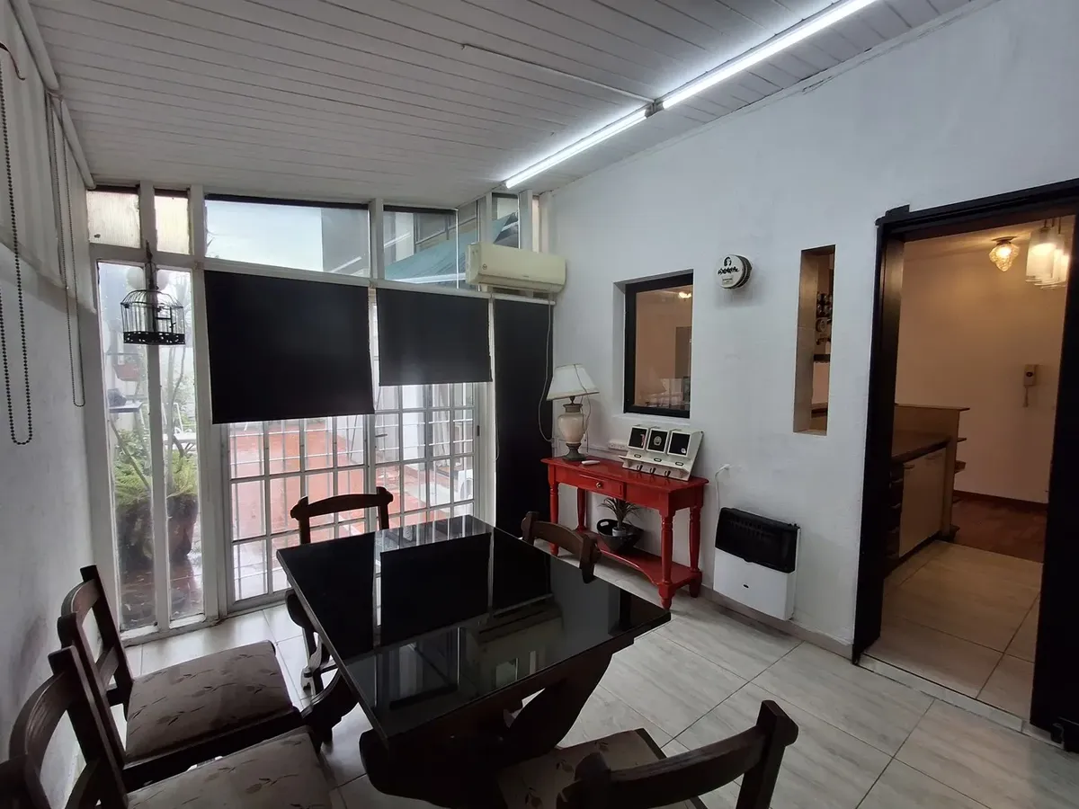 Квартира с 2 комнатами и жилой зоной на полудополнение (2 ambientes y medio) в Quilmes. Площадь не указана; планировка включает гостиную-столовую с кухней полусоединённого типа. Есть обеденная зона на каждый день во внутреннем застеклённом и крытом патио с кондиционером и камином. Большой балкон в виде террасы, полная ванная с ванной, после ремонта. В спальне встроенный шкаф и выход в патио. Квартира почти полностью с мебелью. Арендная плата не включает коммунальные платежи здания (expensas) и д