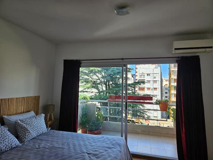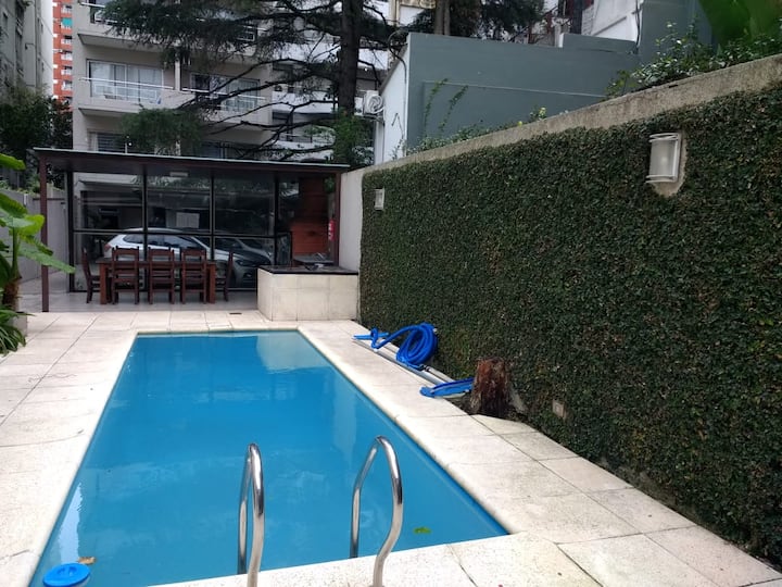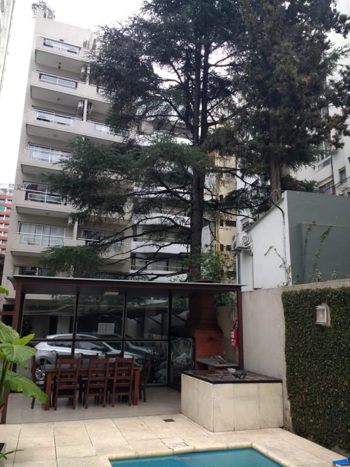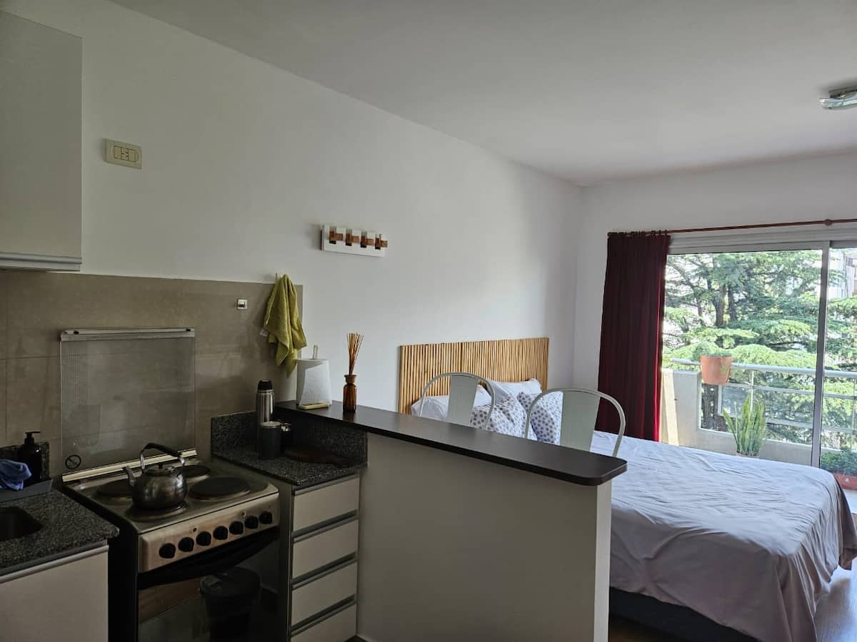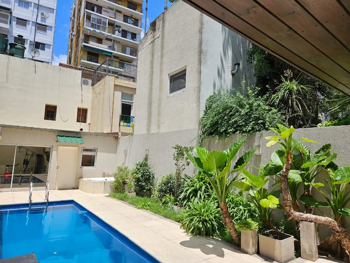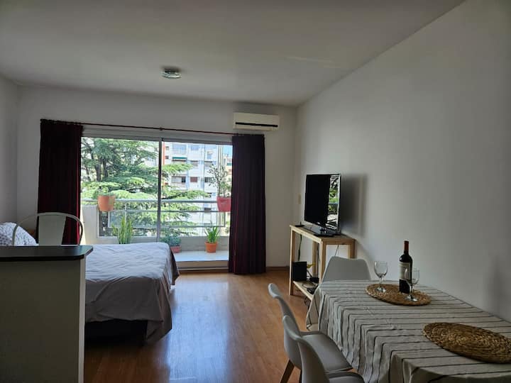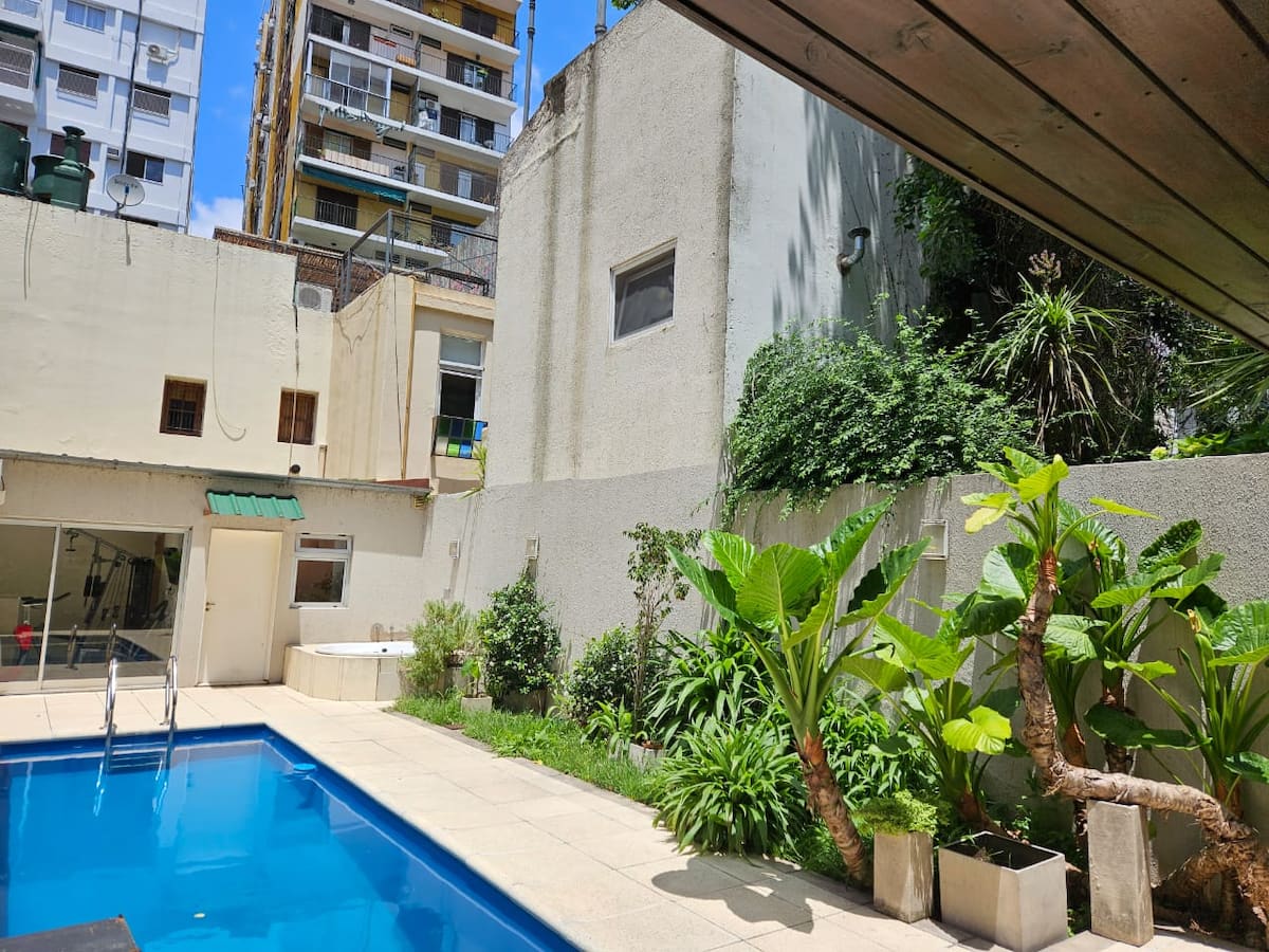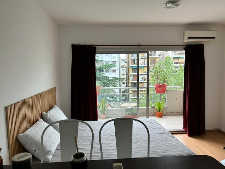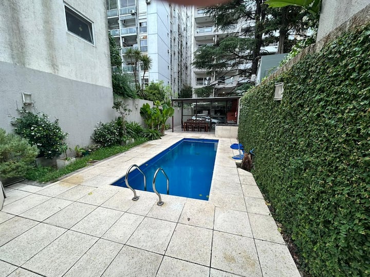Квартира-студия в Recoleta, рассчитана на проживание 2 человек. Общая площадь и этаж не указаны. Есть балкон и внутренний двор с бассейном. Также упоминаются близость к Shopping Alto Palermo и музеям и возможность прогулок в зелёных зонах.