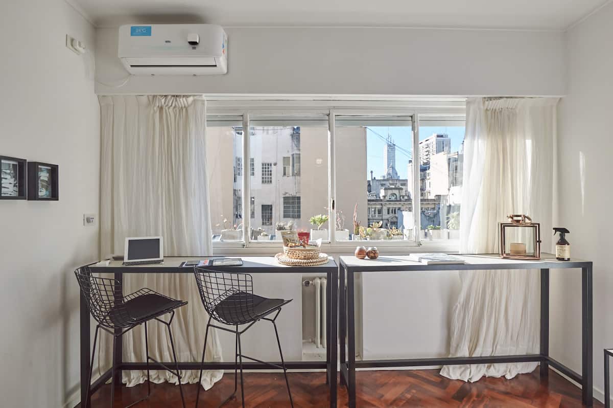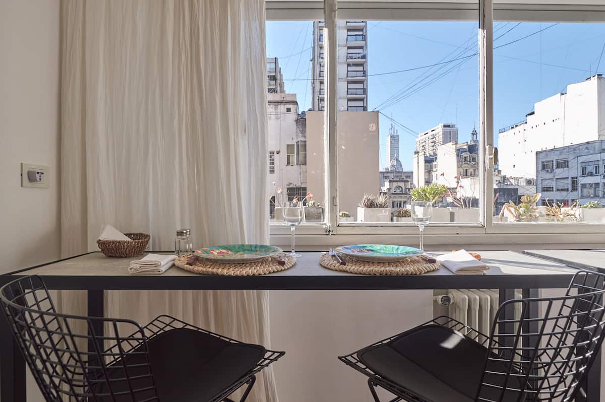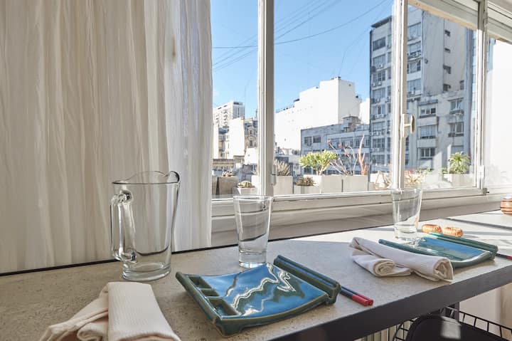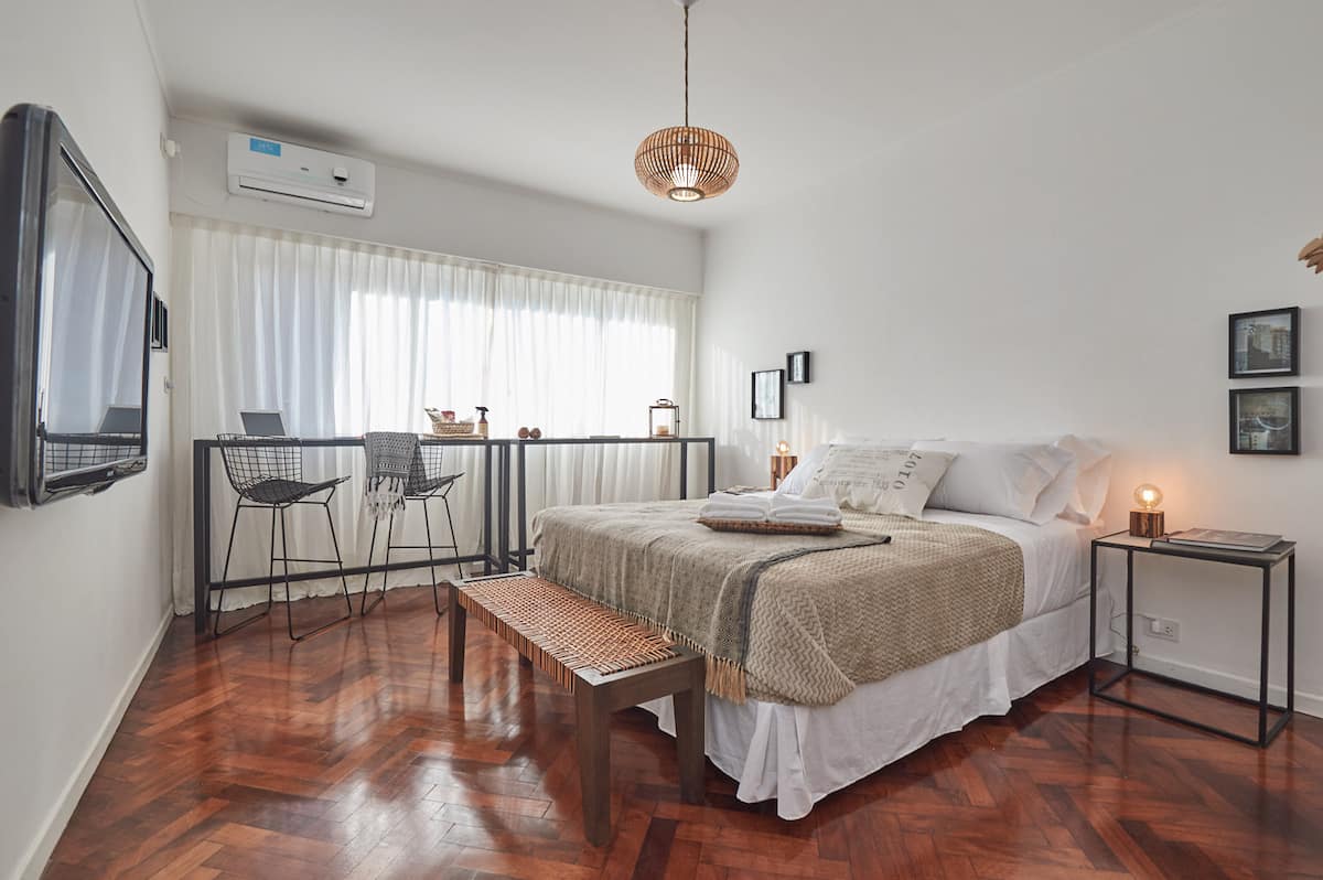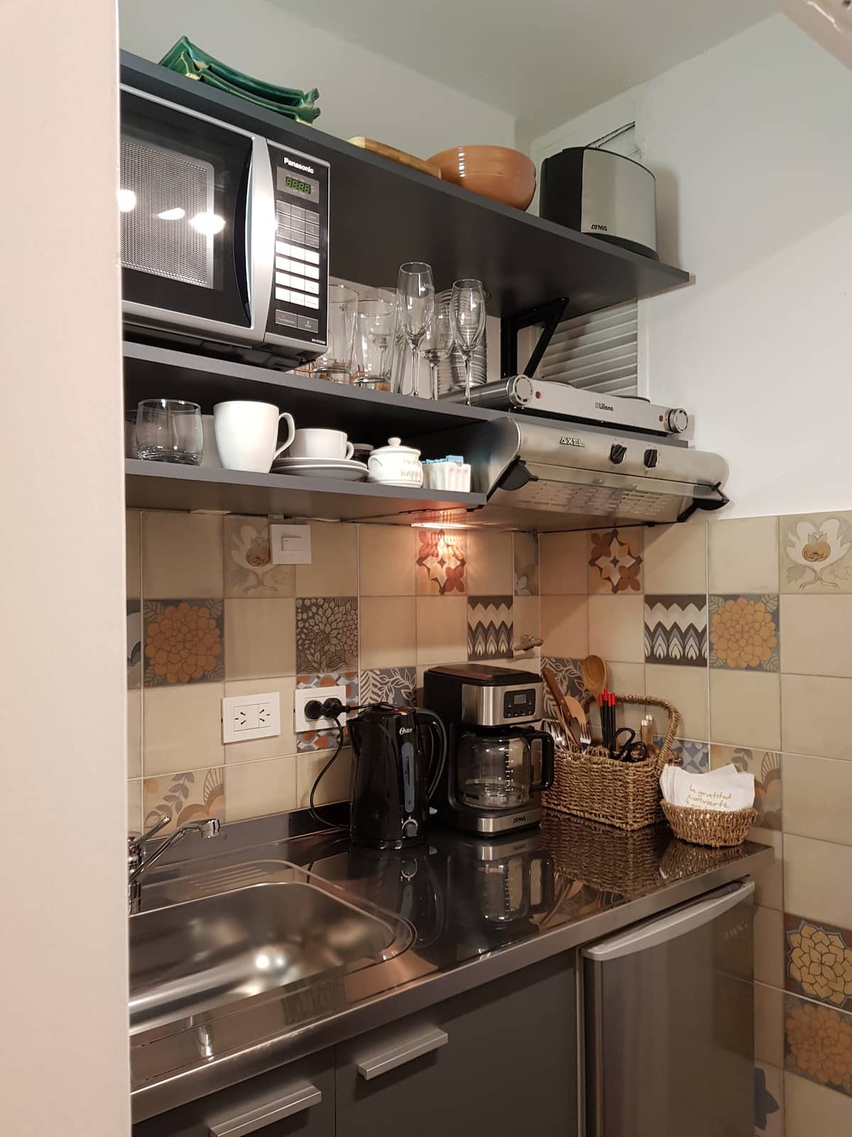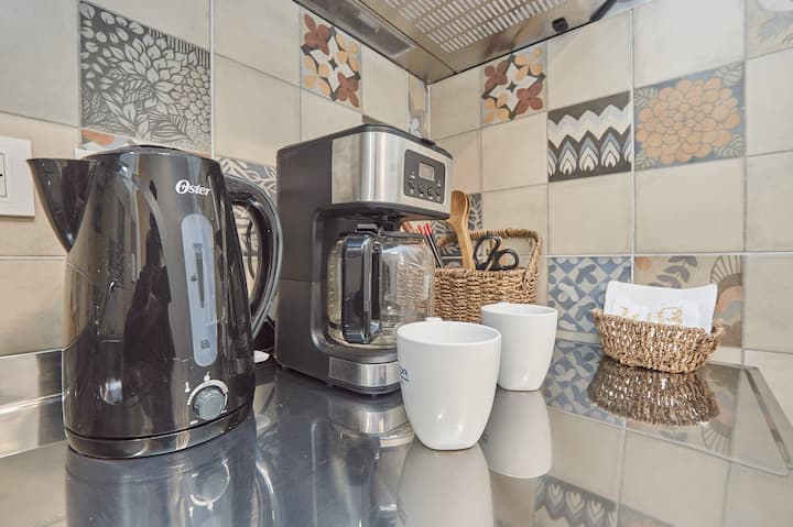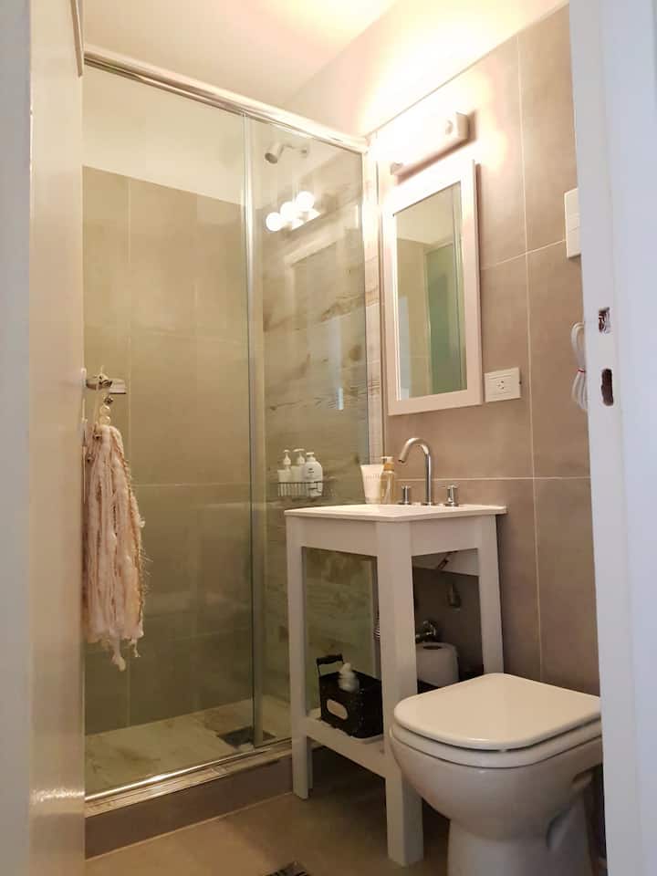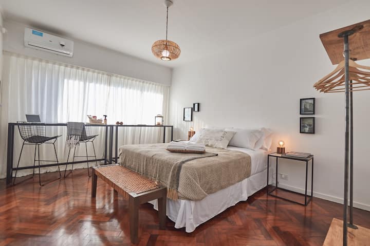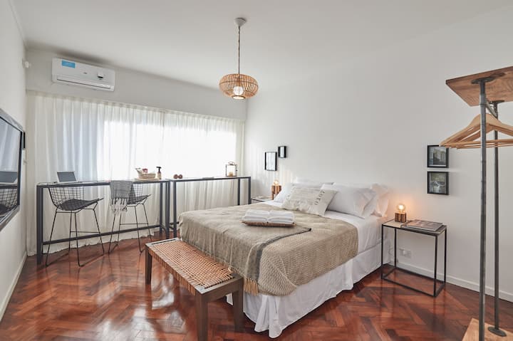 Квартира-студия в Retiro, после обновления. В помещении установлены телевизор, рабочая зона с компьютерным столом и подключением к электросети, доступен Wi‑Fi 100 Mb. В студии есть 1 двуспальная кровать Queen и 1 ванная комната с душем. Мини-кухня укомплектована холодильником, микроволновой печью, электрическим грилем, тостером, электрическим чайником и кофеваркой.