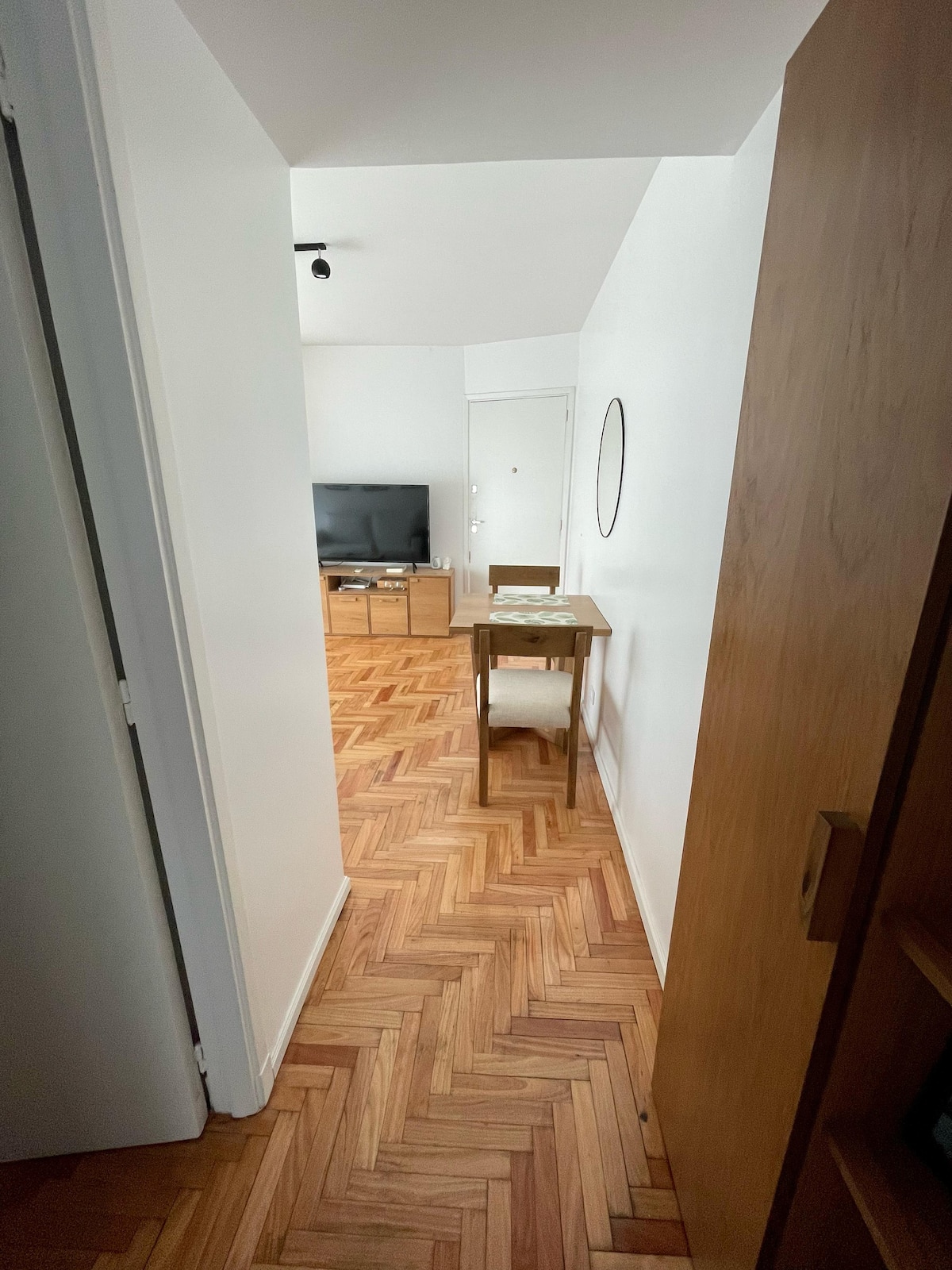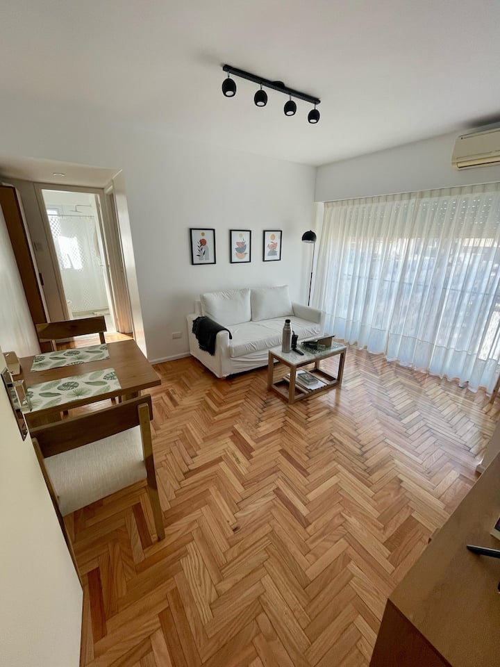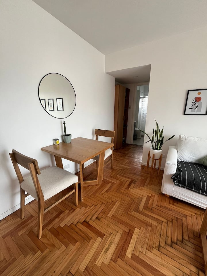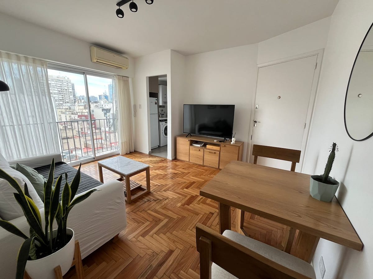 Квартира в Retiro с 2 комнатами. В объявлении указана яркая обстановка и размещение для краткосрочного проживания, а также для длительных поездок. В квартире есть стиральная машина (Lavarropas). Сообщается о близости двух станций метро линий C и E, а также о расположении рядом с Plaza San Martín.