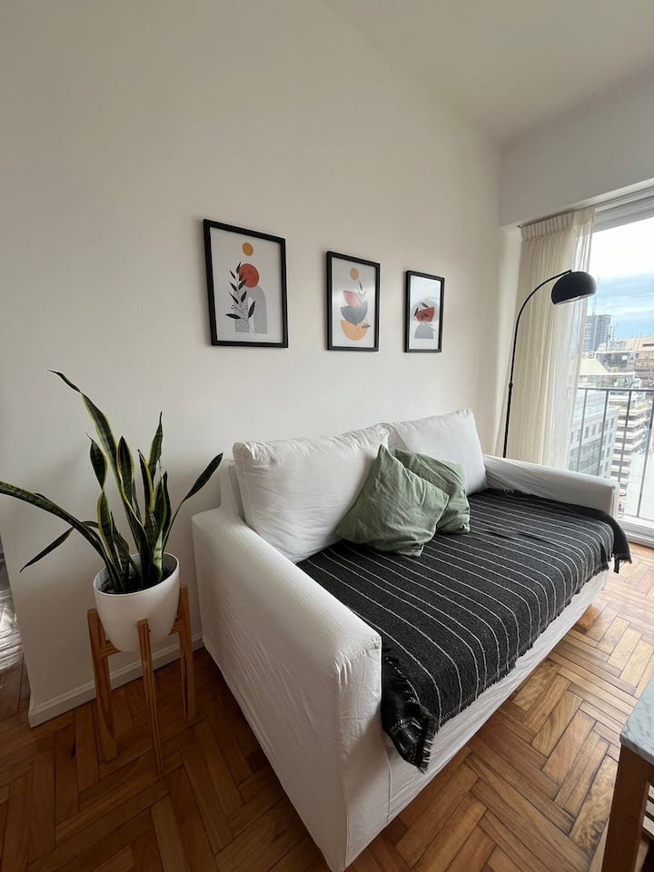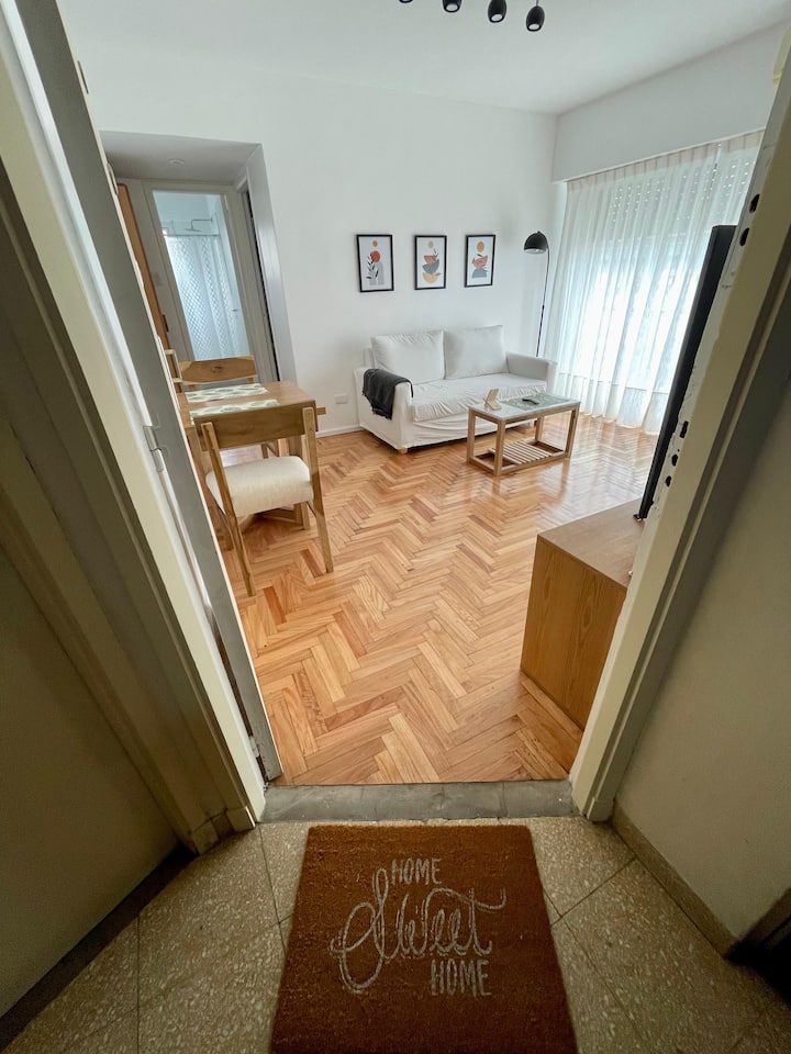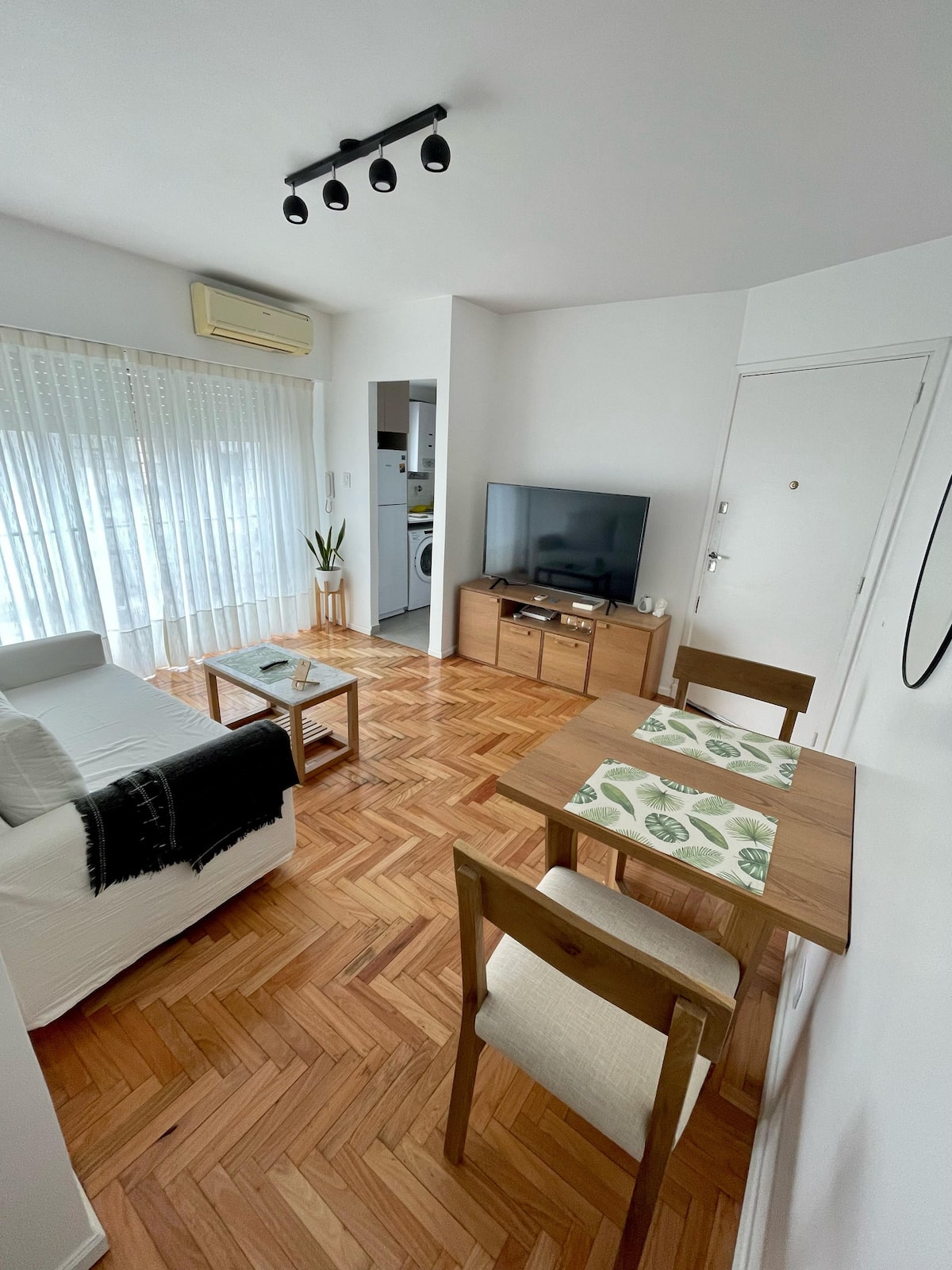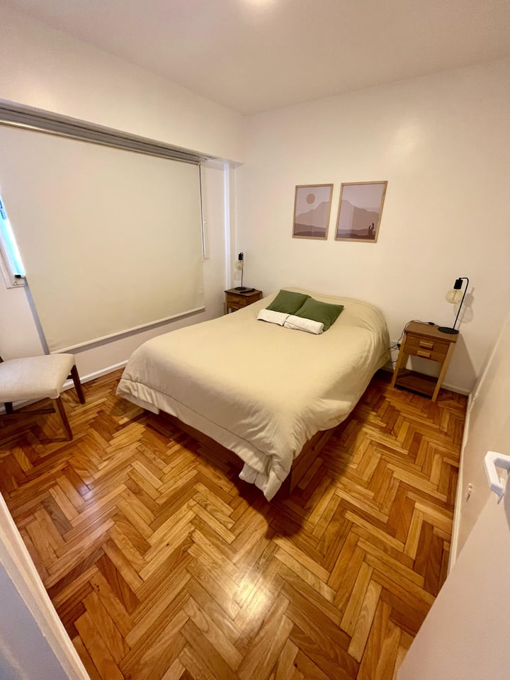 Квартира в Retiro с 2 комнатами. В объявлении указана яркая обстановка и размещение для краткосрочного проживания, а также для длительных поездок. В квартире есть стиральная машина (Lavarropas). Сообщается о близости двух станций метро линий C и E, а также о расположении рядом с Plaza San Martín.