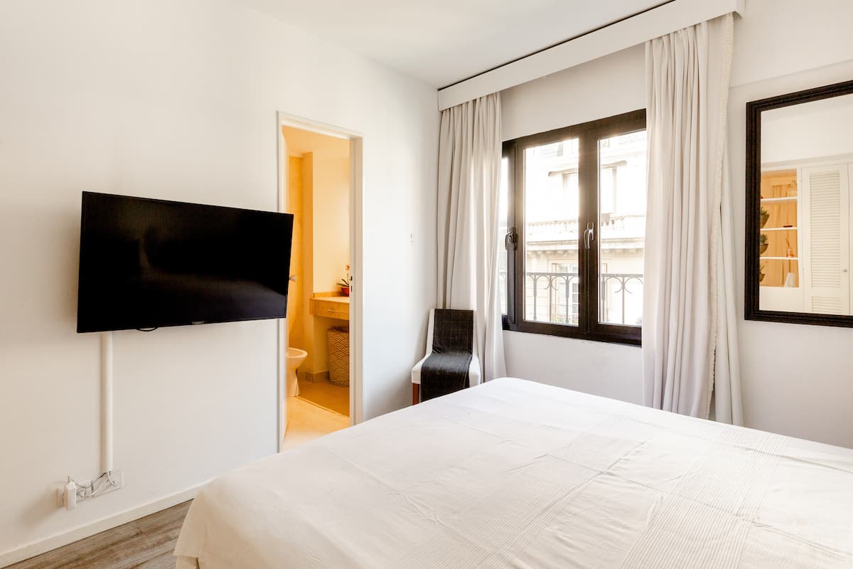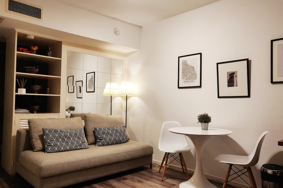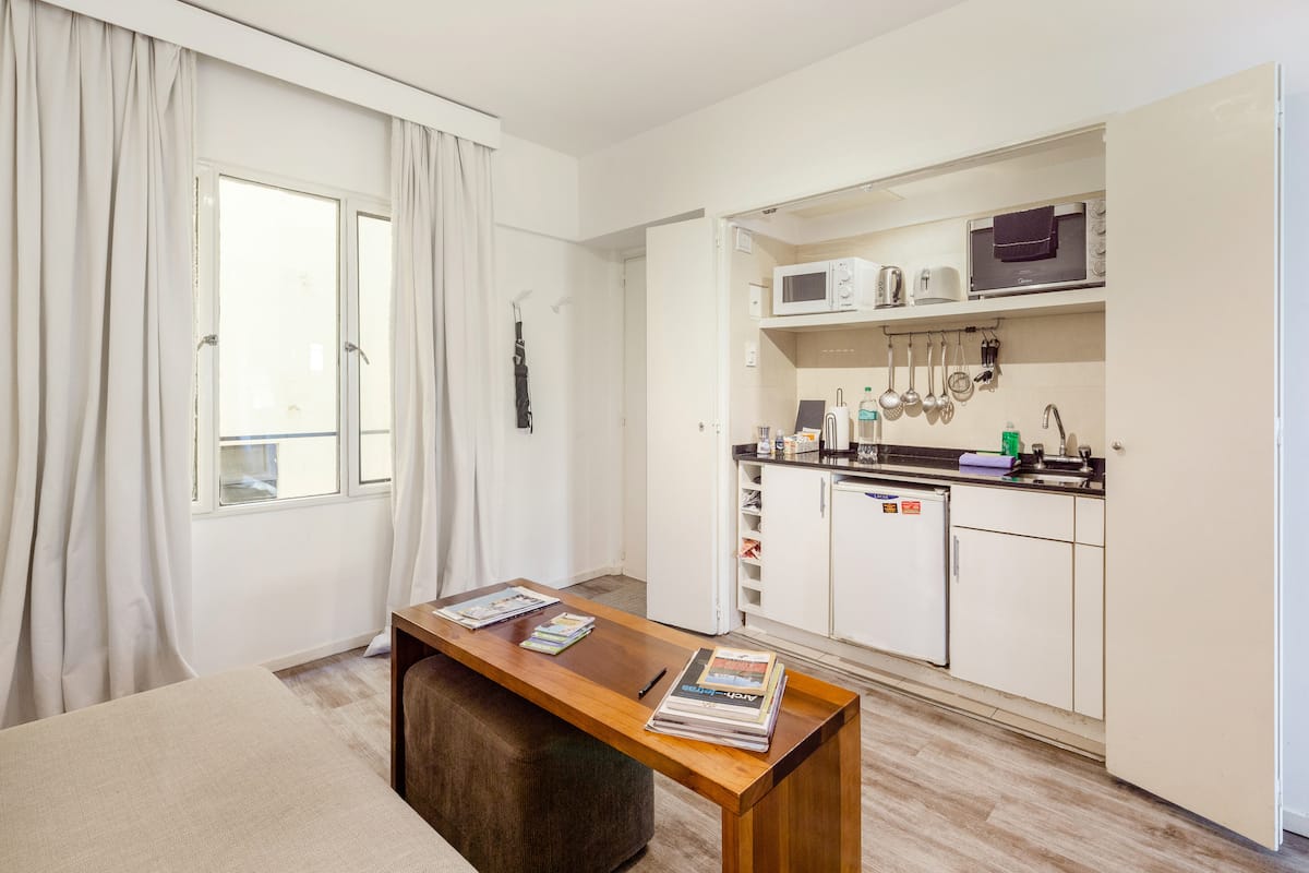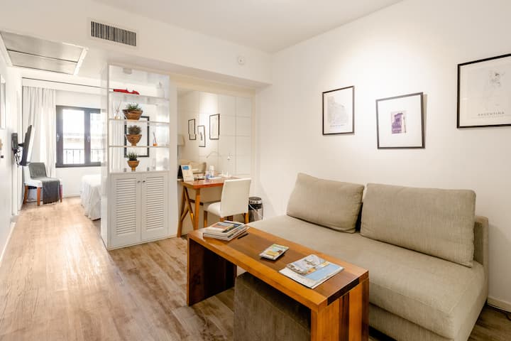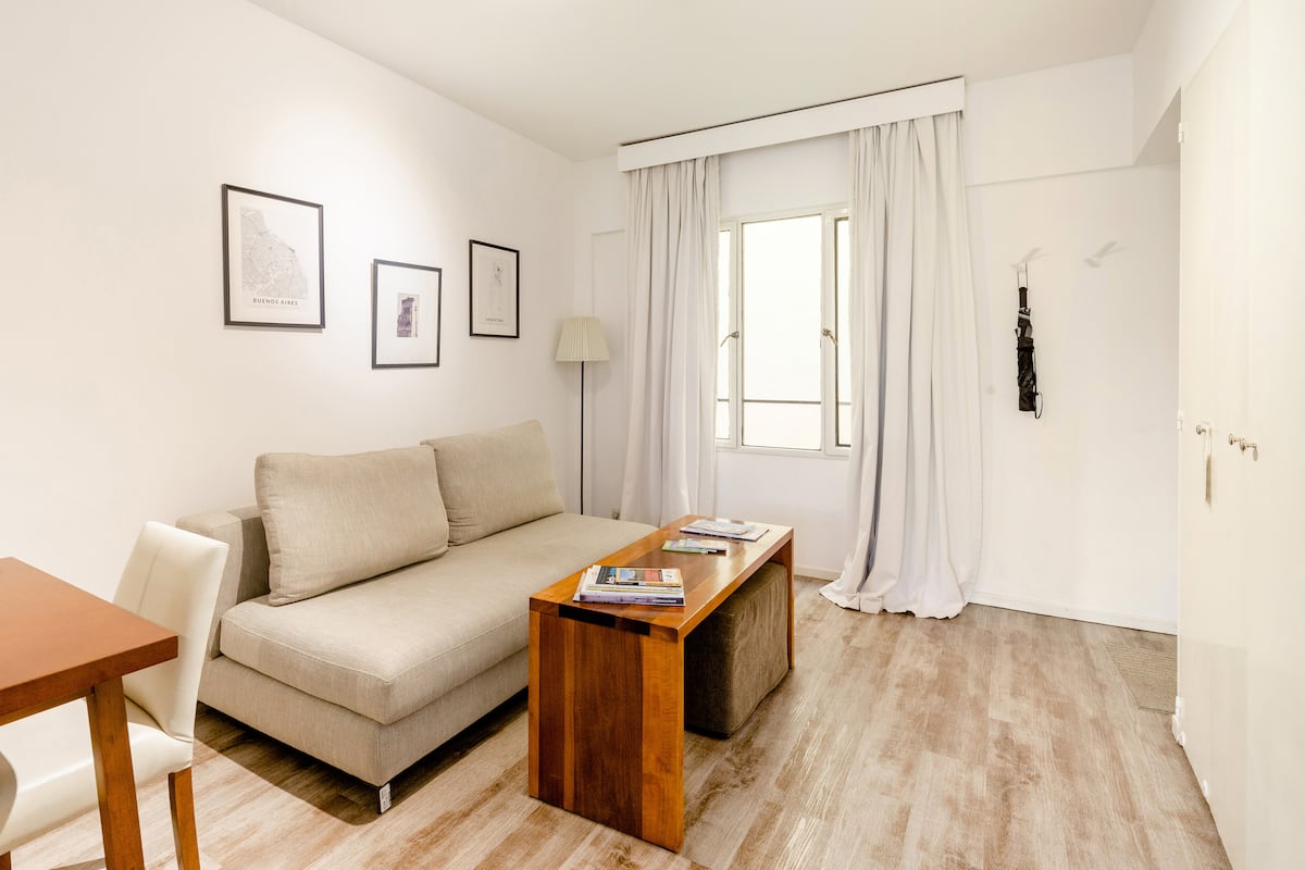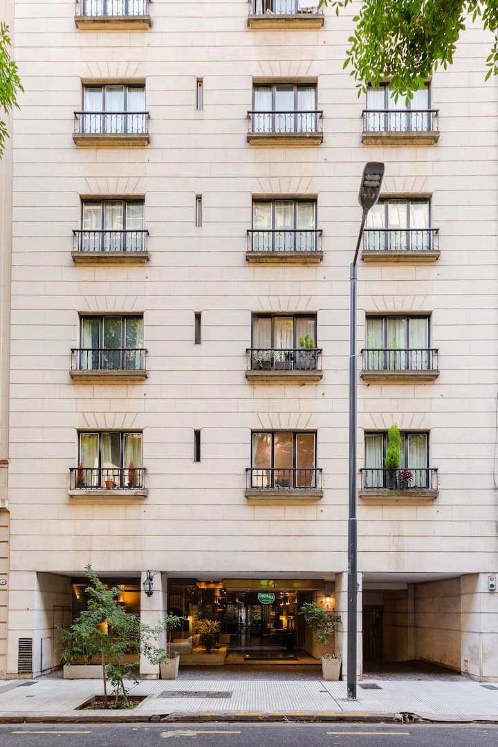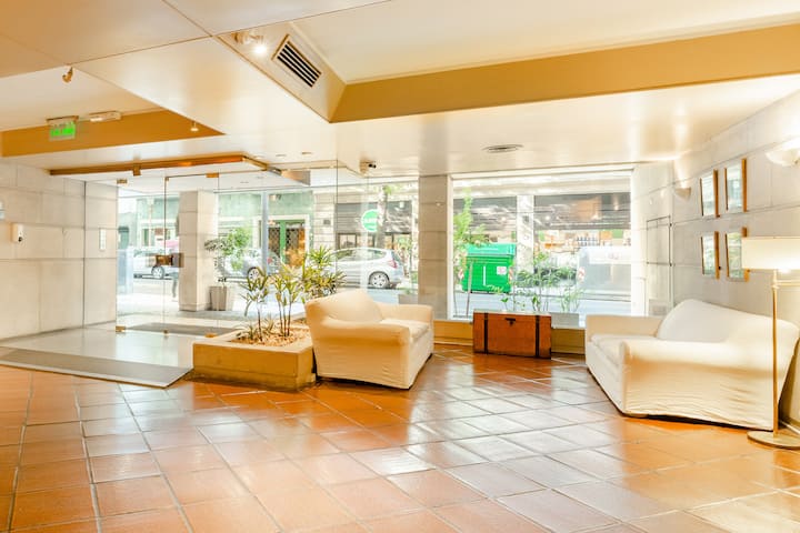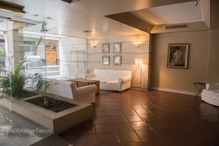 Квартира в Retiro, в районе Plaza San Martin и Av. 9 de Julio, в нескольких кварталах от Teatro Colón. Окна выходят на тихую улицу с хорошим уличным освещением. В здании, ранее использовавшемся как отель 4*, есть фитнес-зал, коворкинг и круглосуточная охрана. В квартире установлены кондиционер (обогрев и охлаждение), холодильник, индукционная электроплита, электрическая духовка и микроволновая печь. Также предусмотрены тостер, электрочайник, посуда, утюг с гладильной доской и цифровой замок с во
