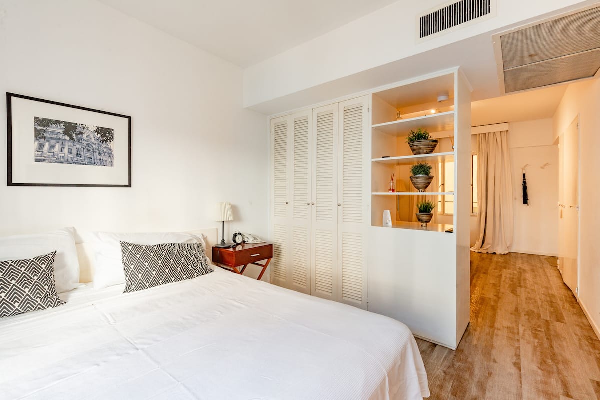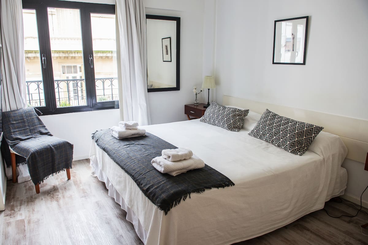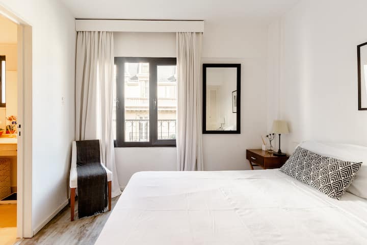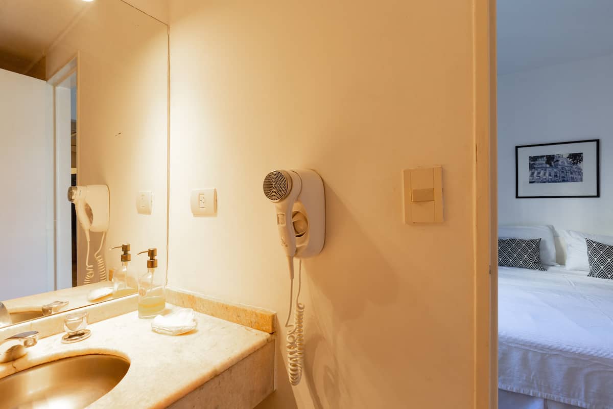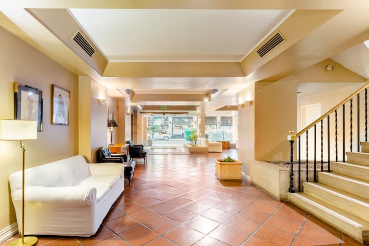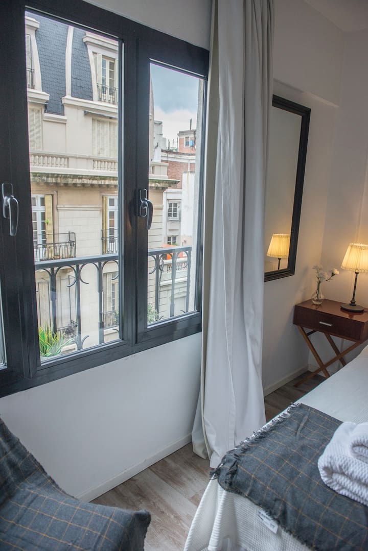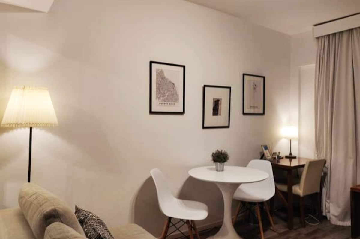 Квартира в Retiro, в районе Plaza San Martin и Av. 9 de Julio, в нескольких кварталах от Teatro Colón. Окна выходят на тихую улицу с хорошим уличным освещением. В здании, ранее использовавшемся как отель 4*, есть фитнес-зал, коворкинг и круглосуточная охрана. В квартире установлены кондиционер (обогрев и охлаждение), холодильник, индукционная электроплита, электрическая духовка и микроволновая печь. Также предусмотрены тостер, электрочайник, посуда, утюг с гладильной доской и цифровой замок с во