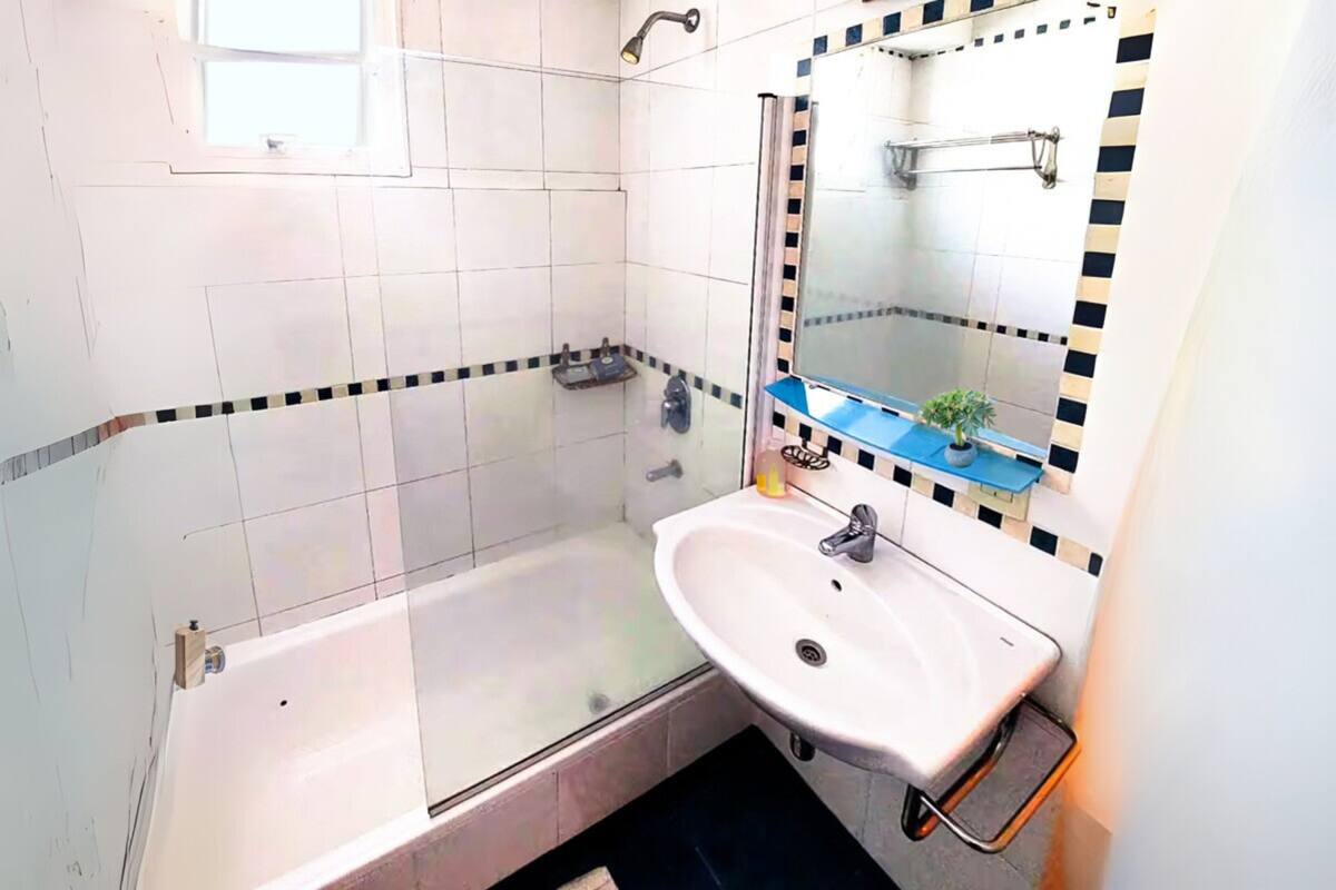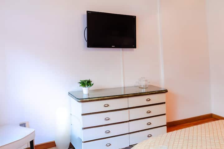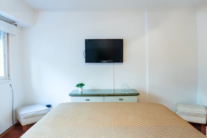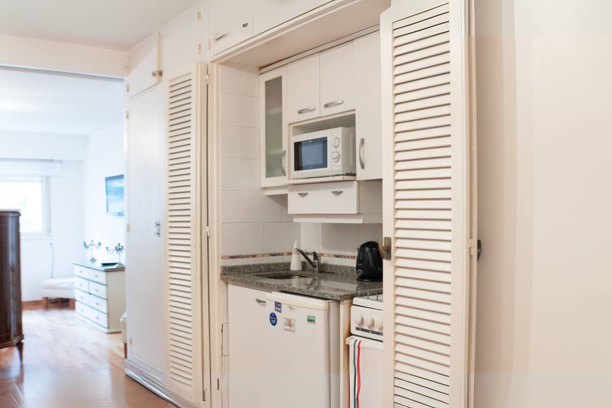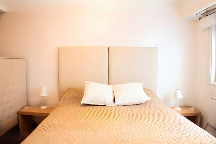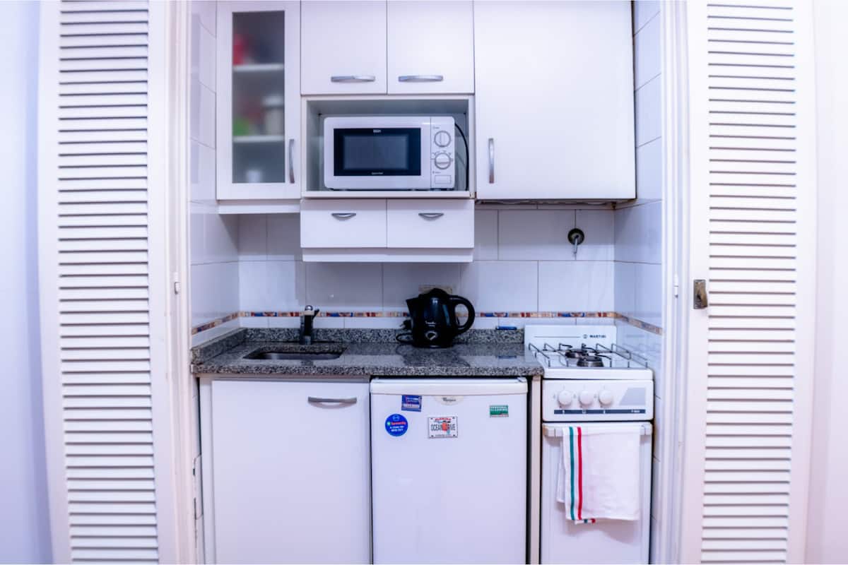 Квартира-студия в Retiro, окна во внутреннюю часть здания, в тихой зоне. В помещении есть обеденный стол на 4 места, двуспальная кровать с пружинным матрасом. Wi-Fi, телевизор 32" с кабельным телевидением, кондиционер «холод/тепло» и центральное отопление; в кухне установлены духовка, плита, холодильник, микроволновая печь, кофеварка, тостер и электрический чайник, предусмотрены посуда и кухонные принадлежности. В ванной с душем есть фен и средства гигиены; также указаны утюг и гладильная доска.