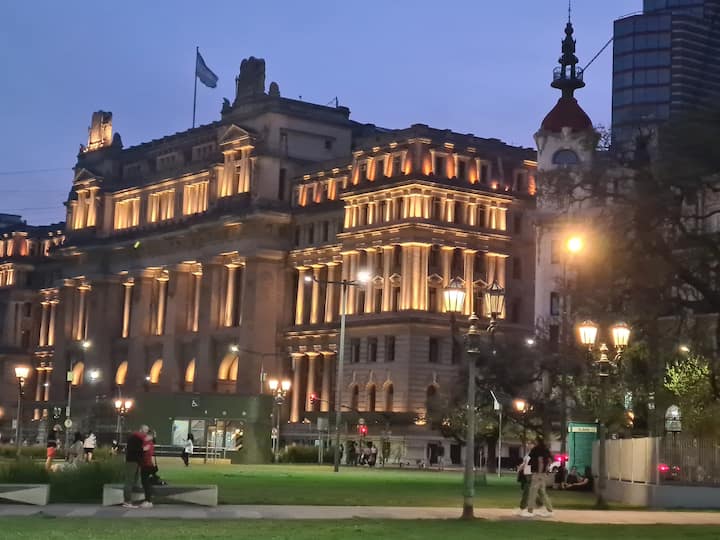 Квартира-студия в Retiro площадью 28 m², с размещением для двоих: двуспальная кровать. В числе удобств — Netflix и Wi‑Fi, сплит-система (горячий/холодный), мини-бар, набор кухонной посуды и предметы для приготовления. Также указаны фен, электрическая кофеварка, тостер и электрический чайник. Размещение находится в 9 кварталах от терминала Buquebus, в 80 метрах от Tienda Leon, в 5 кварталах от Galerías Pacífico и в 3 кварталах от Обелиска.