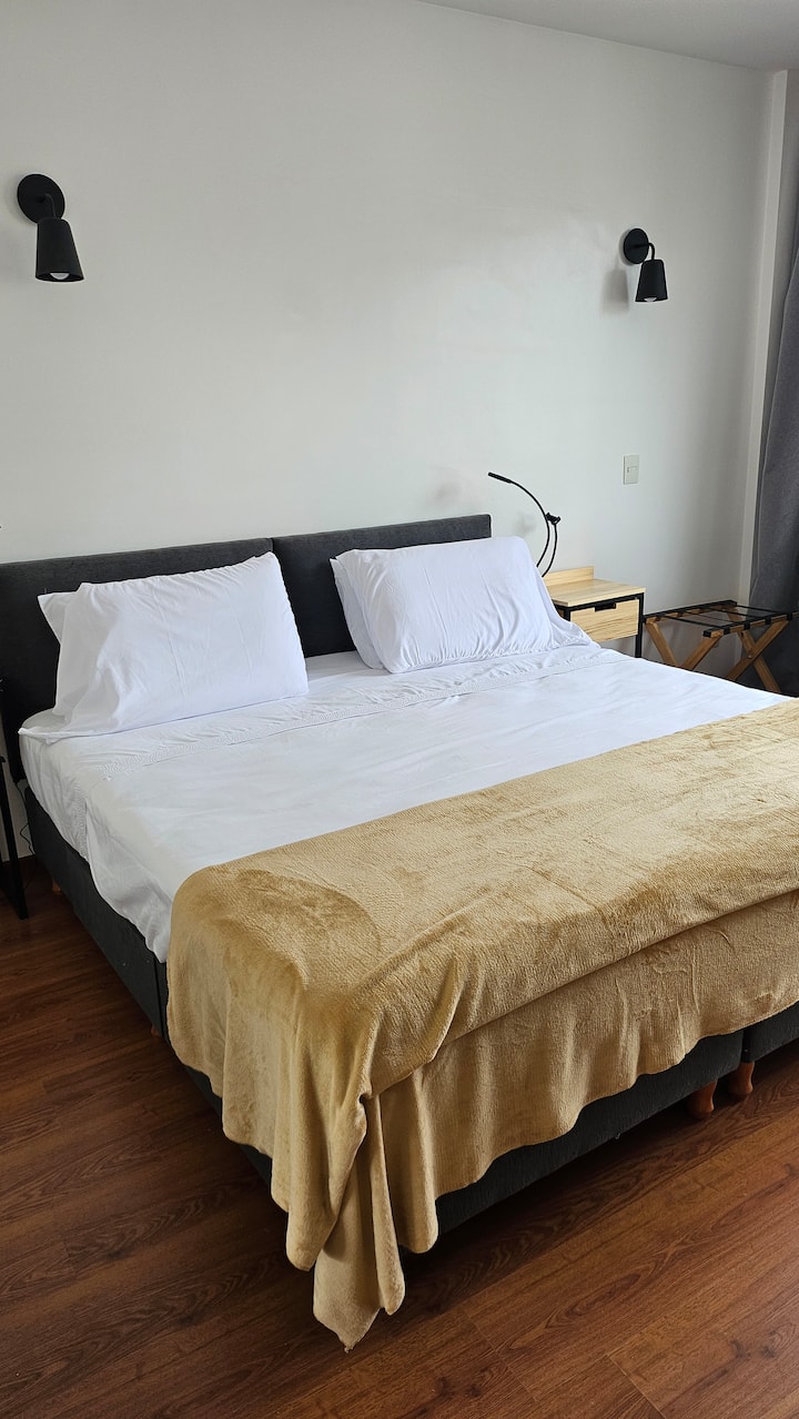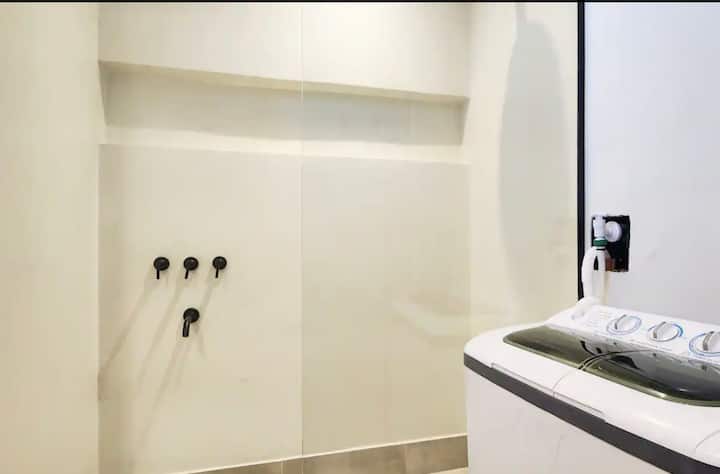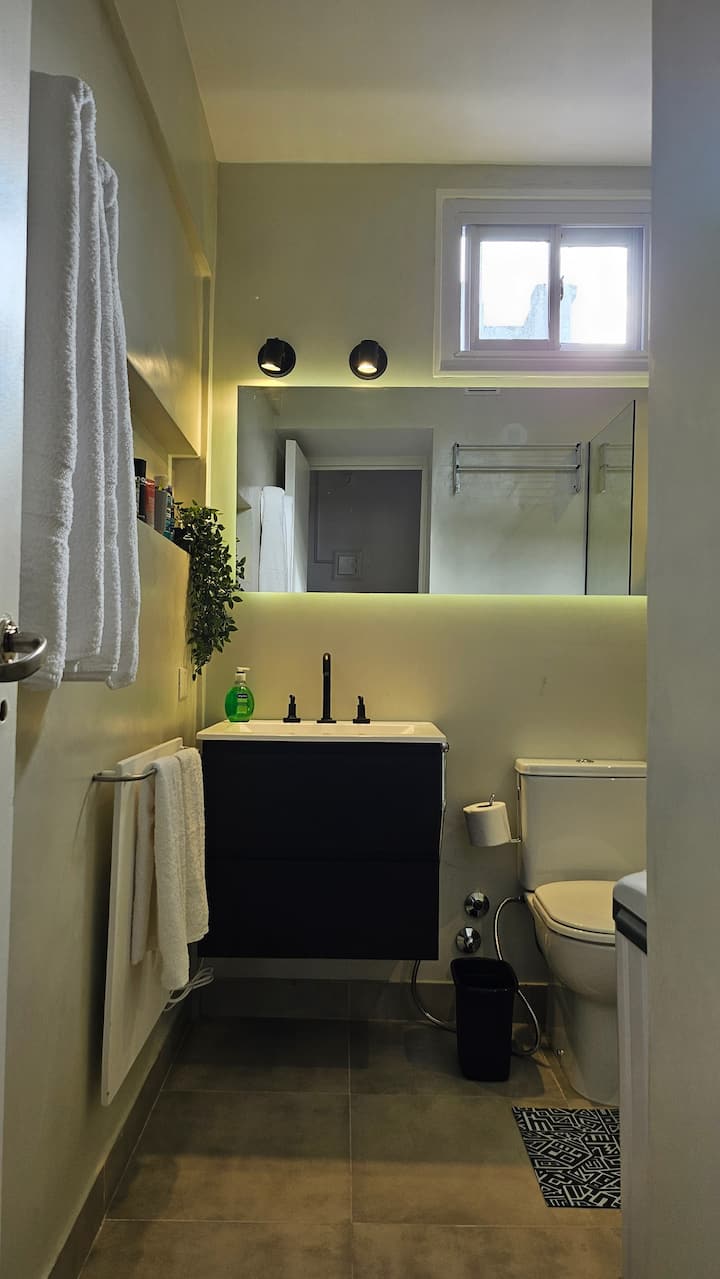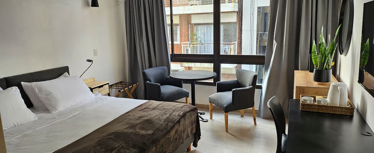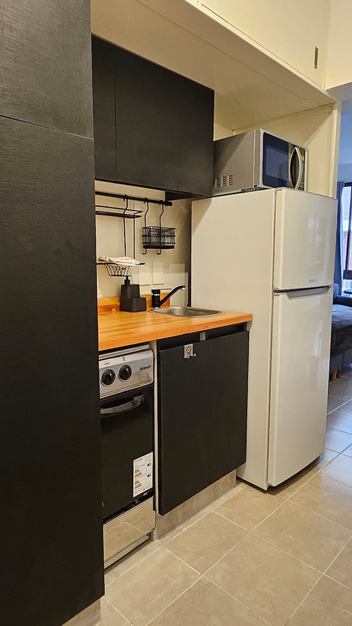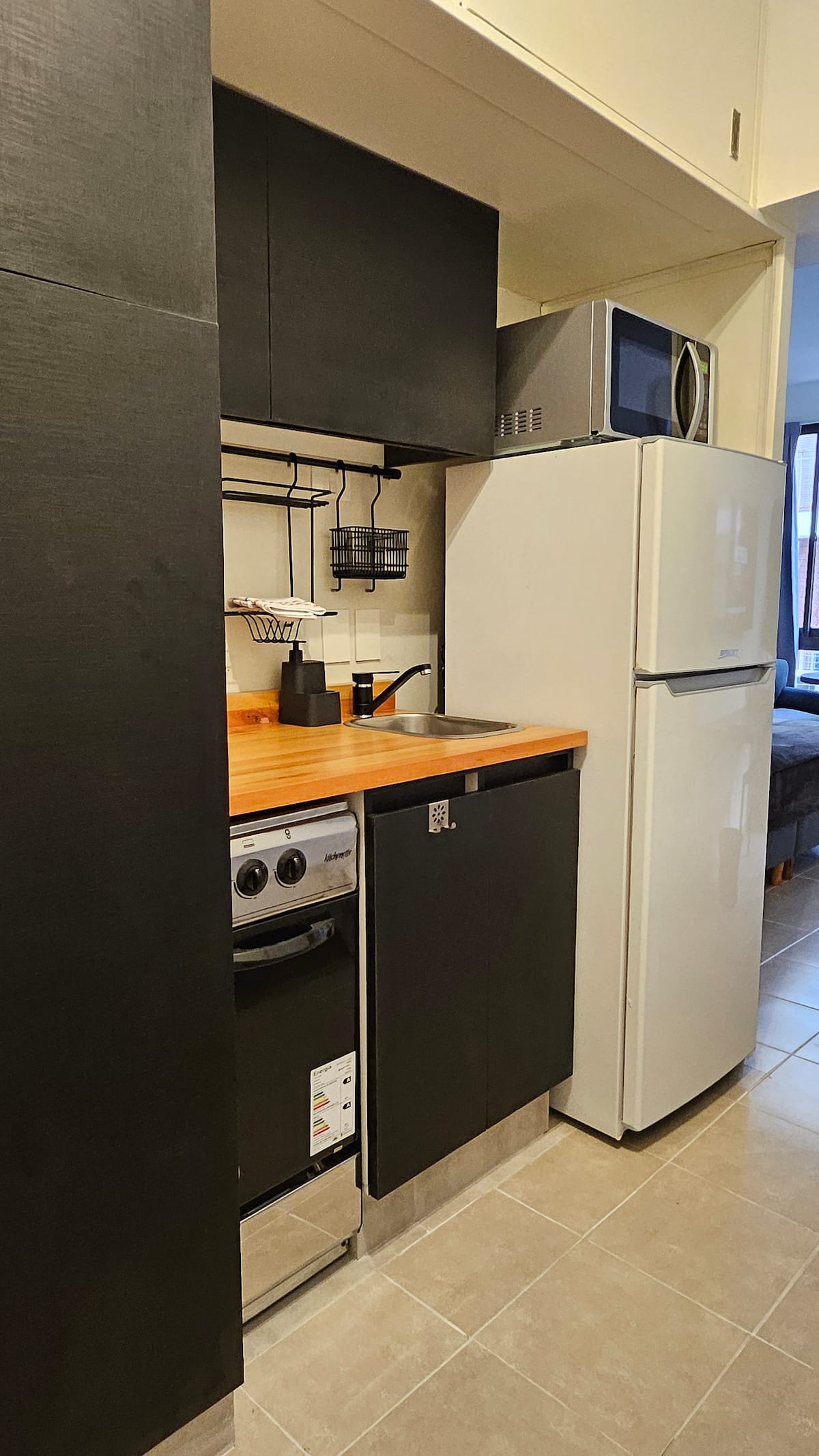 Квартира в Retiro для 2 человек, после ремонта. В кухне установлены вытяжка, большой холодильник, микроволновая печь, тостер и электрогриль для индейки, кухонная утварь и посуда рассчитаны на 4 человека. В спальне кровать размера king либо два односпальных места 90 см, есть ящики для хранения. В ванной душевая кабина с стеклянной перегородкой, водонагреватель и ручной биде. Предусмотрены стиральная машина и рабочее место для двух человек, сейф с цифровым доступом, ящики и зона для вешалок. В гос