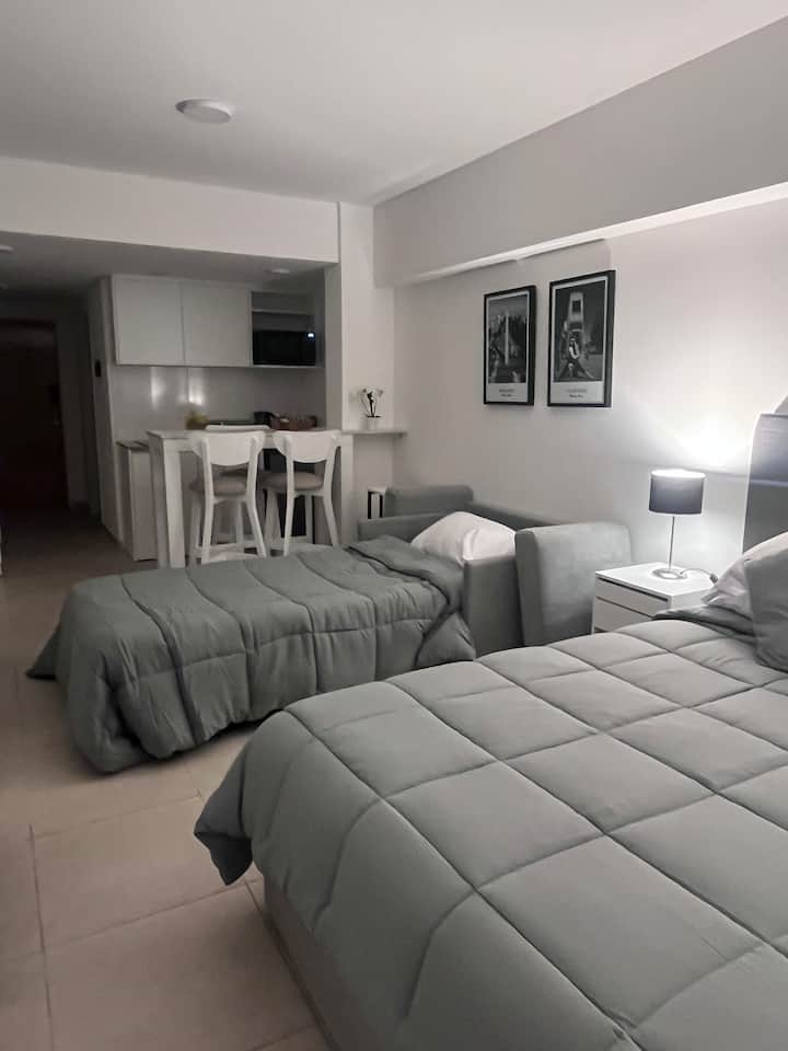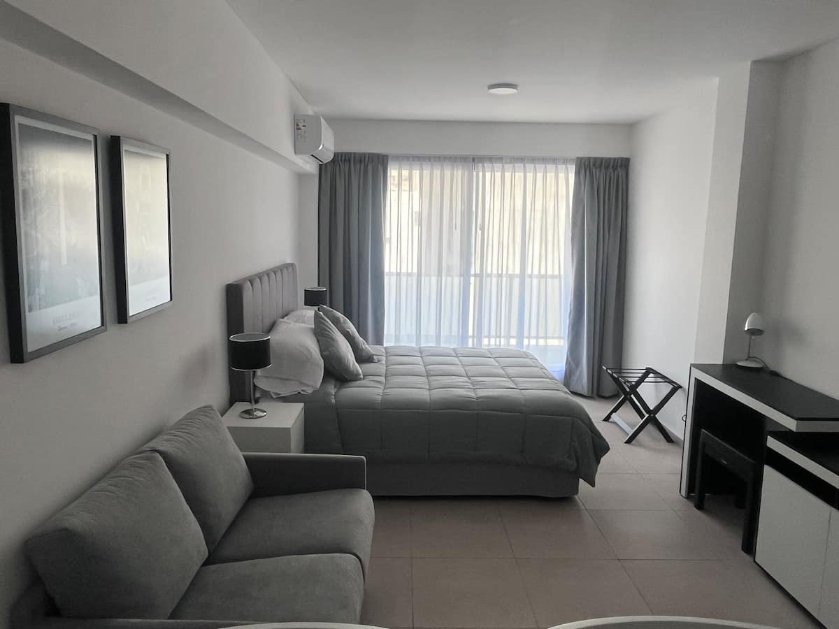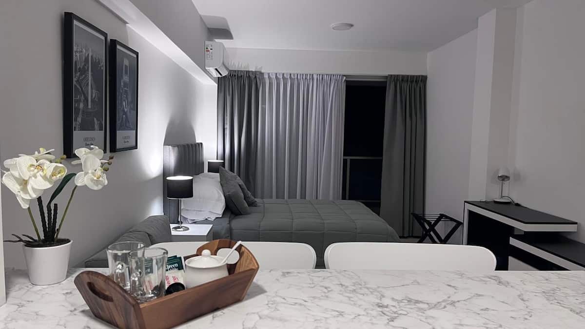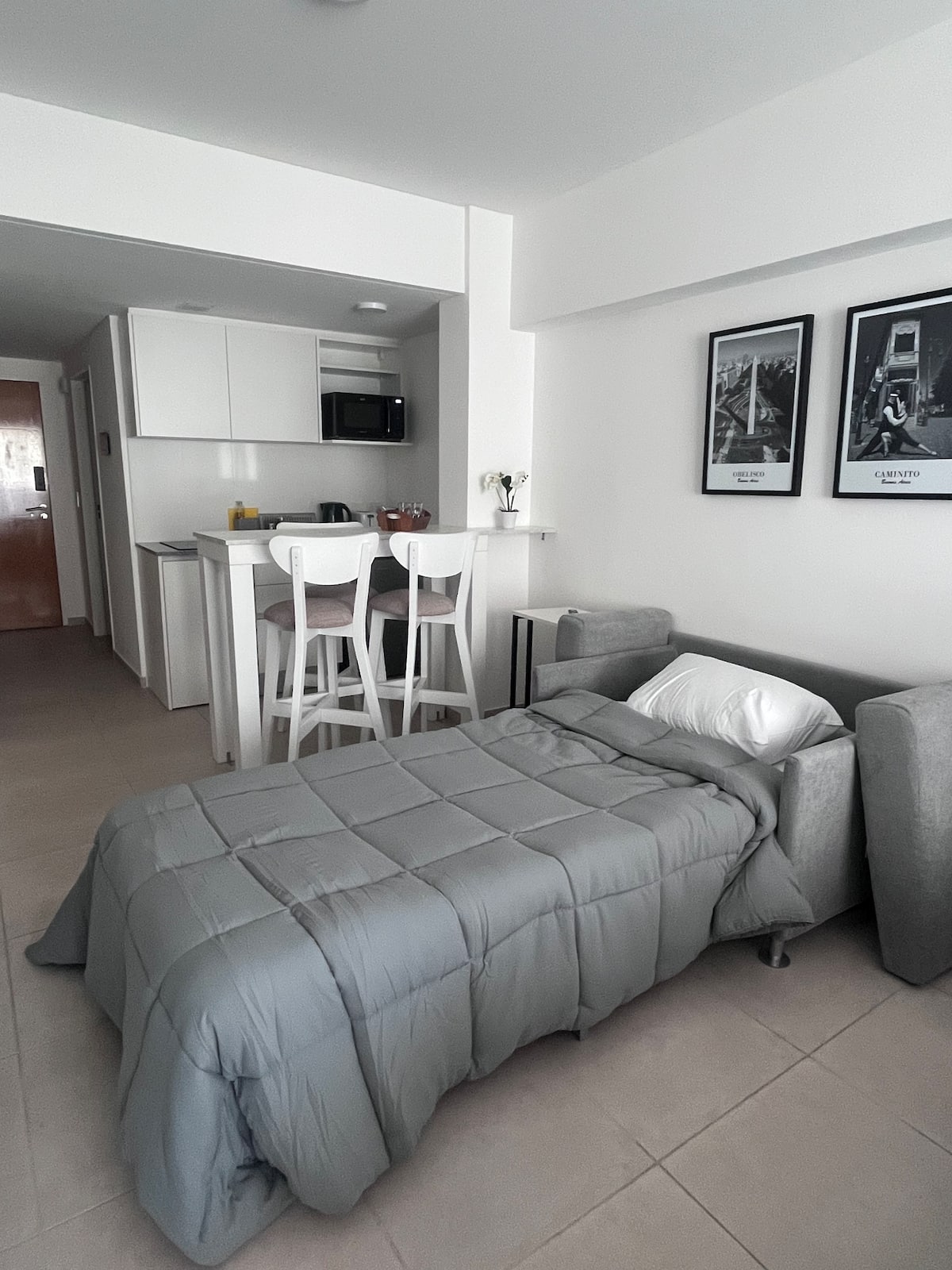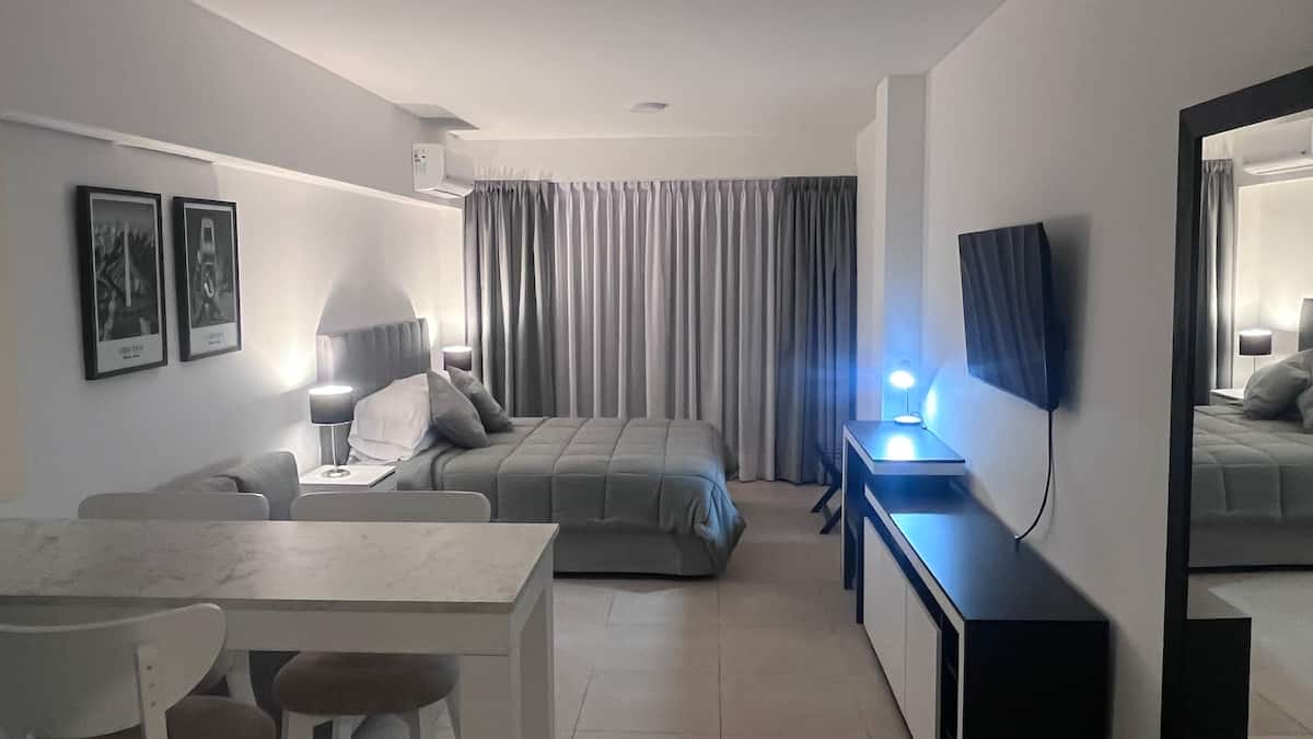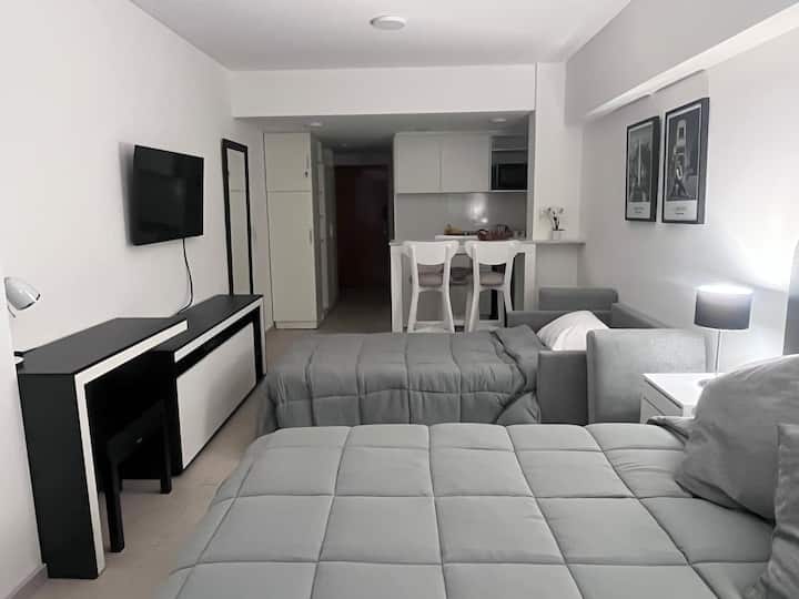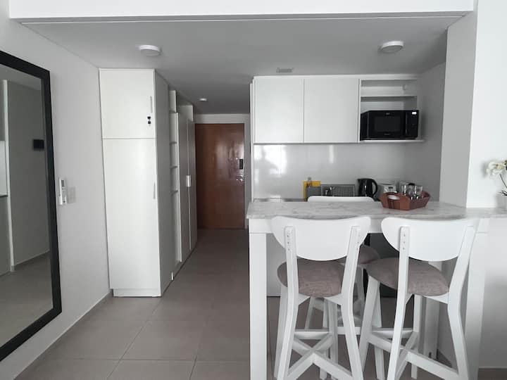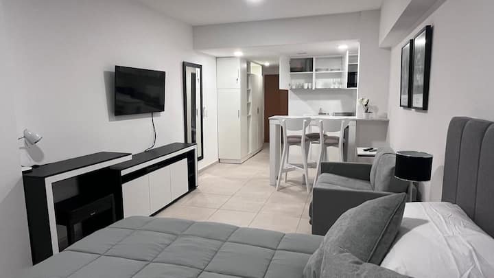 Квартира-студия в Retiro для 3 гостей, новая. В студии есть зона сна с двуспальной кроватью и выходом на балкон с видом на город, а также диван-кровать 90 x 190 см, рабочий стол и телевизор Samsung Smart TV 43”. На кухне есть барная стойка на 3 места и полностью оборудованная кухня с посудой и бытовой техникой. Ванная комната оборудована феном, предусмотрены полотенца и бесплатные туалетные принадлежности. В здании действует охрана 24 часа, биометрический доступ и умный замок; на крыше есть терр