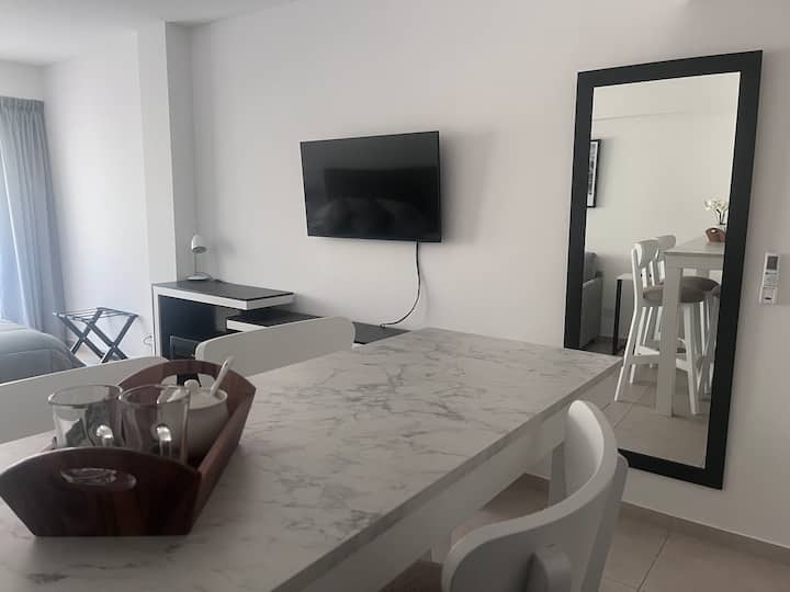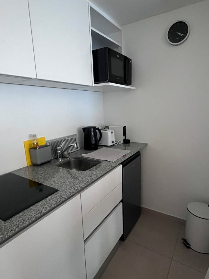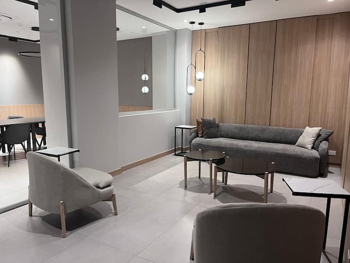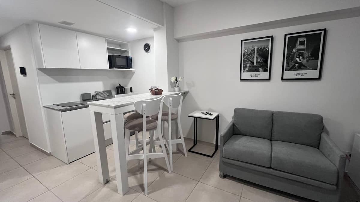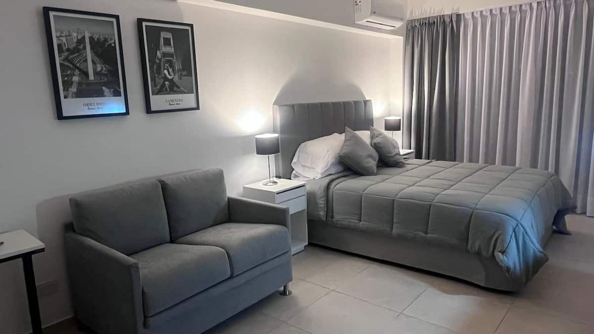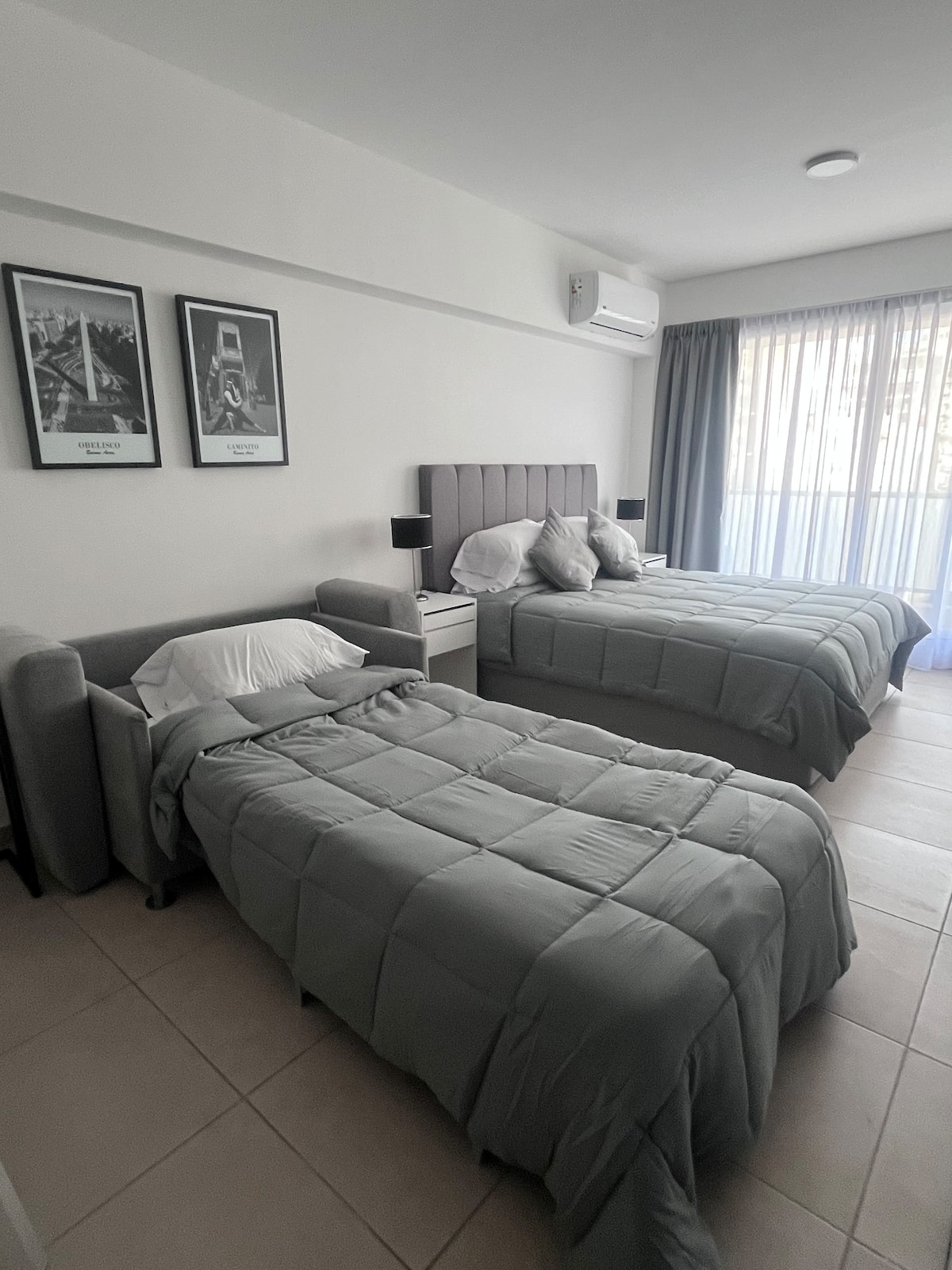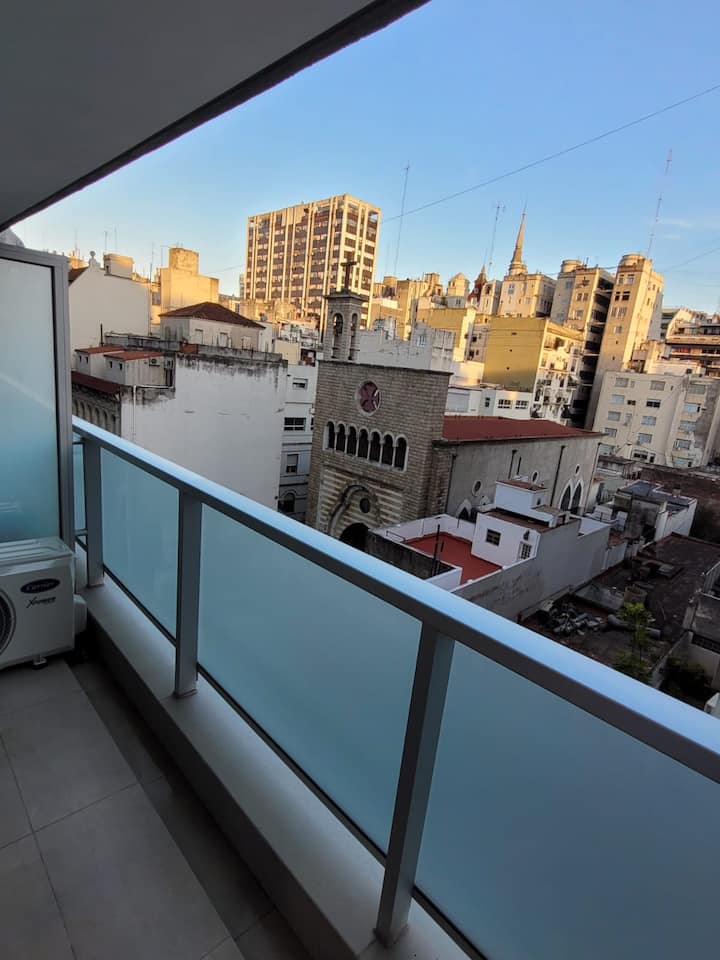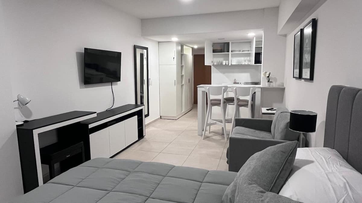 Квартира-студия в Retiro для 3 гостей, новая. В студии есть зона сна с двуспальной кроватью и выходом на балкон с видом на город, а также диван-кровать 90 x 190 см, рабочий стол и телевизор Samsung Smart TV 43”. На кухне есть барная стойка на 3 места и полностью оборудованная кухня с посудой и бытовой техникой. Ванная комната оборудована феном, предусмотрены полотенца и бесплатные туалетные принадлежности. В здании действует охрана 24 часа, биометрический доступ и умный замок; на крыше есть терр