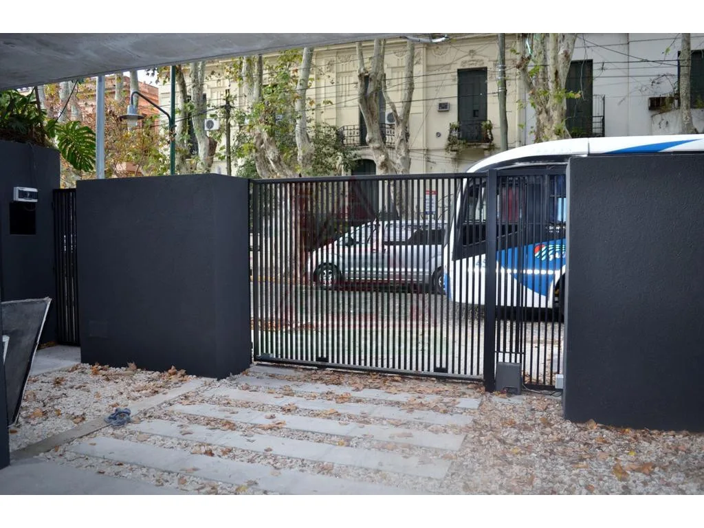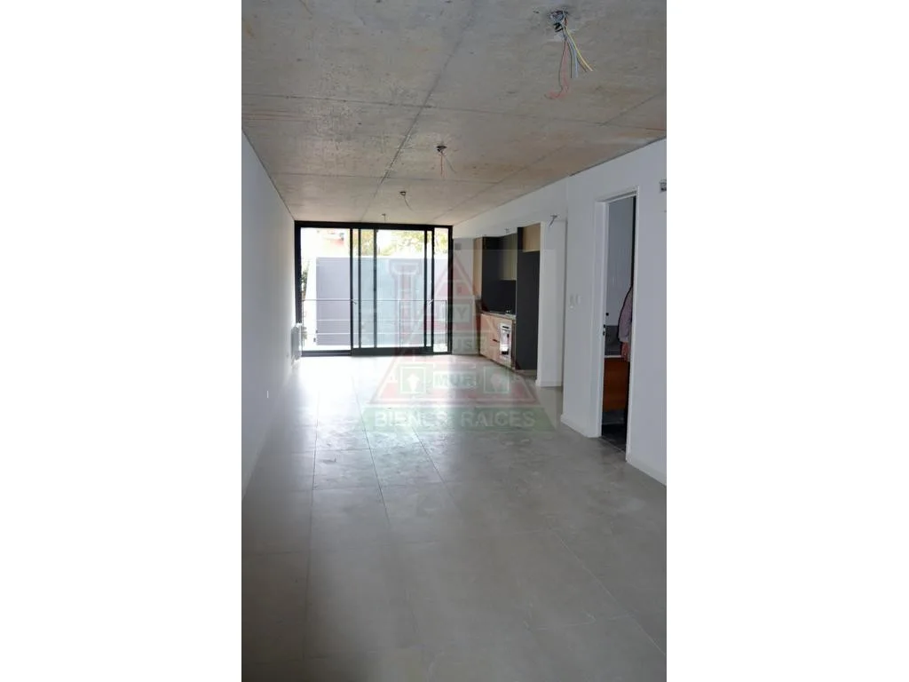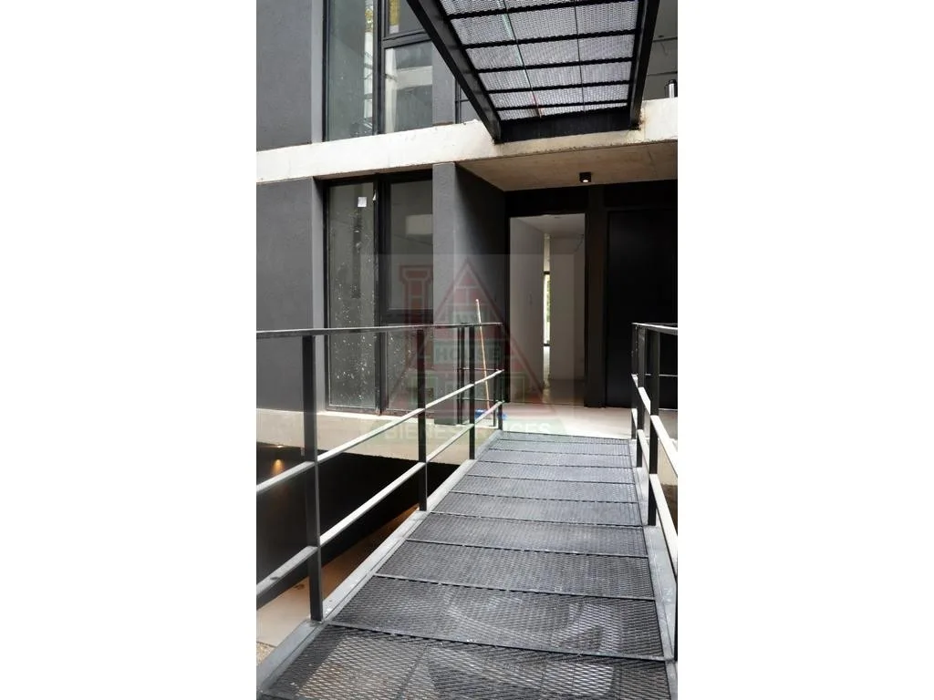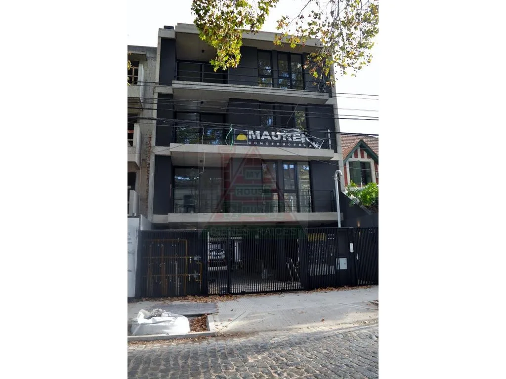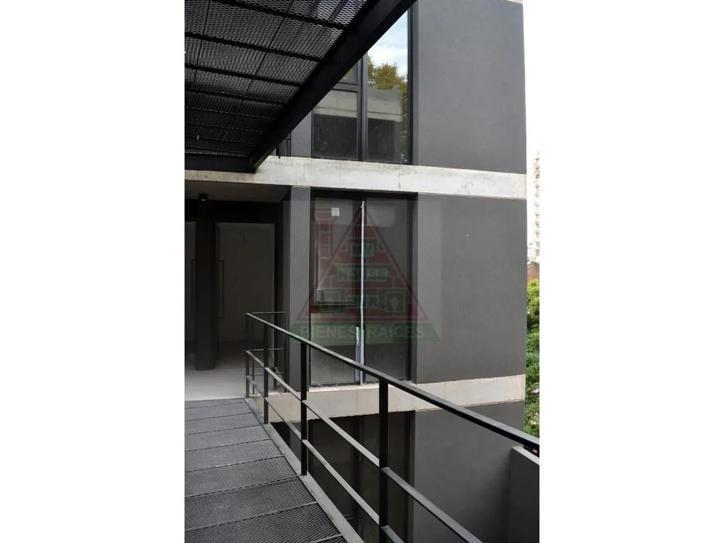 Квартира из двух комнат в Barrio Las Carreras de San Isidro. Окна выходят на улицу: на плане указана типология «в frente» с тремя комнатами и типология «в contrafrente» с двумя комнатами. Расстояние до Av. Centenario — несколько метров, до Márquez — 100 m, до Estación de Tren San Isidro (Línea Mitre) — 200 m. Здание высотой 3 этажа, 9 квартир и 13 (закреплённых) парковочных мест, предусмотрены балконы; отделка включает бетон, дерево и чёрное железо.