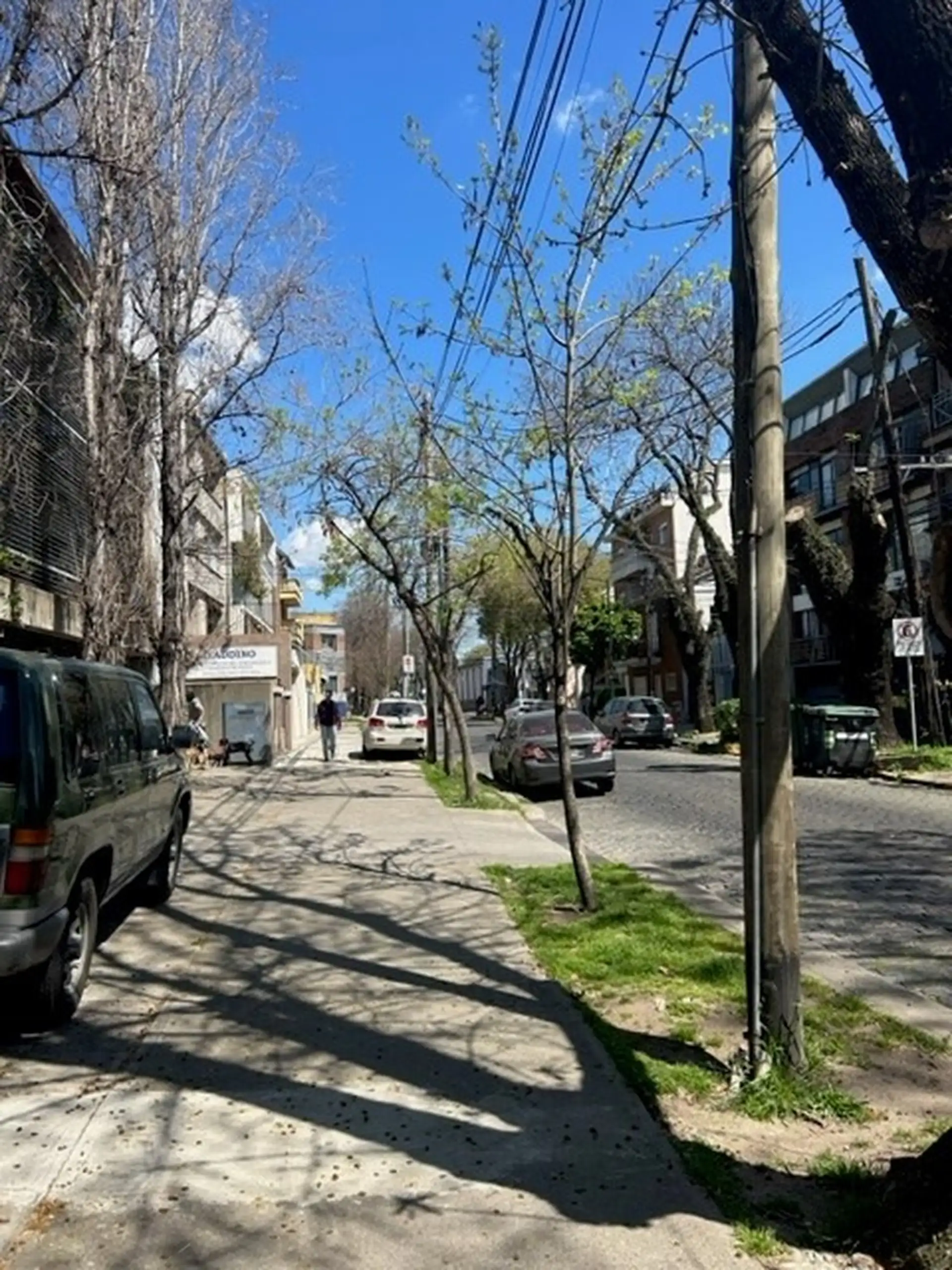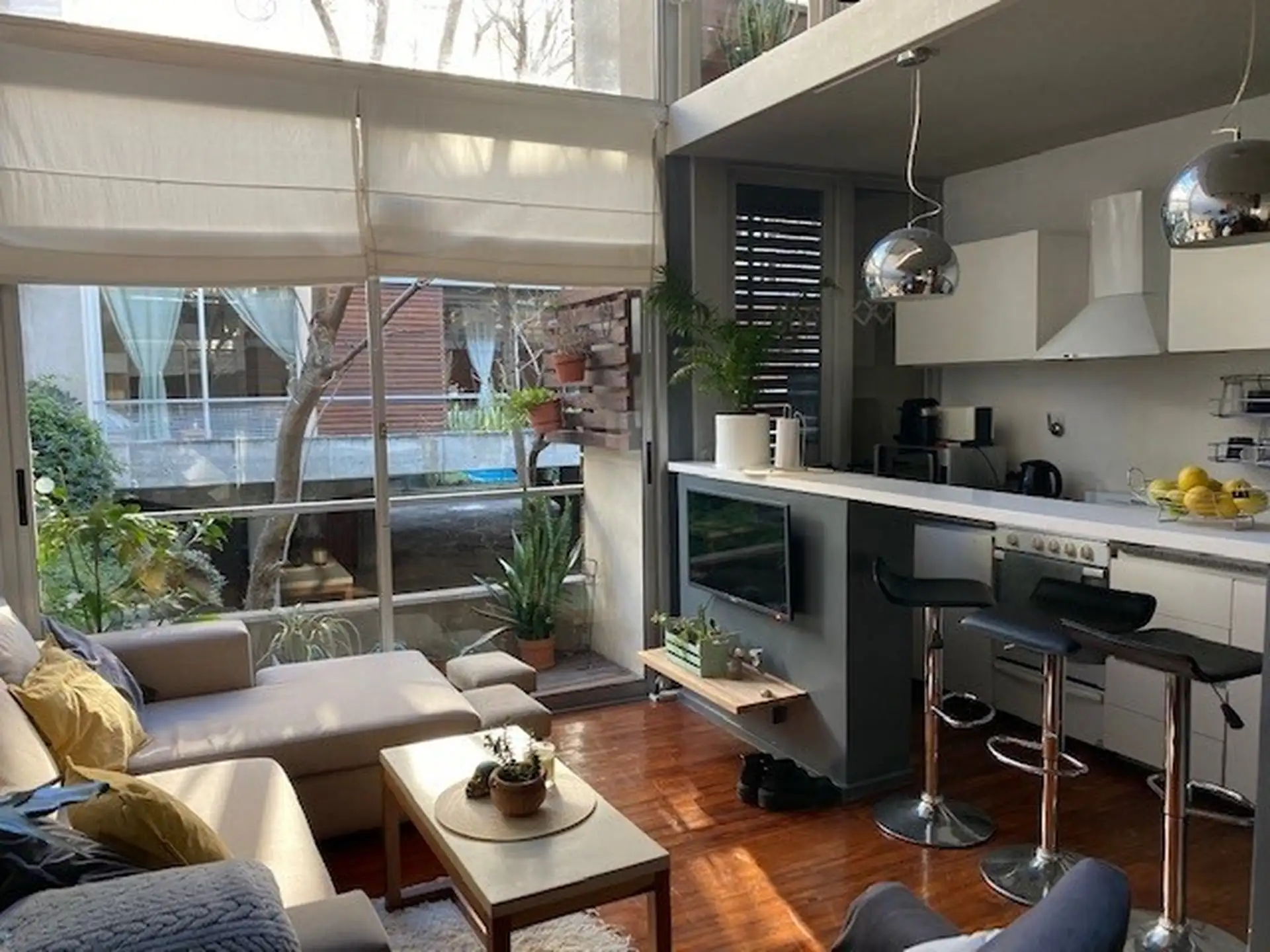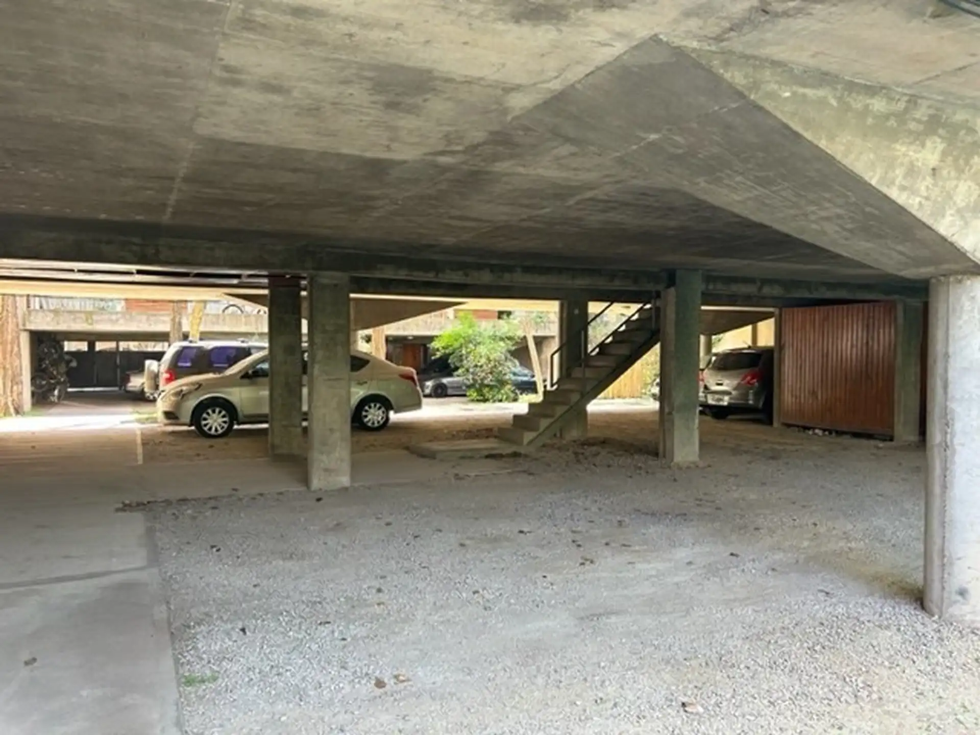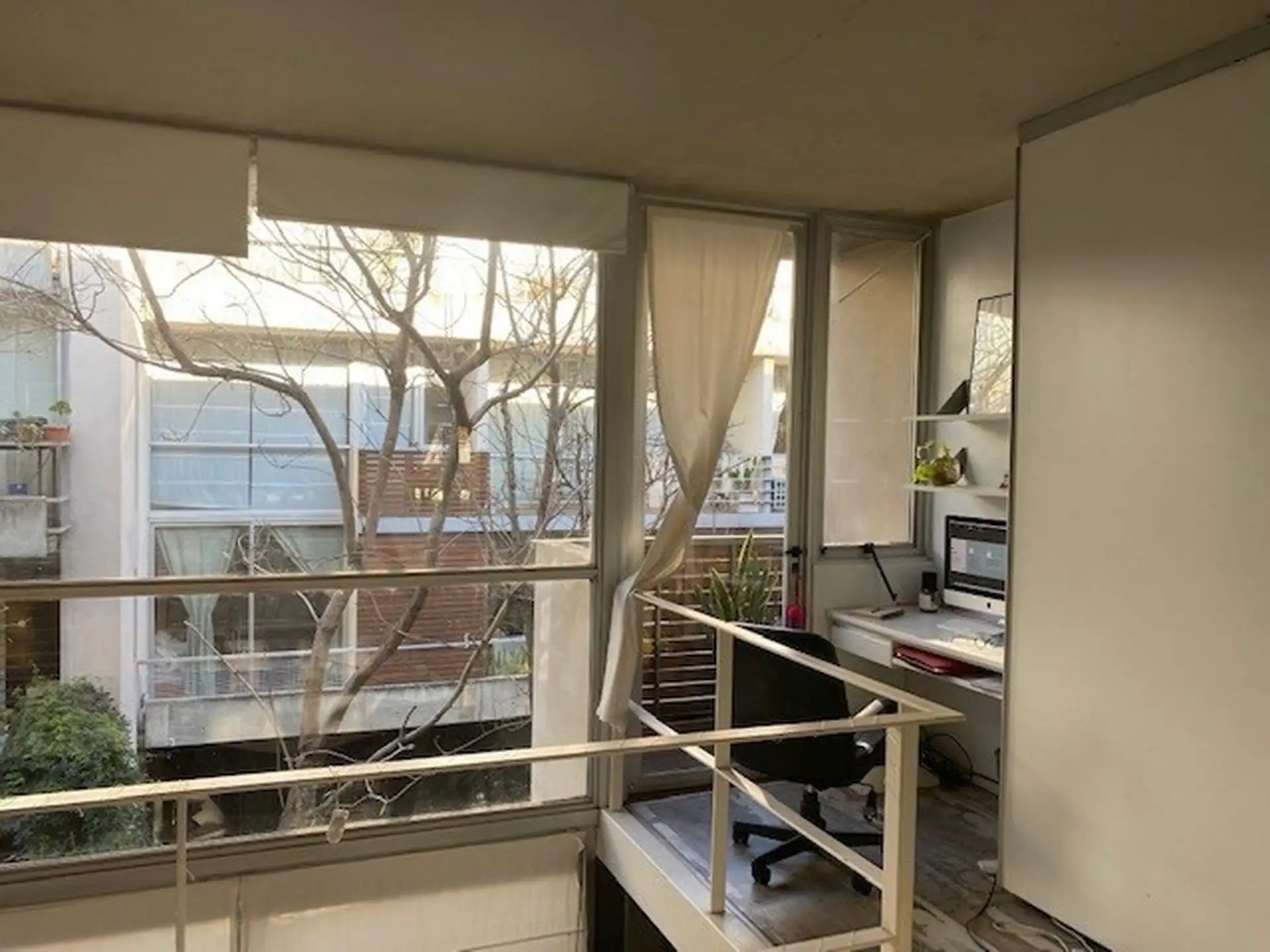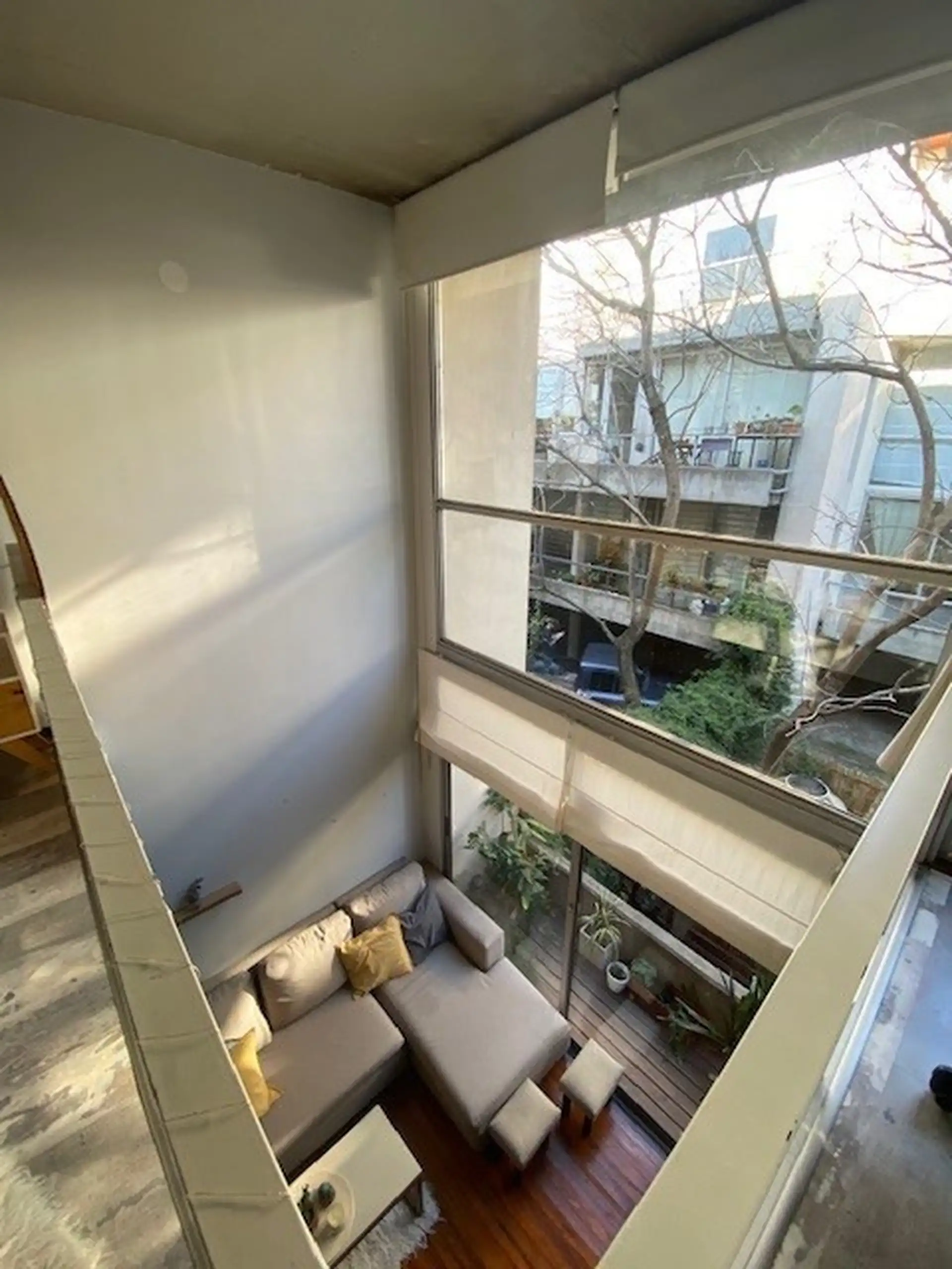 Квартира в San Isidro с мебелью, двухкомнатная планировка типа duplex на 1-м этаже, окна во двор (contrafrente). В первом уровне: гостиная и столовая с двойной высотой, полуинтегрированная кухня с собственной прачечной и выходом на собственный балкон, второй балкон в зоне гостиной. На втором уровне: спальня с встроенным шкафом, санузел, отдельное место под рабочий стол; спальня выходит на уровень ниже. Отопление — eskabe. Полы на первом уровне — pinotea, на втором — цементные рейки с выровненной