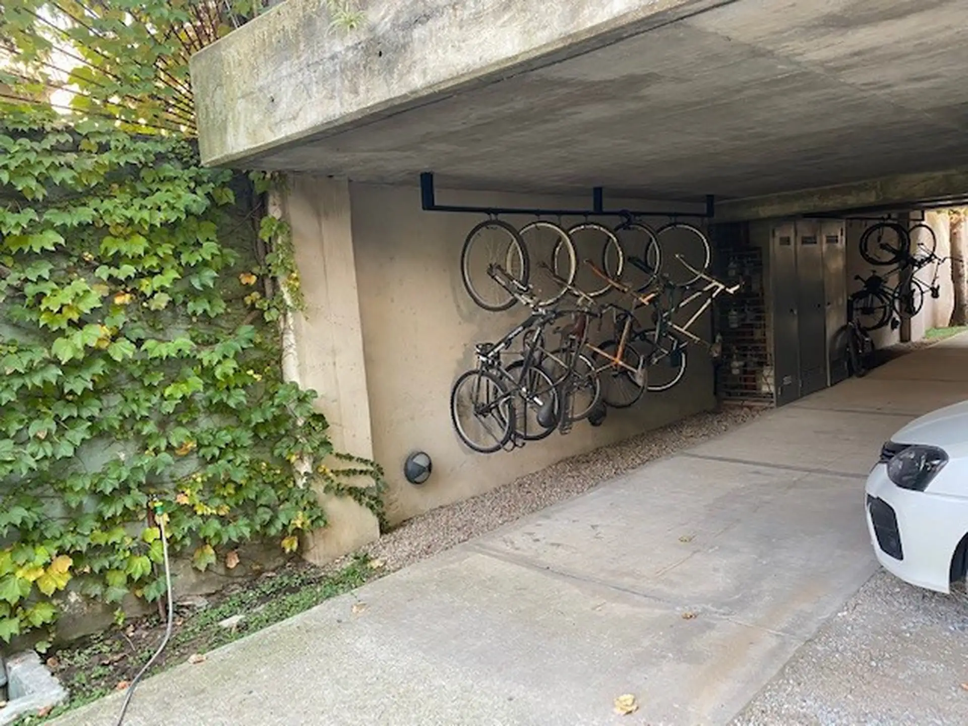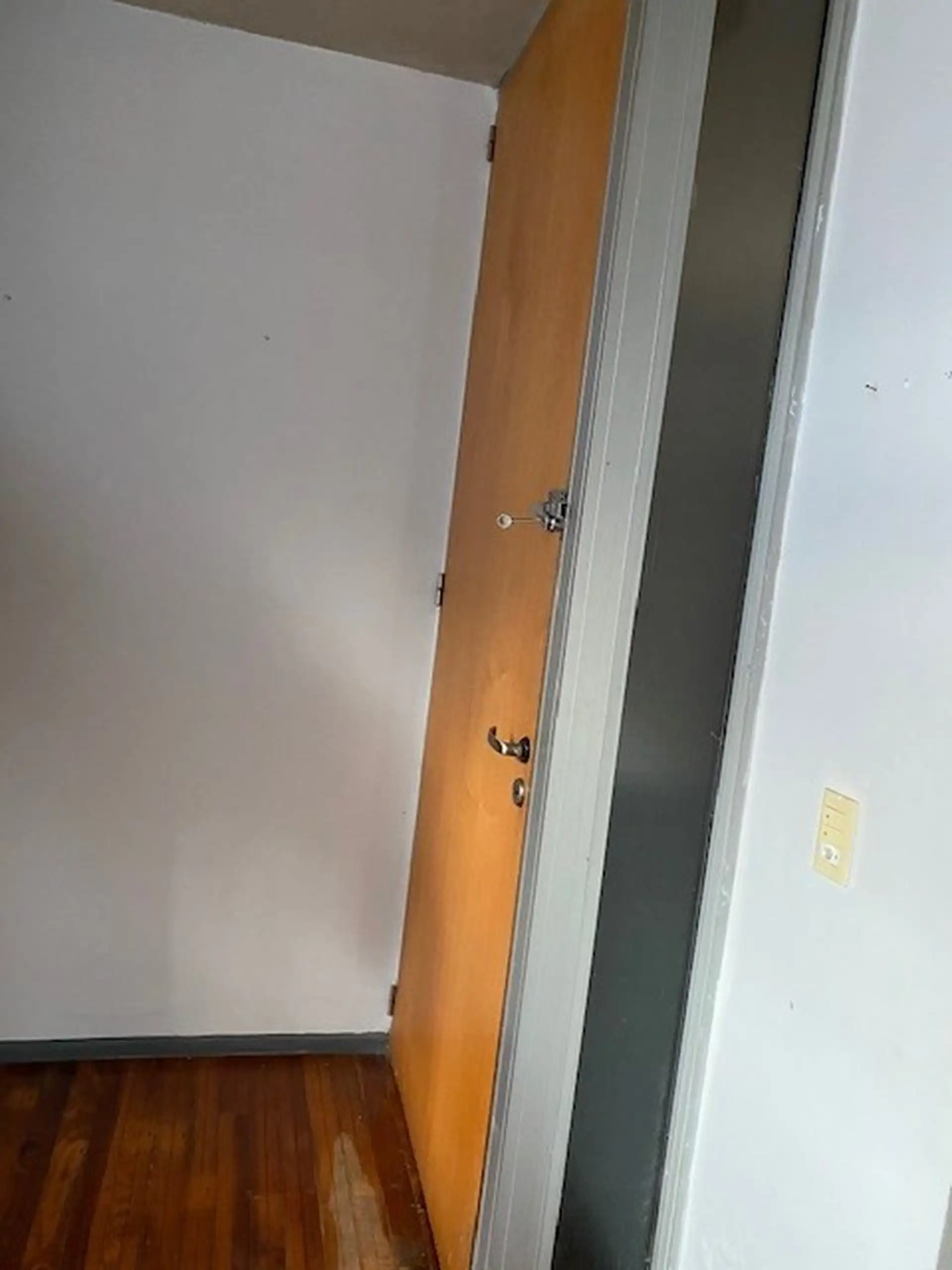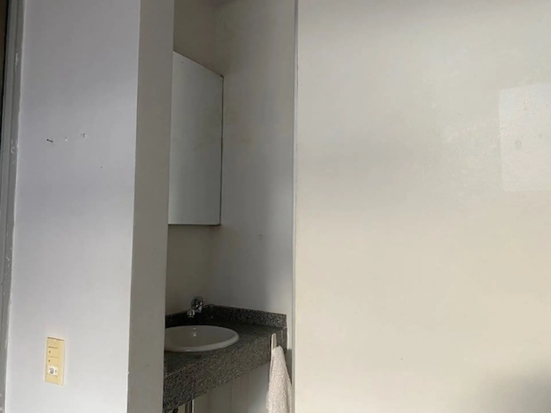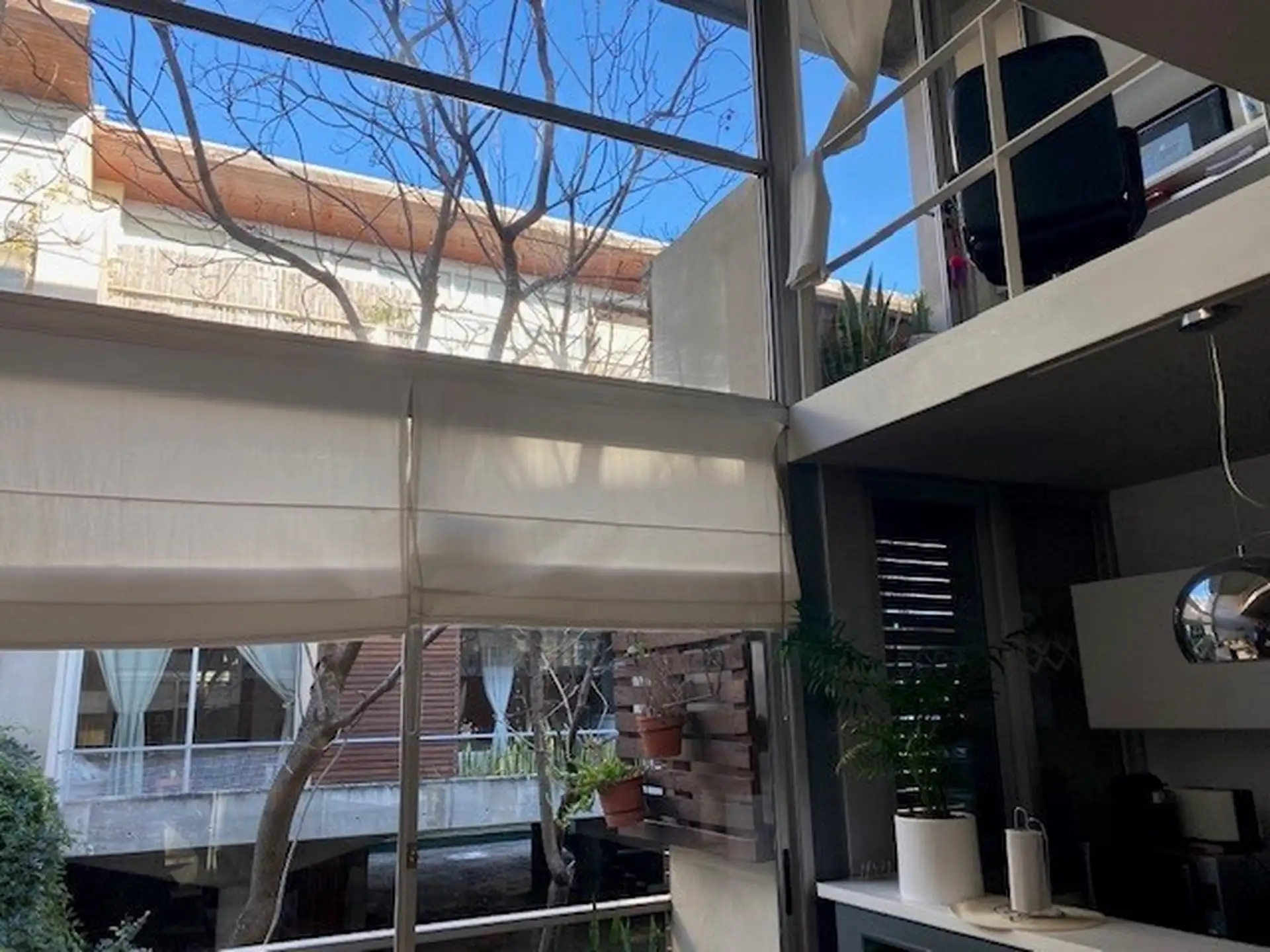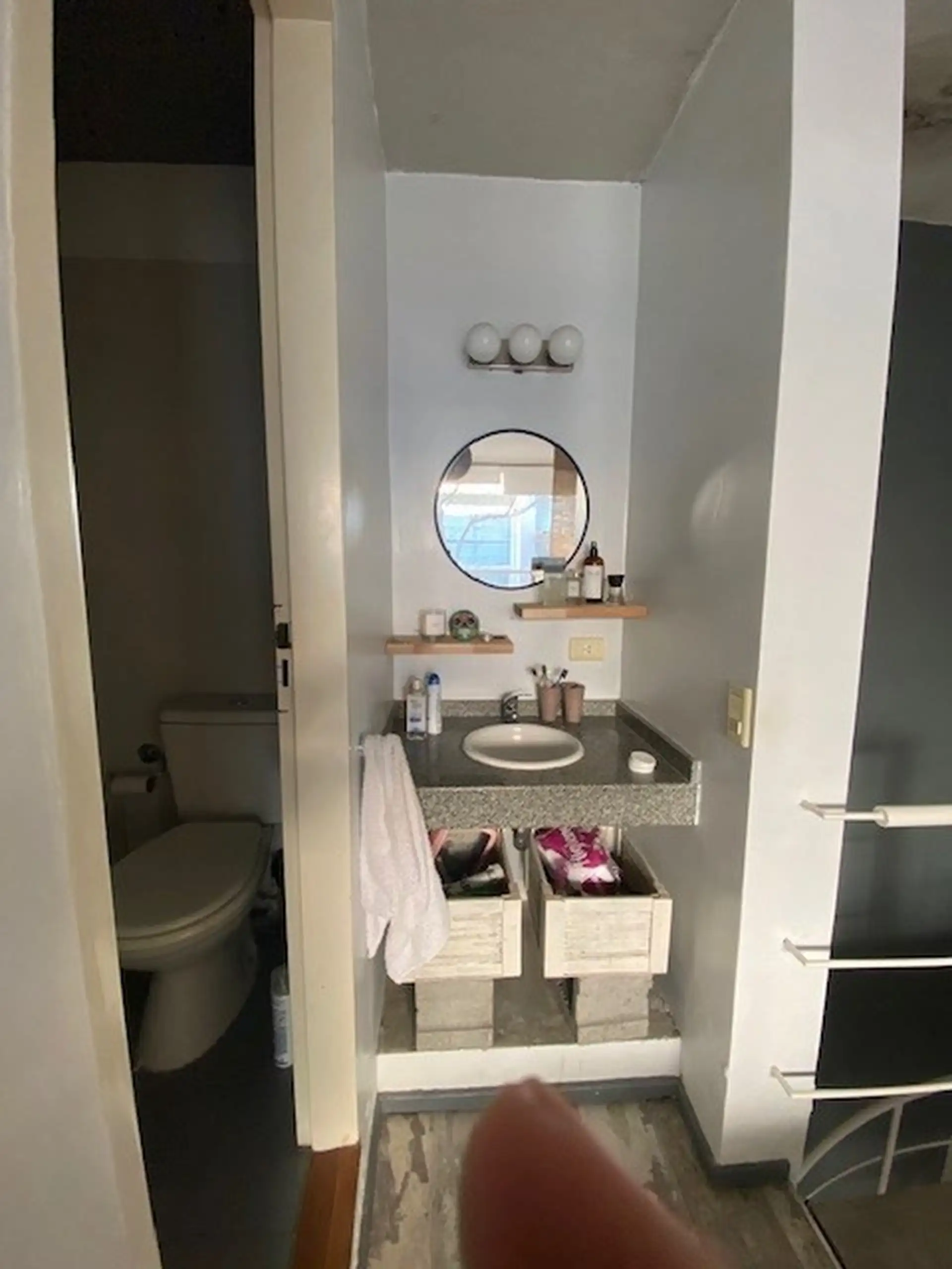 Квартира в San Isidro с мебелью, двухкомнатная планировка типа duplex на 1-м этаже, окна во двор (contrafrente). В первом уровне: гостиная и столовая с двойной высотой, полуинтегрированная кухня с собственной прачечной и выходом на собственный балкон, второй балкон в зоне гостиной. На втором уровне: спальня с встроенным шкафом, санузел, отдельное место под рабочий стол; спальня выходит на уровень ниже. Отопление — eskabe. Полы на первом уровне — pinotea, на втором — цементные рейки с выровненной