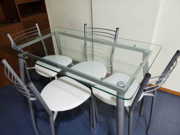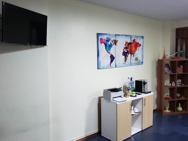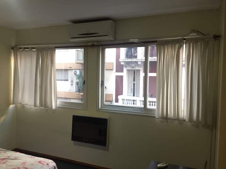 Квартира в San Nicolás с рабочей зоной. В распоряжении офисное оборудование: кофемашина Nespresso (капсулы по усмотрению арендатора), электрический чайник, принтер и Wi‑Fi в связке с услугами кафе. Указано, что доступны 4 тренажёра. Здание находится в 1 квартале от станции метро Callao (линия B), в 1 квартале от Av. Corrientes, в 2 кварталах от Национального конгресса и в 5 кварталах от Обелиска.