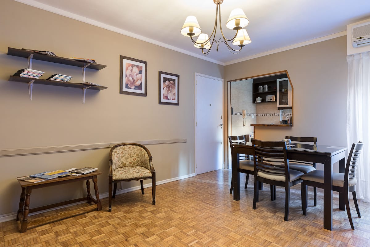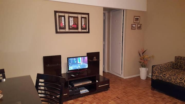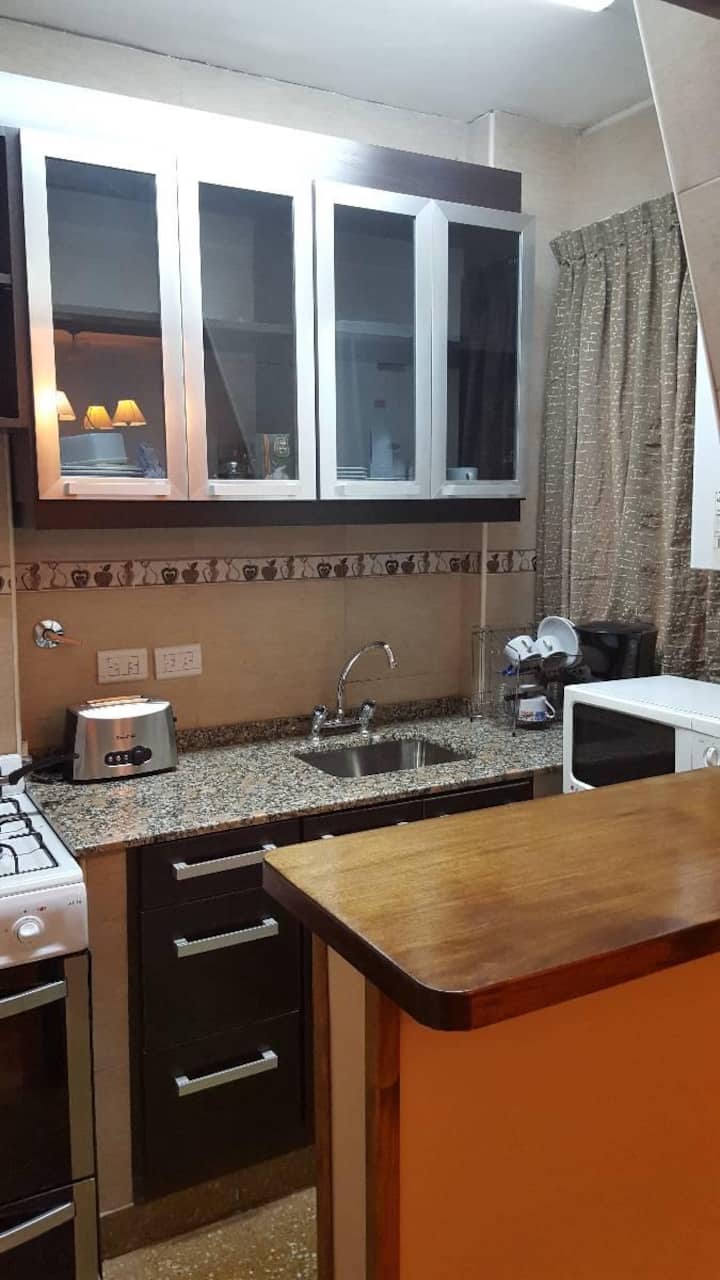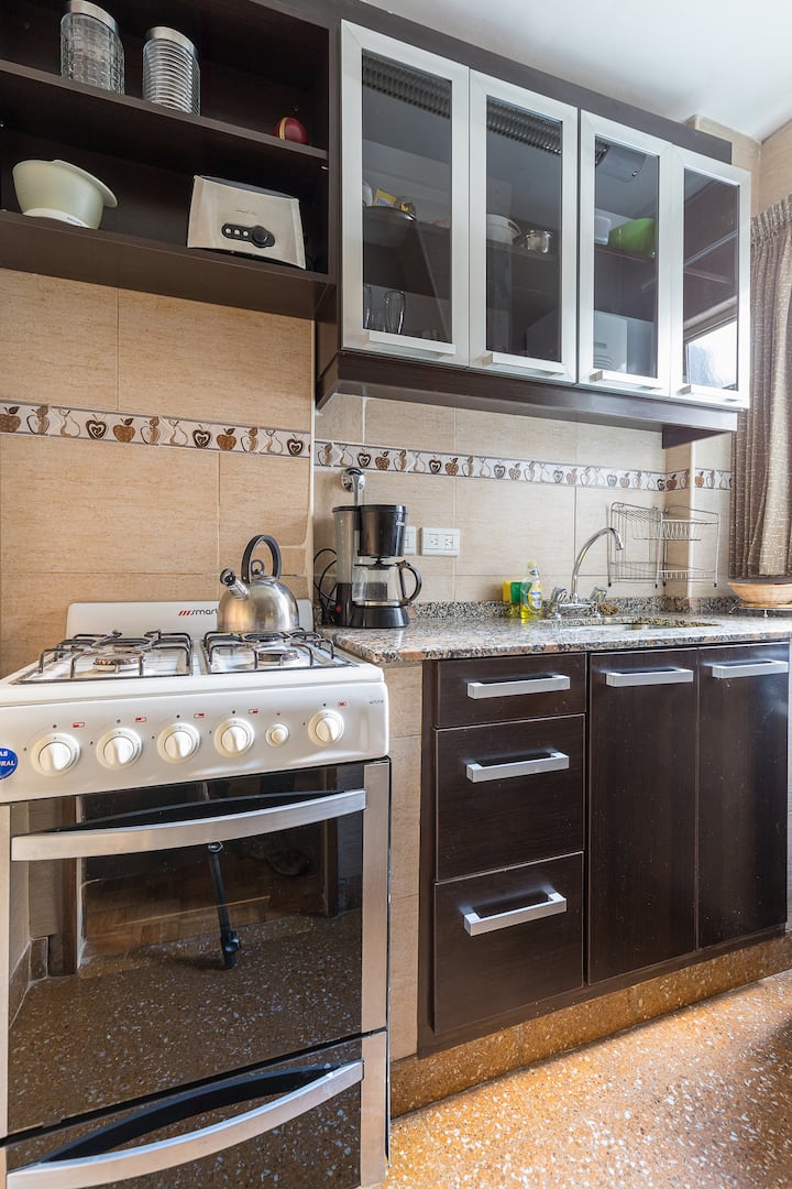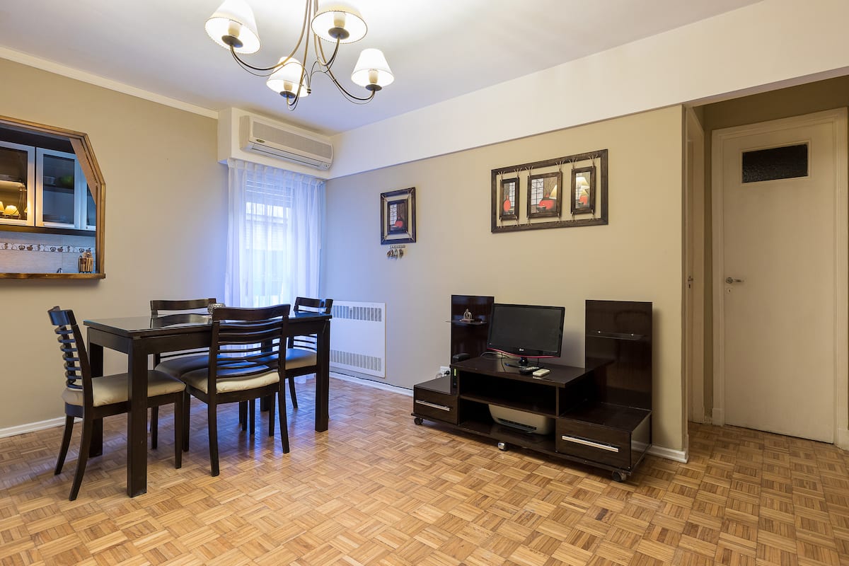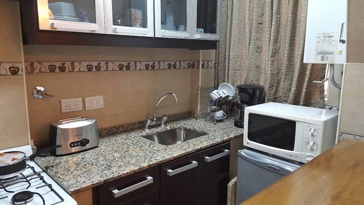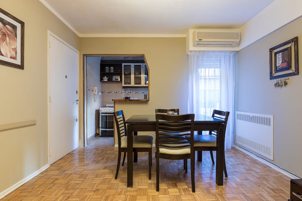 Квартира в San Nicolás с 1 спальней, гостиной-столовой и отдельной кухней-ванной. Планировка рассчитана на 4 спальных места: двуспальная кровать в спальне, раскладная детская/дополнительная кровать (с возможностью раздельной установки на 2 места) и двуспальный диван 1,50 m в гостиной. Есть кондиционирование холод/тепло в двух помещениях, кабельное телевидение и Wi‑Fi. В кухне-ванной предусмотрена бытовая техника и посуда. В здании 2 лифта; камер видеонаблюдения внутри квартиры нет.