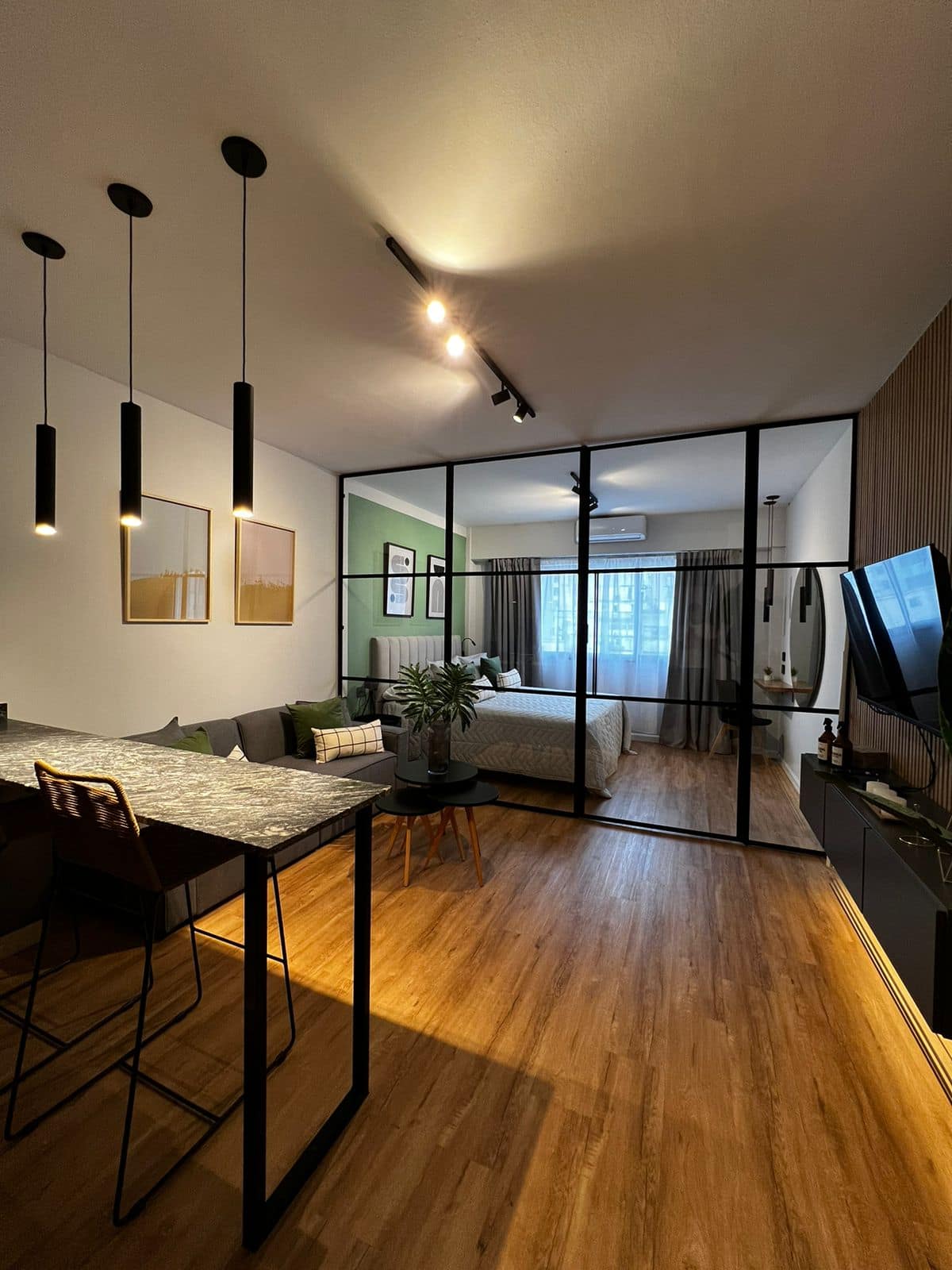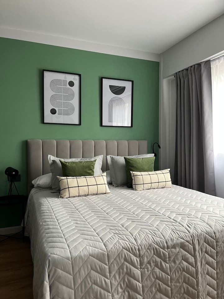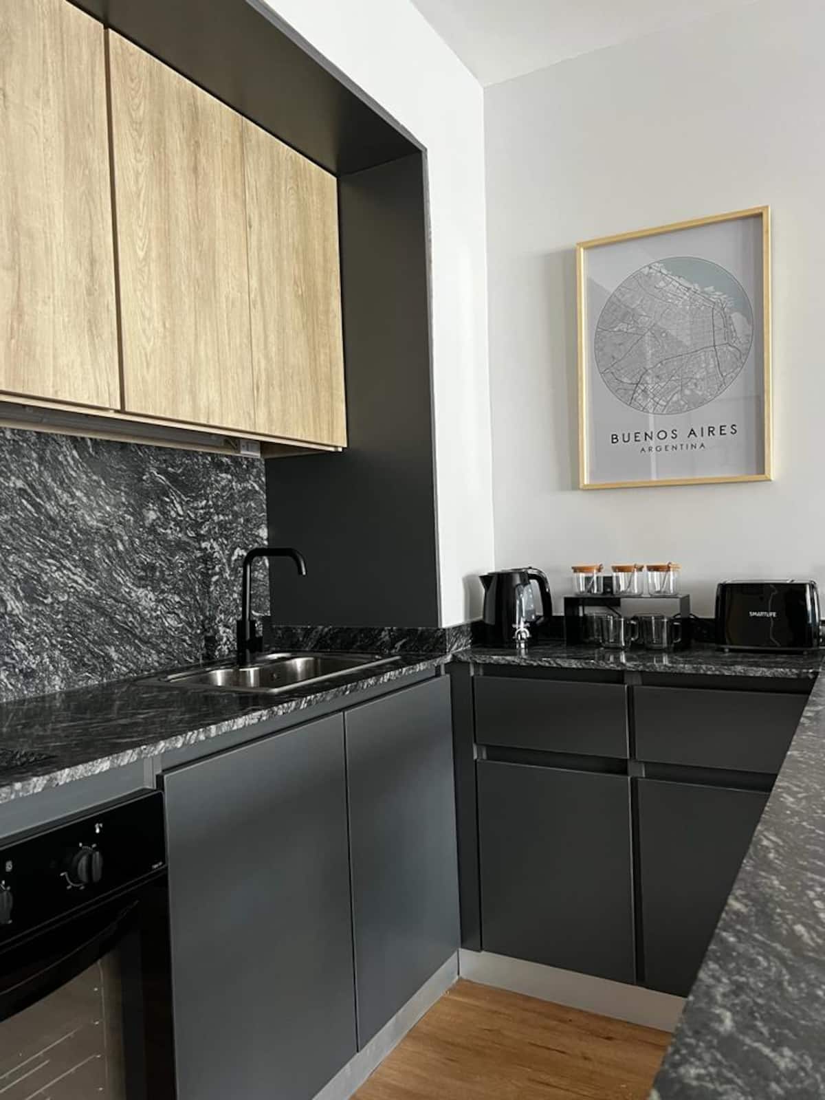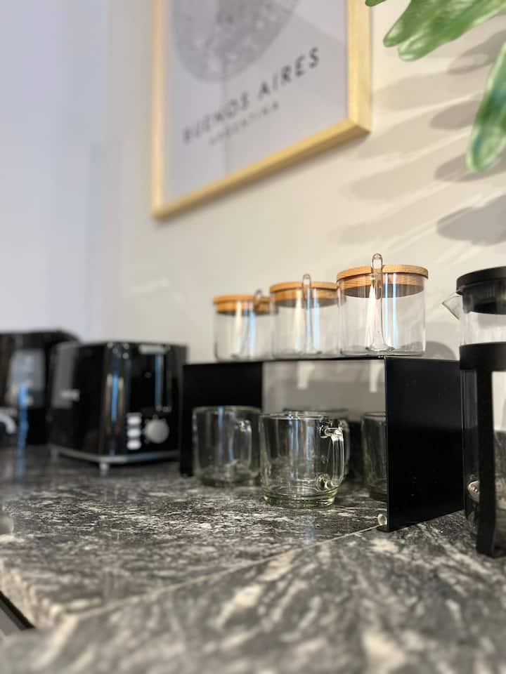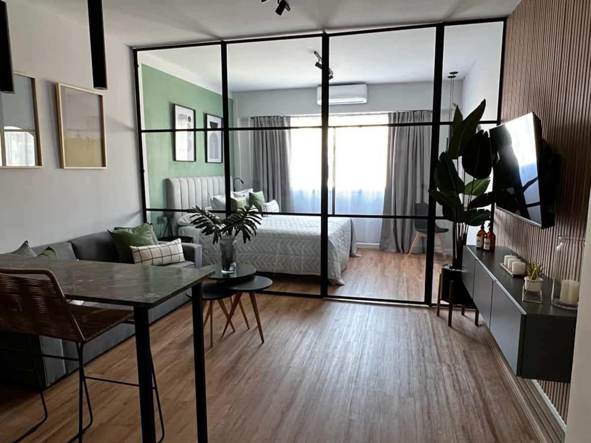 Квартира после полной отделки в районе San Nicolás, на Av. Corrientes, в 1 квартале от Obelisco. Круглосуточная охрана. В квартире есть кондиционер и отопление, кабельное ТВ и высокоскоростной интернет с Wi‑Fi, центральное горячее водоснабжение. Предусмотрены электрочайник, духовка и холодильник, посуда и кухонная утварь, ванная комната, постельное бельё и полотенца, фен. Указаны услуги: еженедельная уборка для длительного проживания; также включены чай и кофе.