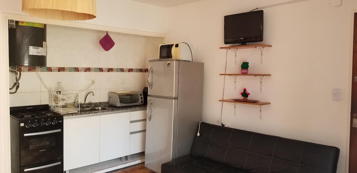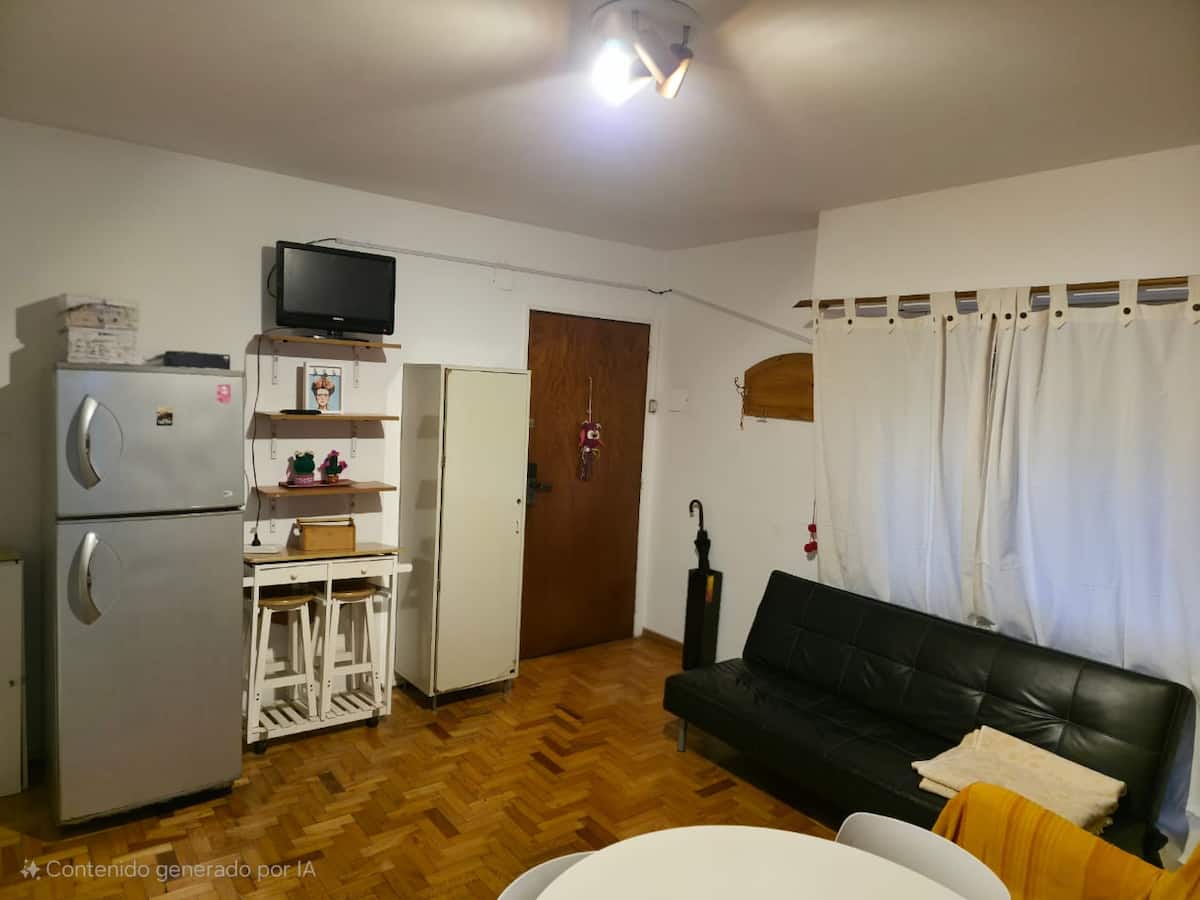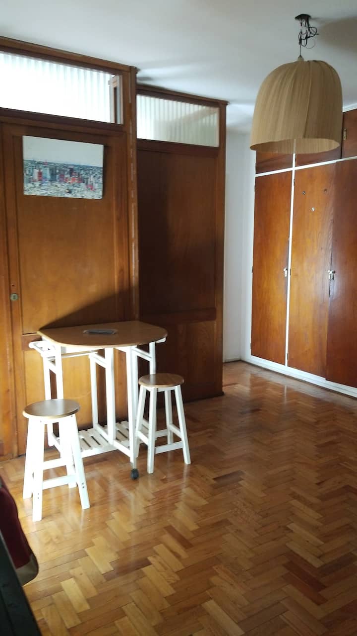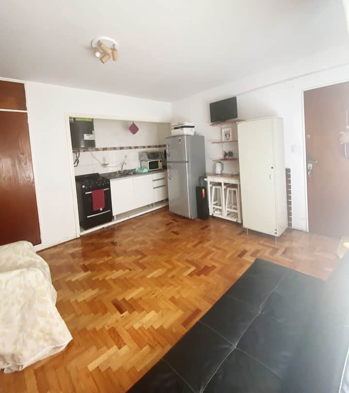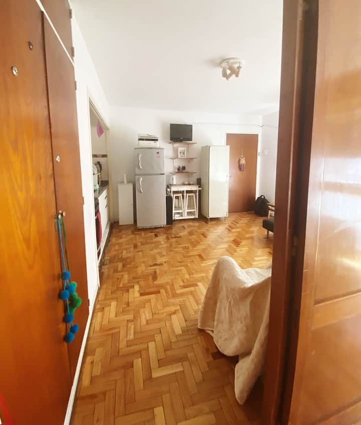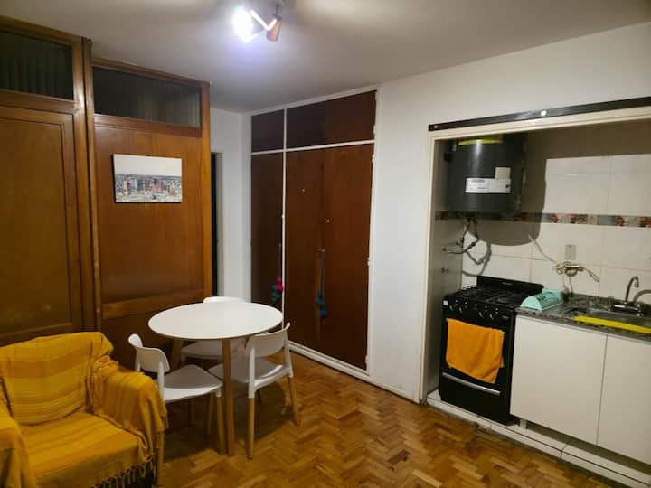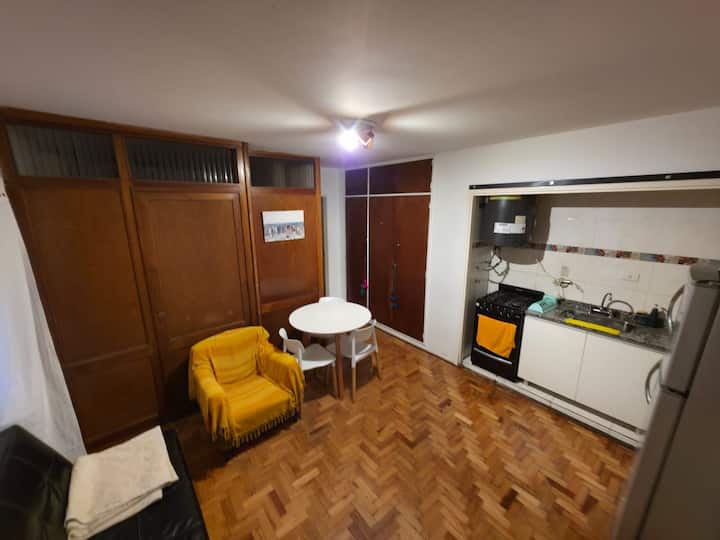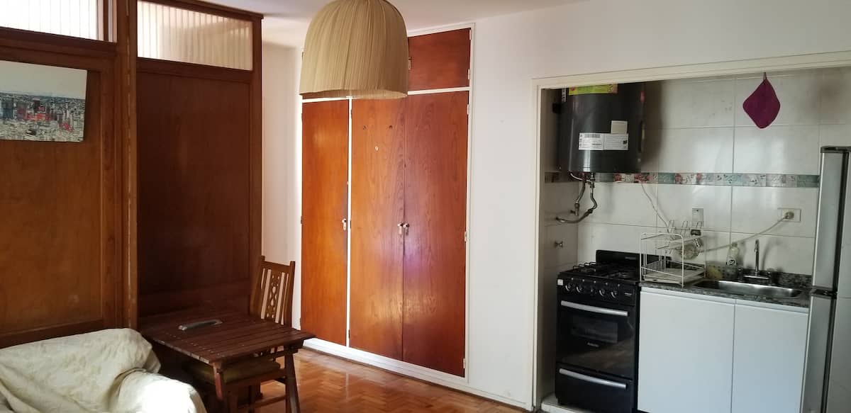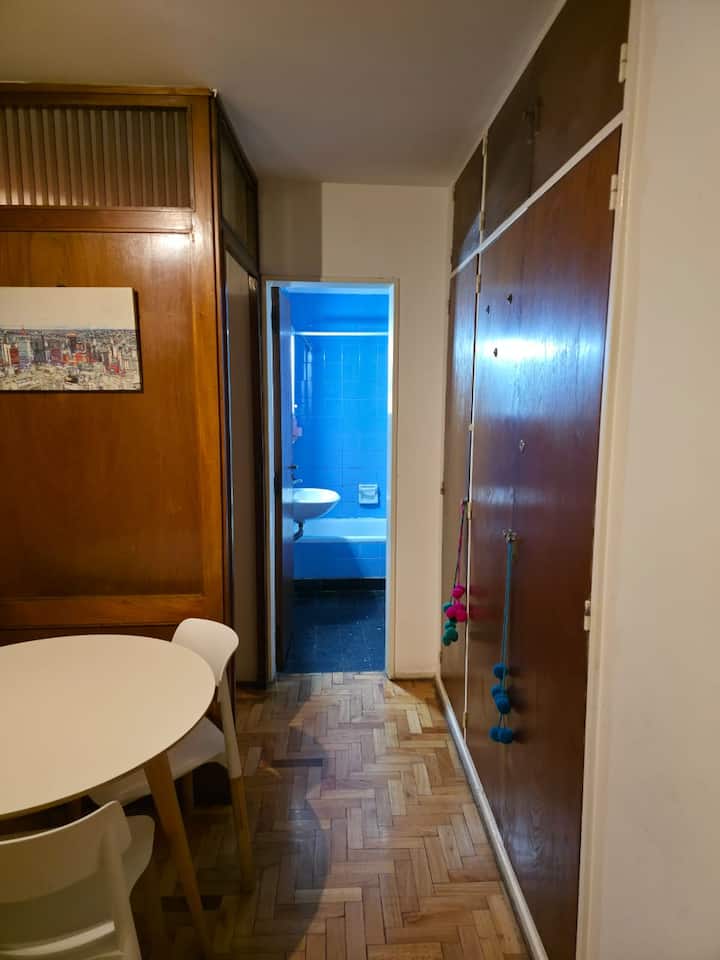 Квартира-студия с 1 спальней и кухней-«китченет» площадью 1,5 комнаты в San Nicolás, 3 квартала от Obelisco и театра Teatro Colón. Расположена на Av. Corrientes, рядом с входом станции метро Uruguay (линия B). В кухне-«китченет» есть микроволновая печь, холодильник и чайник. В ванной с ванной установлена двуспальная кровать и раскладной диван-кровать (трёхсекционный).