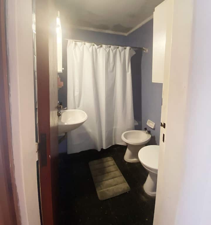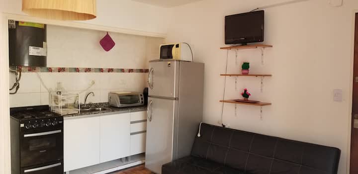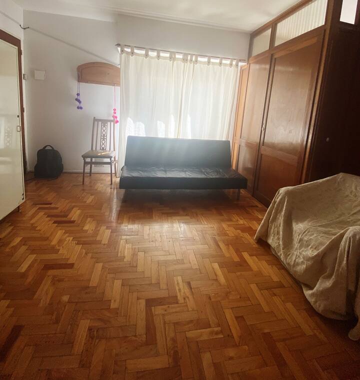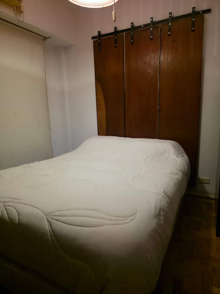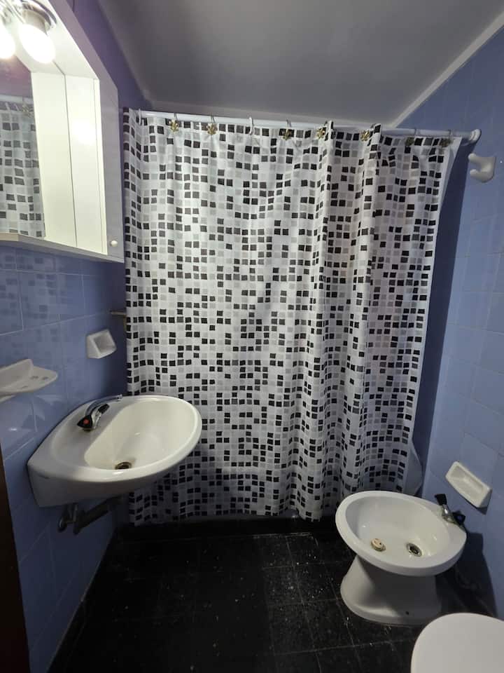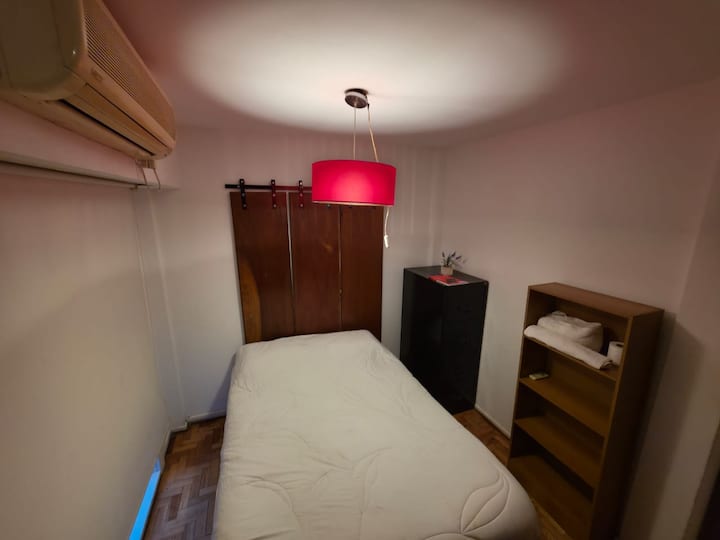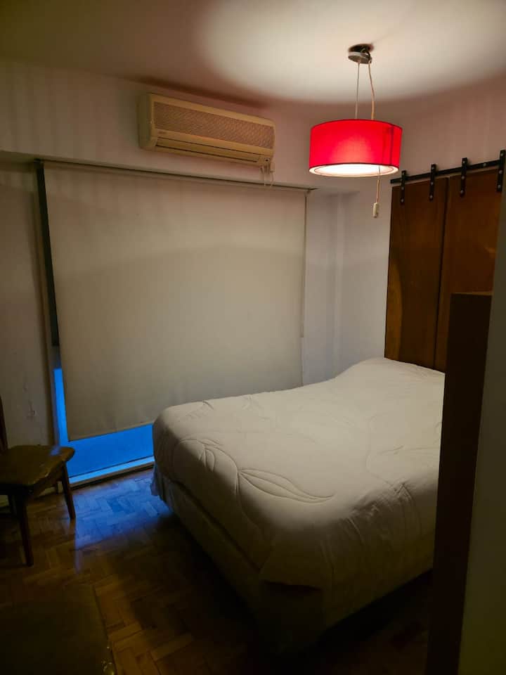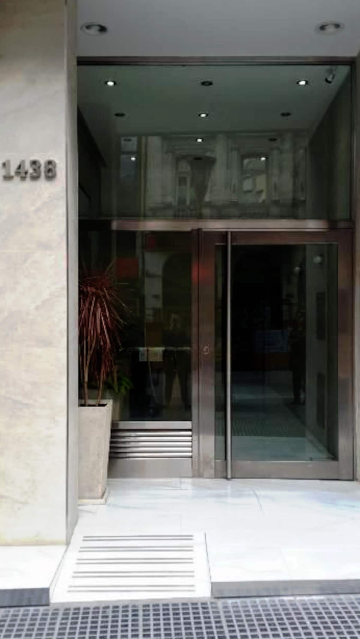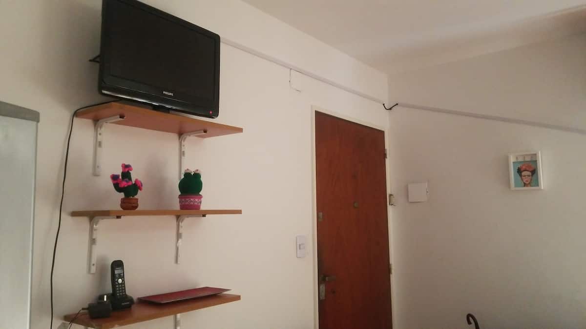 Квартира-студия с 1 спальней и кухней-«китченет» площадью 1,5 комнаты в San Nicolás, 3 квартала от Obelisco и театра Teatro Colón. Расположена на Av. Corrientes, рядом с входом станции метро Uruguay (линия B). В кухне-«китченет» есть микроволновая печь, холодильник и чайник. В ванной с ванной установлена двуспальная кровать и раскладной диван-кровать (трёхсекционный).