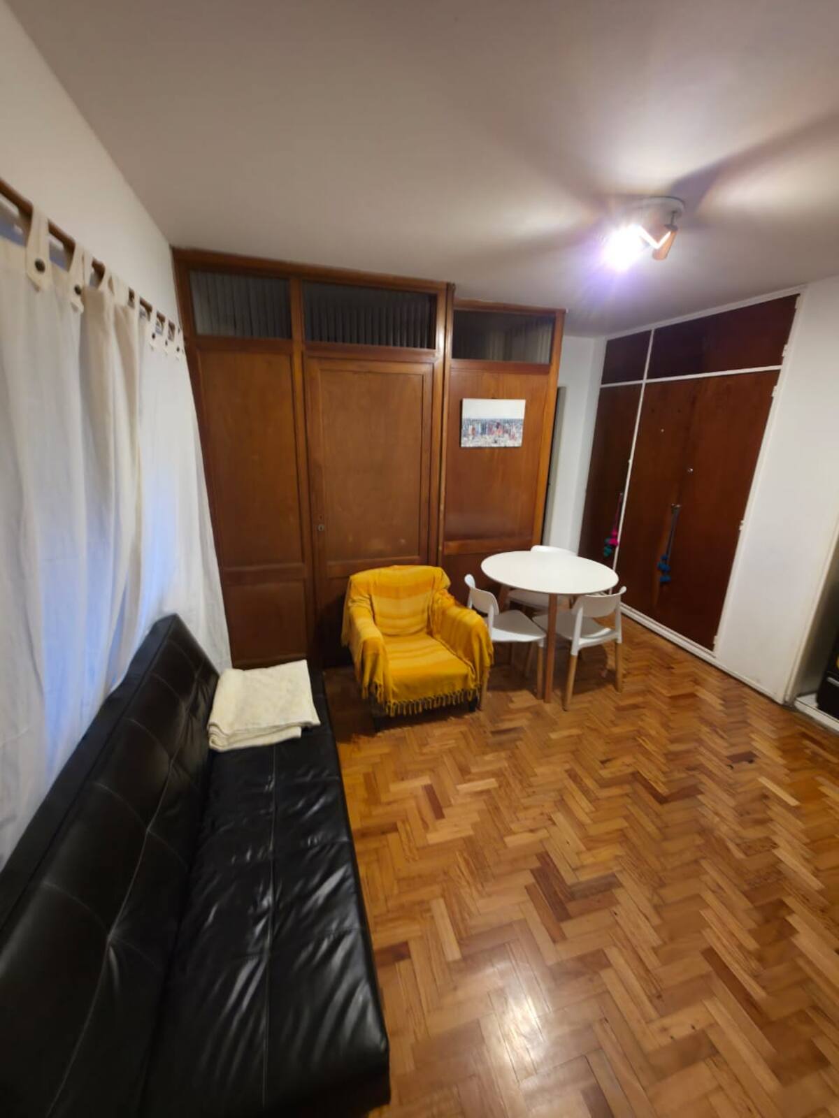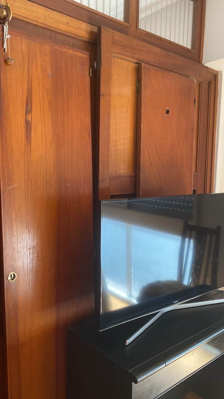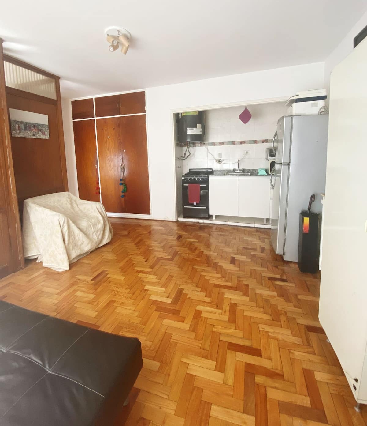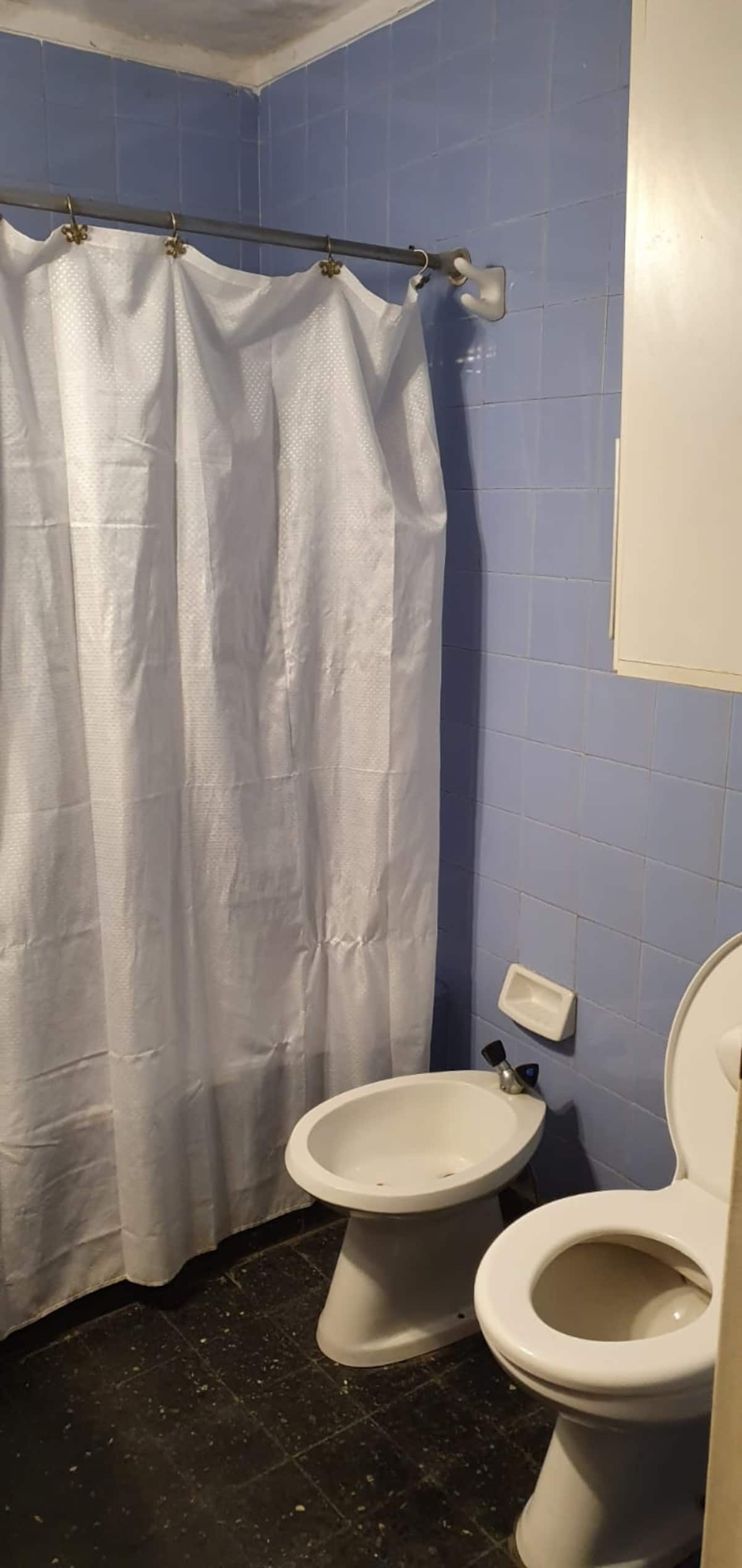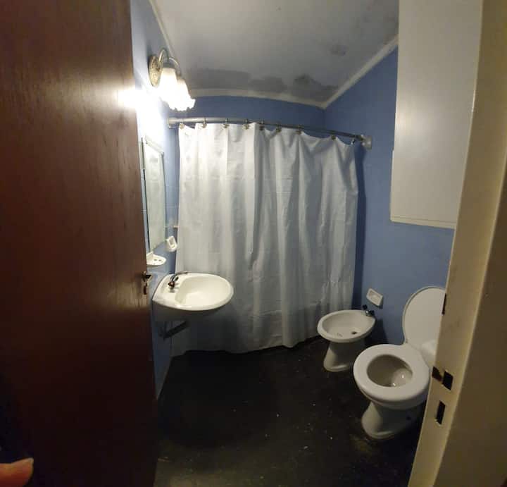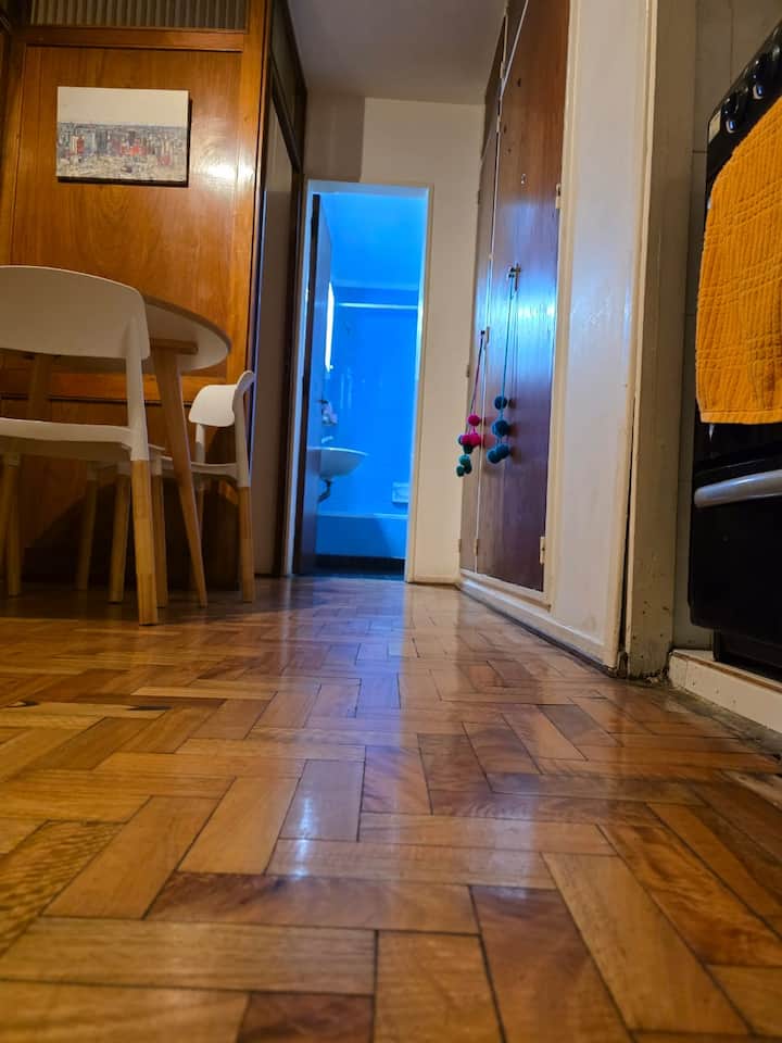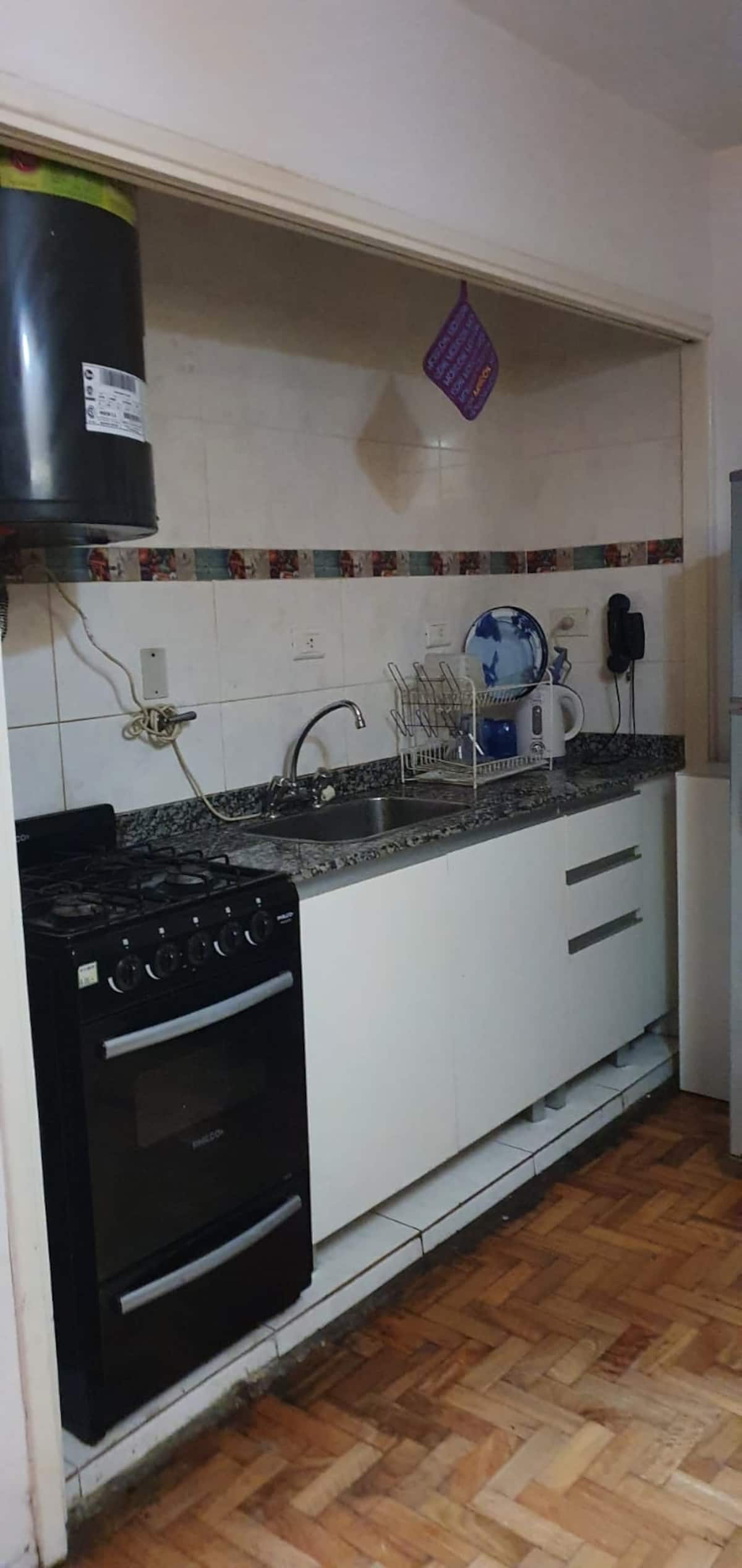 Квартира-студия с 1 спальней и кухней-«китченет» площадью 1,5 комнаты в San Nicolás, 3 квартала от Obelisco и театра Teatro Colón. Расположена на Av. Corrientes, рядом с входом станции метро Uruguay (линия B). В кухне-«китченет» есть микроволновая печь, холодильник и чайник. В ванной с ванной установлена двуспальная кровать и раскладной диван-кровать (трёхсекционный).