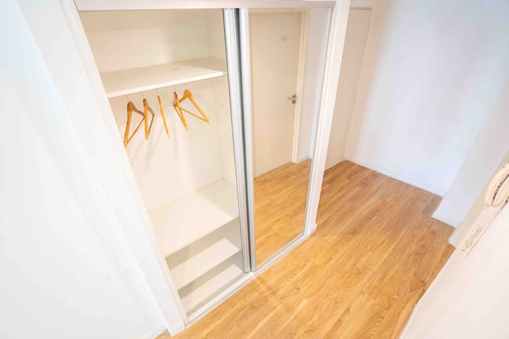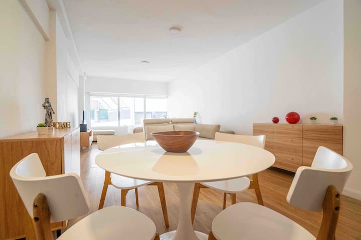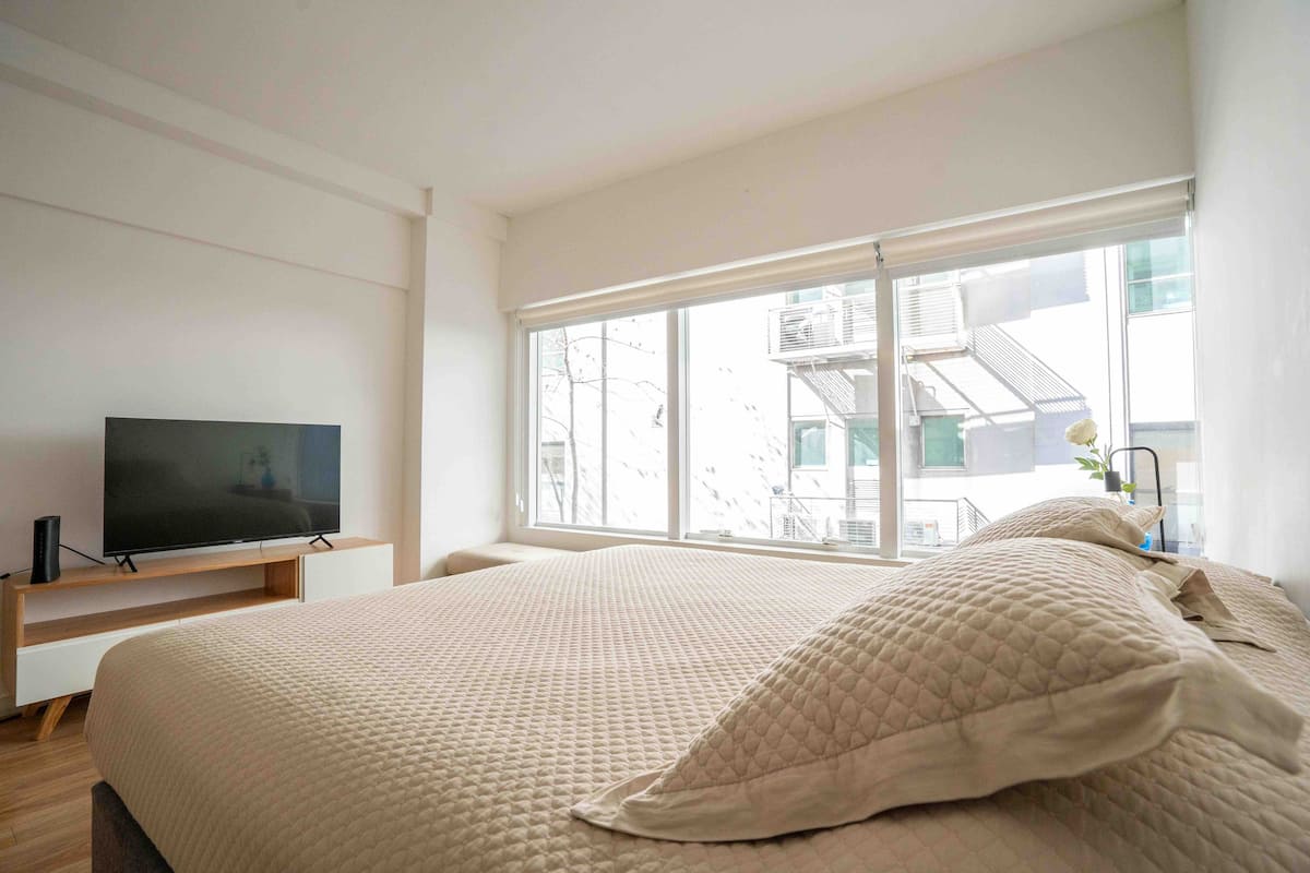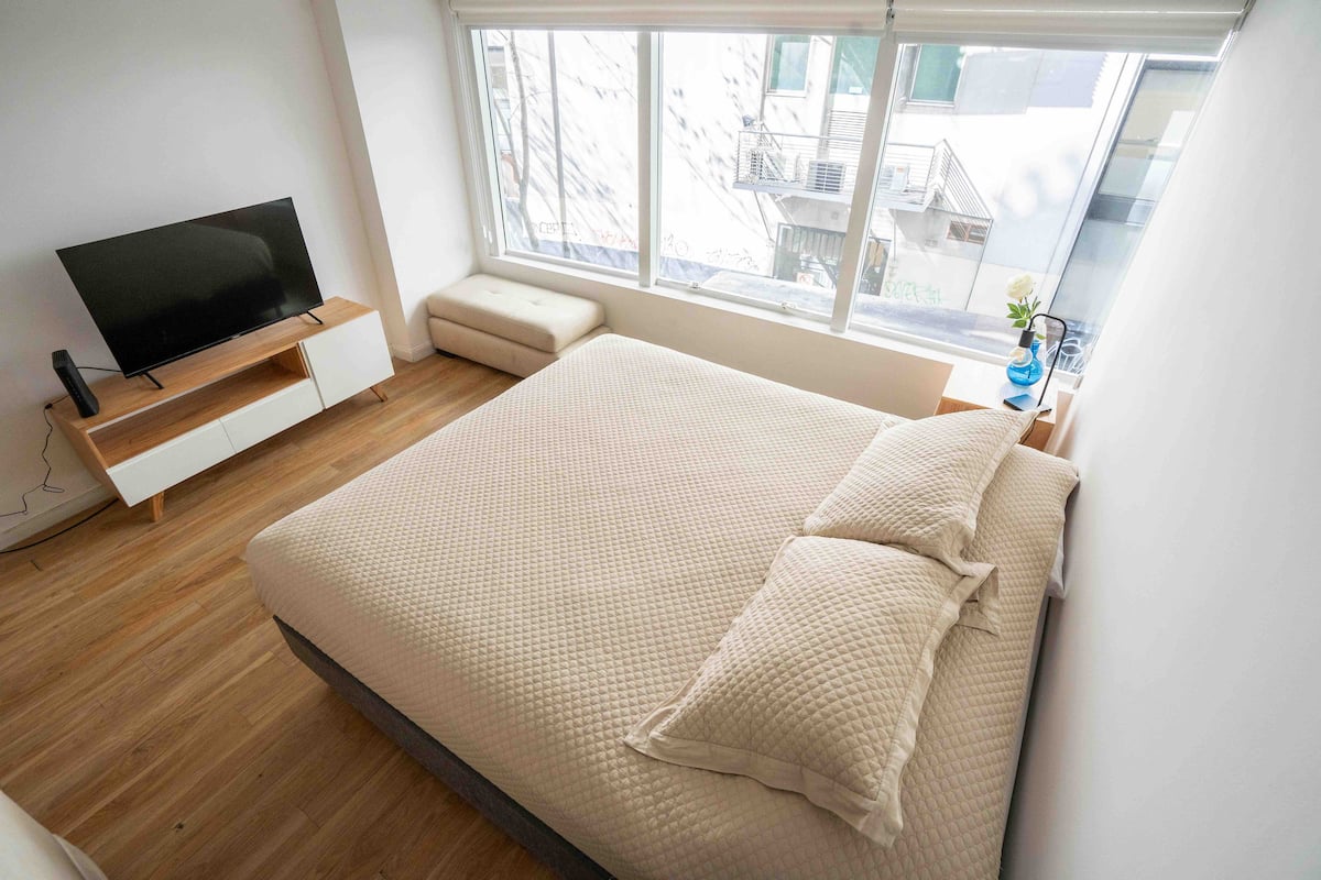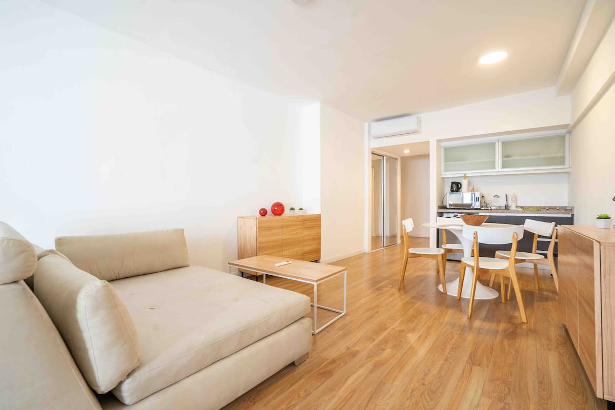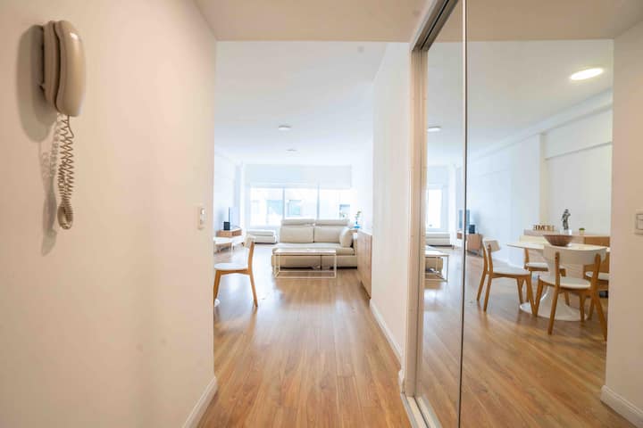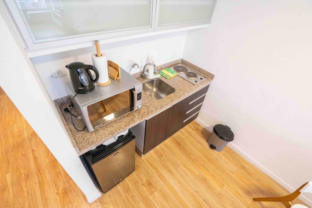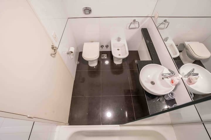 Квартира в центре Buenos Aires с двуспальной кроватью (queen-size), большой тумбовой зоной (кресло) и видом на тихую пешеходную улицу. Ванная комната с полотенцами включена, есть кондиционер с функцией обогрева/охлаждения. Кухня оборудована 2 электрическими конфорками, микроволновой печью, электрочайником и холодильником. В здании предусмотрена круглосуточная охрана, есть крытая парковка за отдельную плату; доступен самостоятельный заезд. До метро Línea B около 50 метров, рядом театрá на Av. Cor