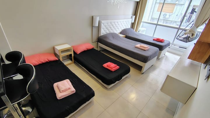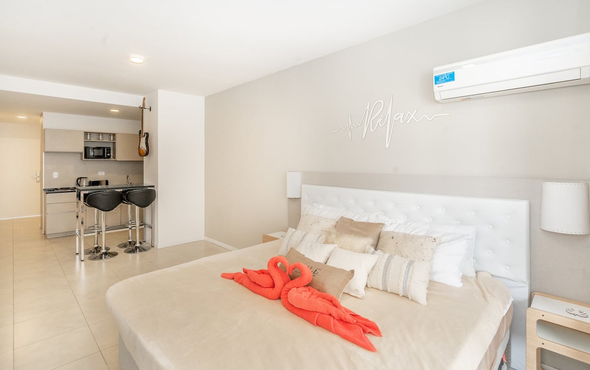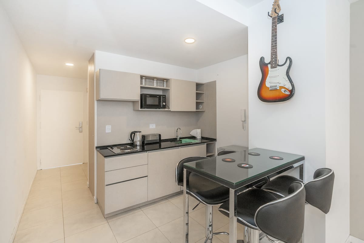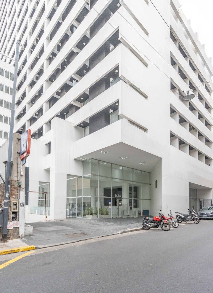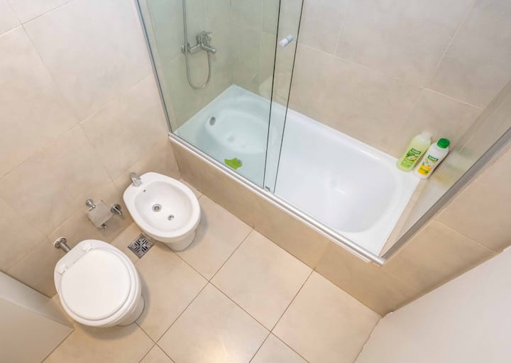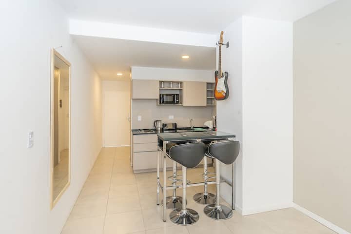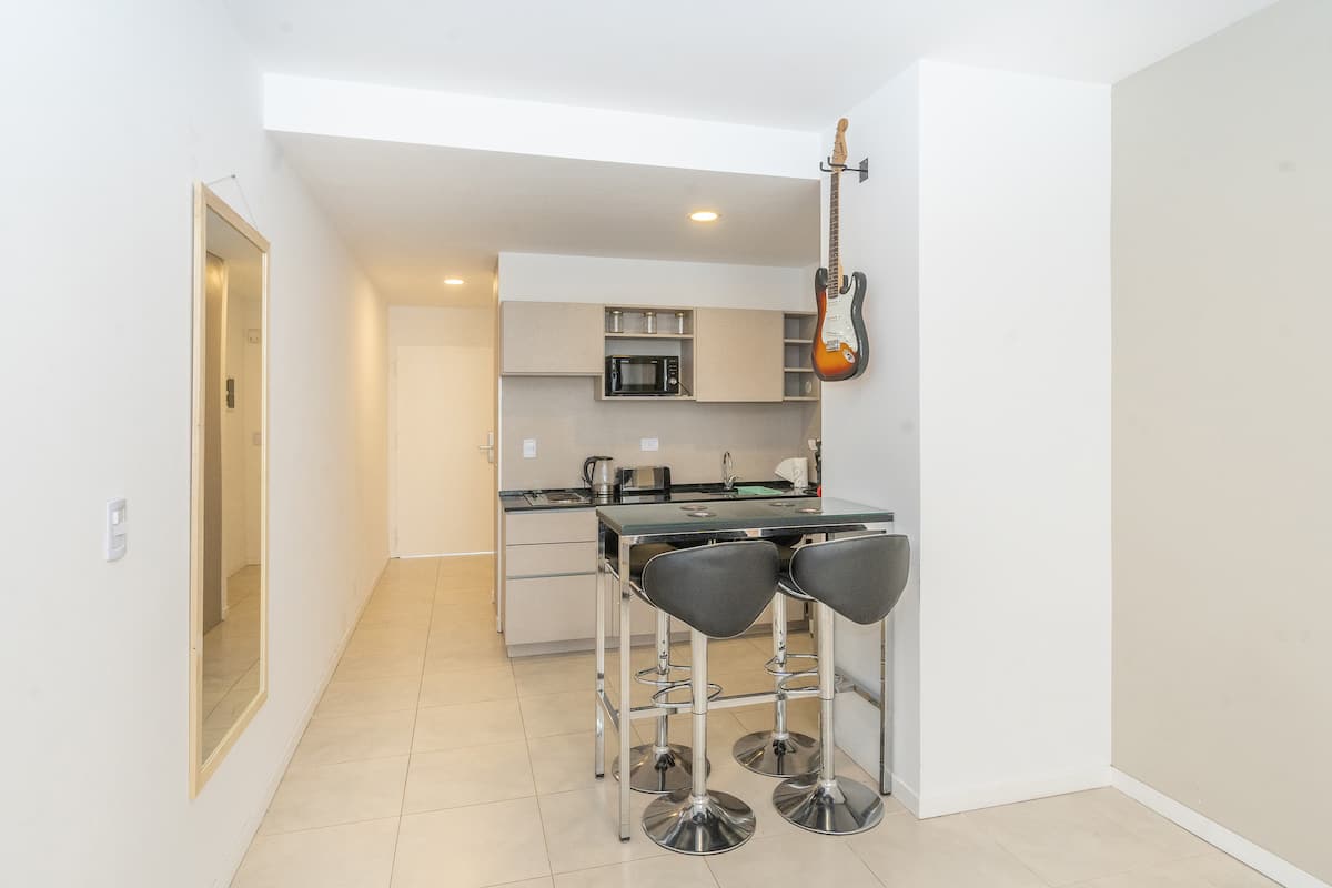 Квартира в San Nicolás на улице Mitre. В распоряжении полностью оборудованная кухня (плита, холодильник, микроволновая печь, электрочайник, тостер, посуда) и гостиная-столовая с обеденной барной стойкой на 4 места, Smart TV и кондиционером с обогревом. В ванной комнате ванна, душ, биде, тумба и зеркало. В здании предусмотрены сезонный бассейн (только в летний период), прачечная со сменами и хранение багажа при наличии. Есть Wi‑Fi; в стоимость не включены расходы на прачечную (указано как с допла