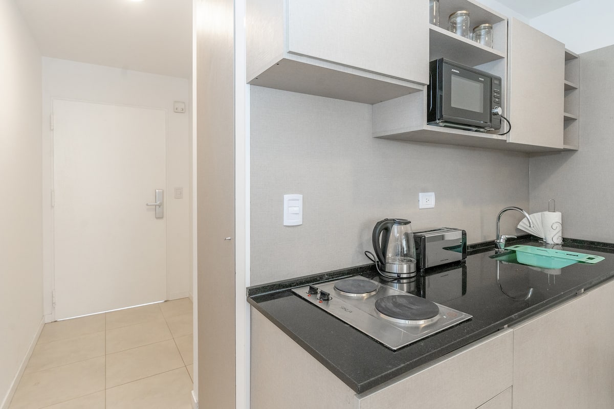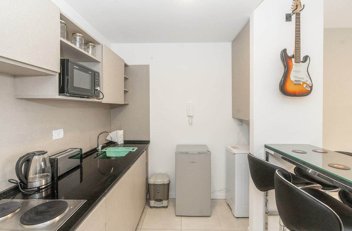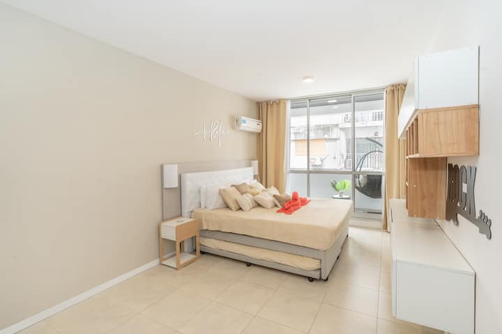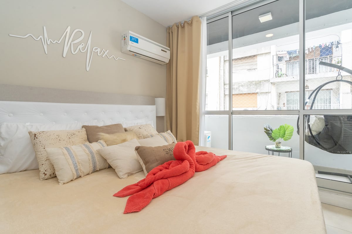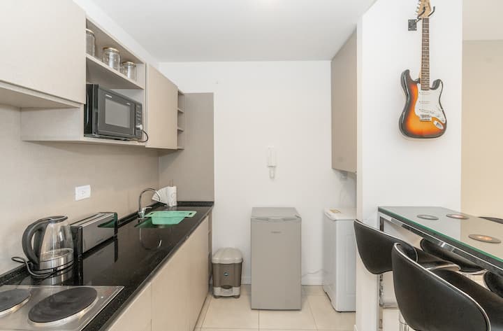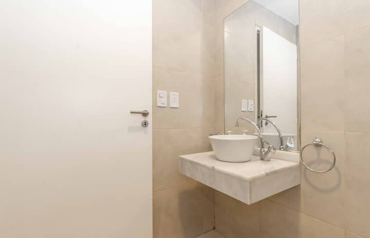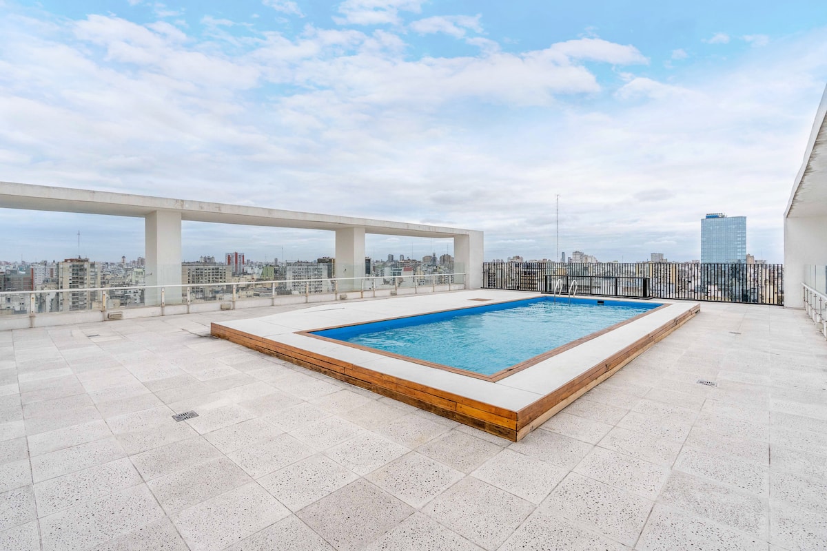Квартира в San Nicolás на улице Mitre. В распоряжении полностью оборудованная кухня (плита, холодильник, микроволновая печь, электрочайник, тостер, посуда) и гостиная-столовая с обеденной барной стойкой на 4 места, Smart TV и кондиционером с обогревом. В ванной комнате ванна, душ, биде, тумба и зеркало. В здании предусмотрены сезонный бассейн (только в летний период), прачечная со сменами и хранение багажа при наличии. Есть Wi‑Fi; в стоимость не включены расходы на прачечную (указано как с допла