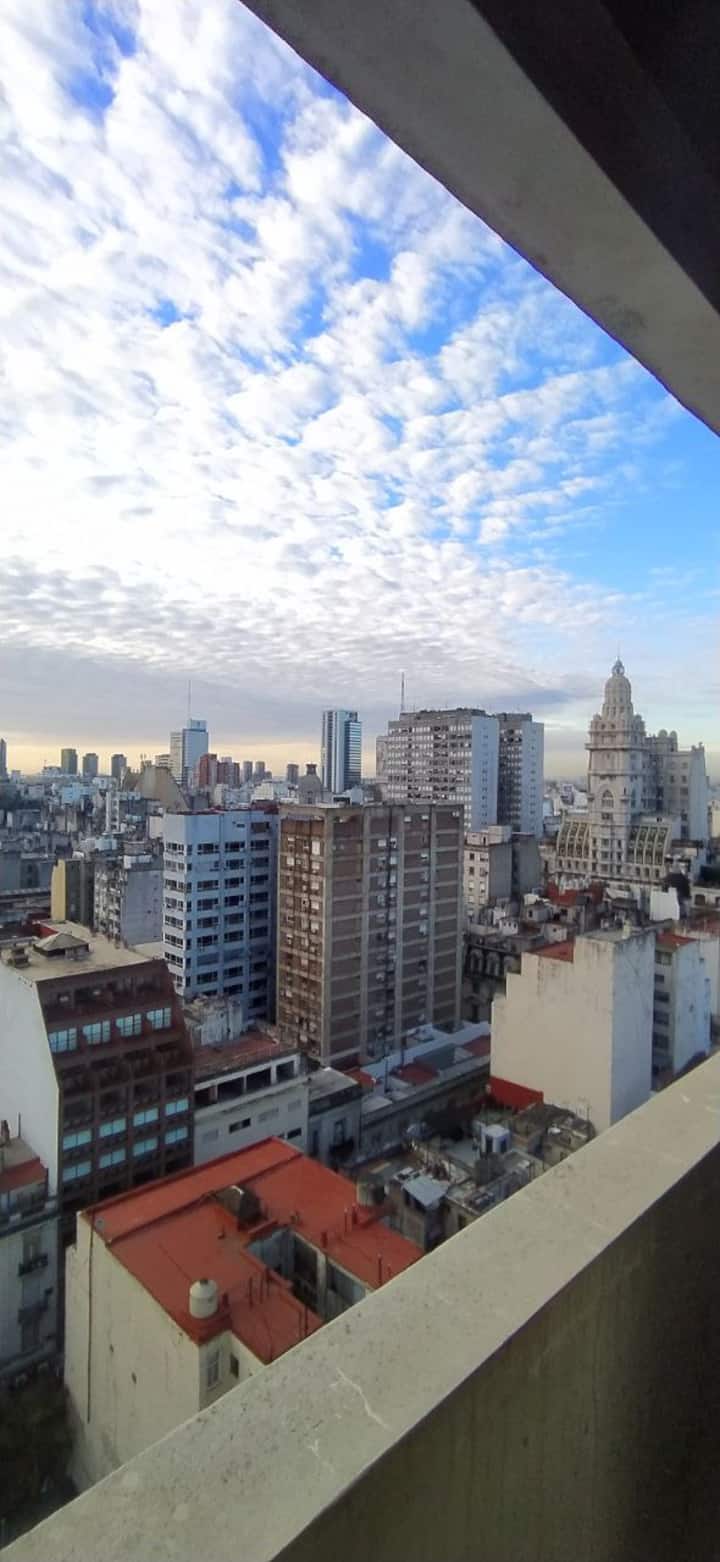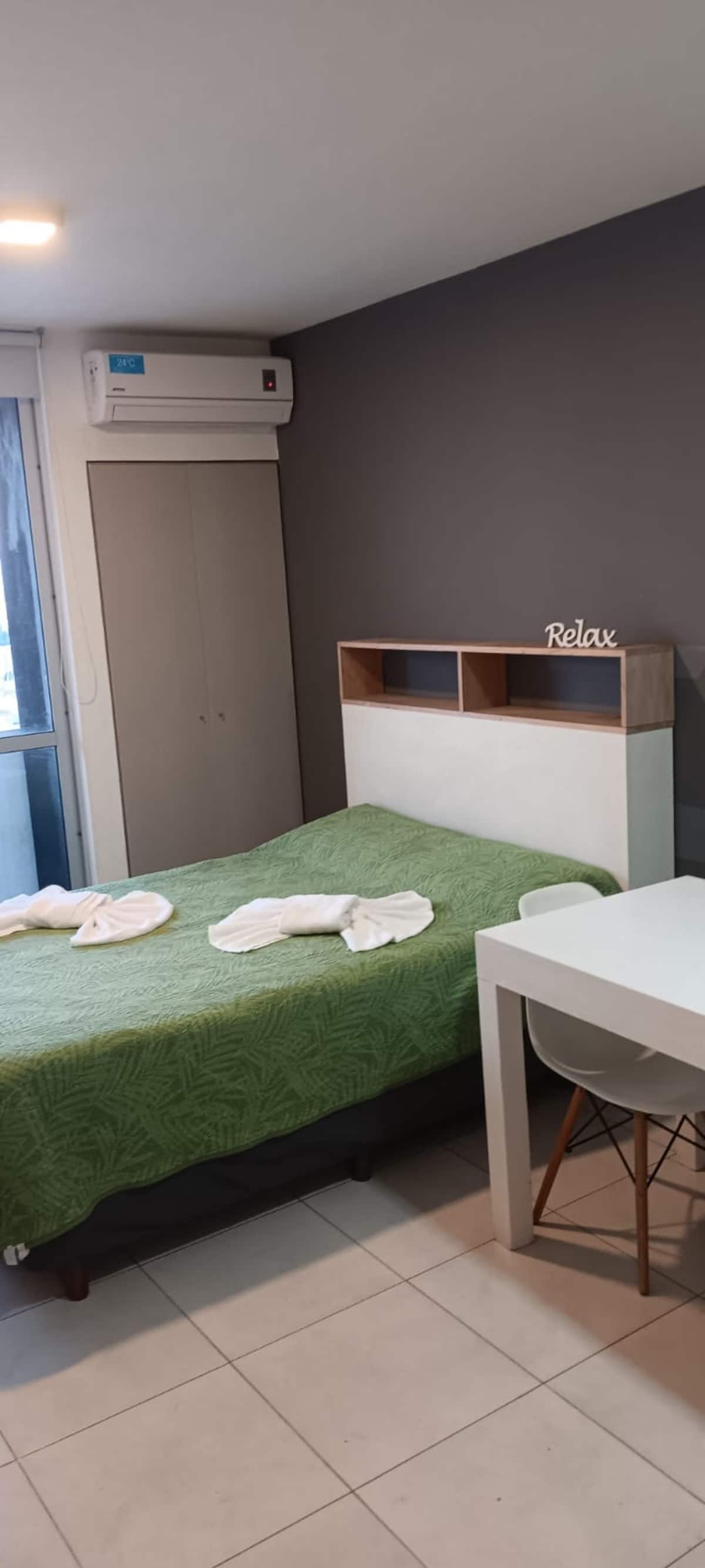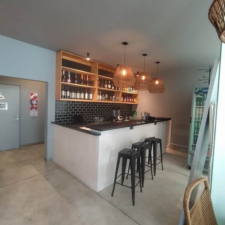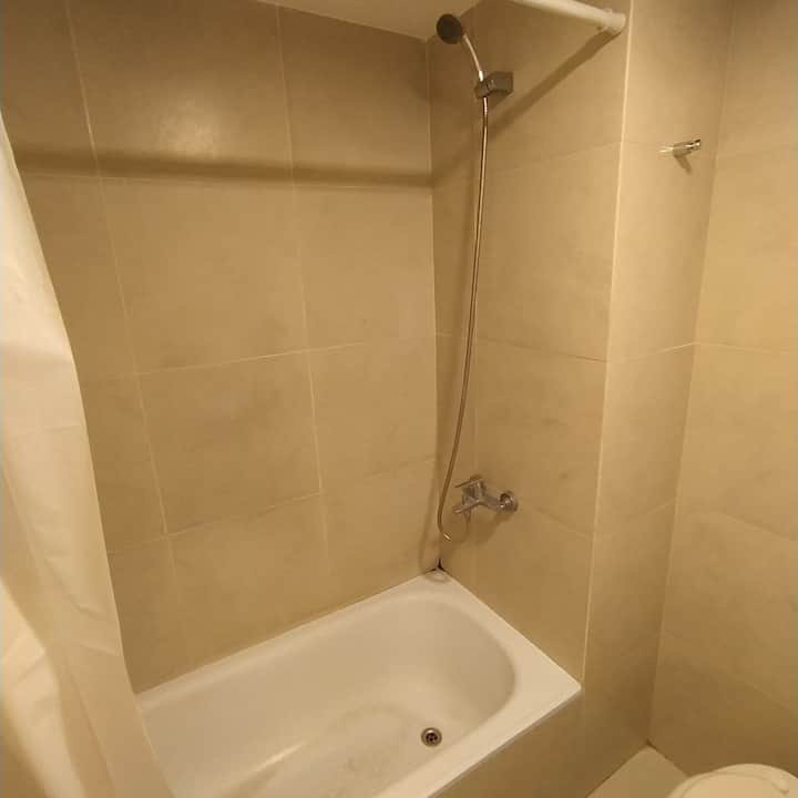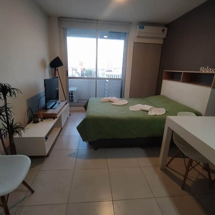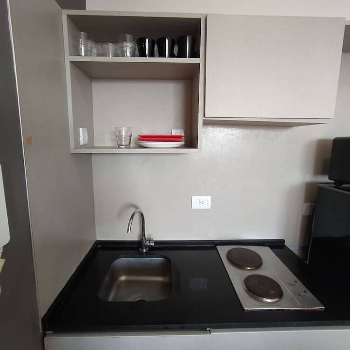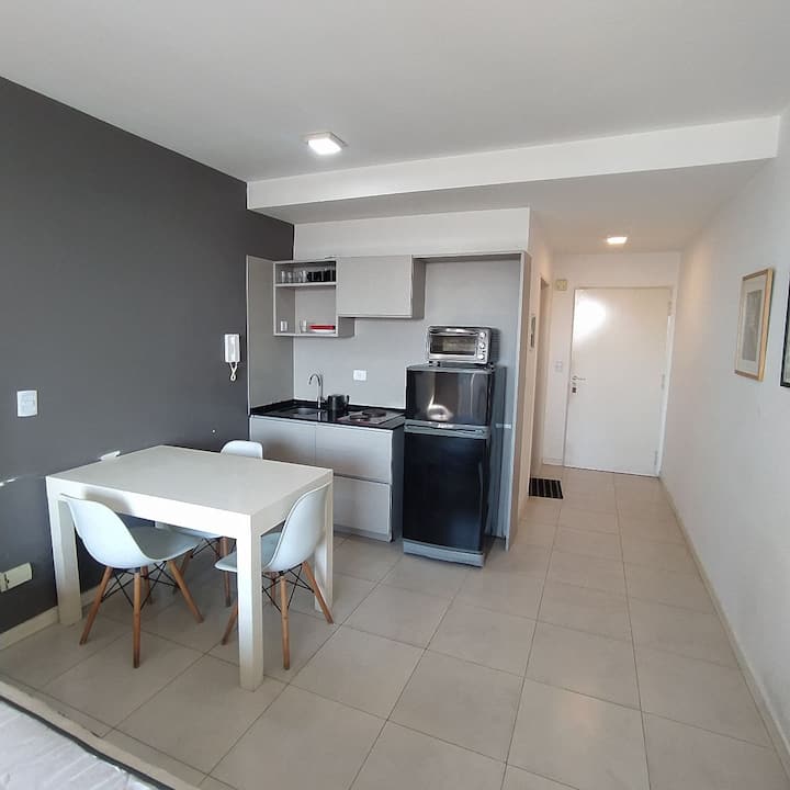 Квартира в современном здании в San Nicolás. В планировке 1 спальня, двуспальная кровать, телевизор с кабельными каналами, модем Wi‑Fi, шкаф и обеденный стол с стульями. Кухня с бойлером, холодильником, базовой посудой, чайником, сковородой и электрической духовкой; под столешницей электрическая плита не работает, вместо неё предусмотрена электрическая сковорода для готовки. Ванная комната в личном пользовании с ванной, полотенцами, феном, шампунем, кондиционером и туалетным мылом; биде не работ