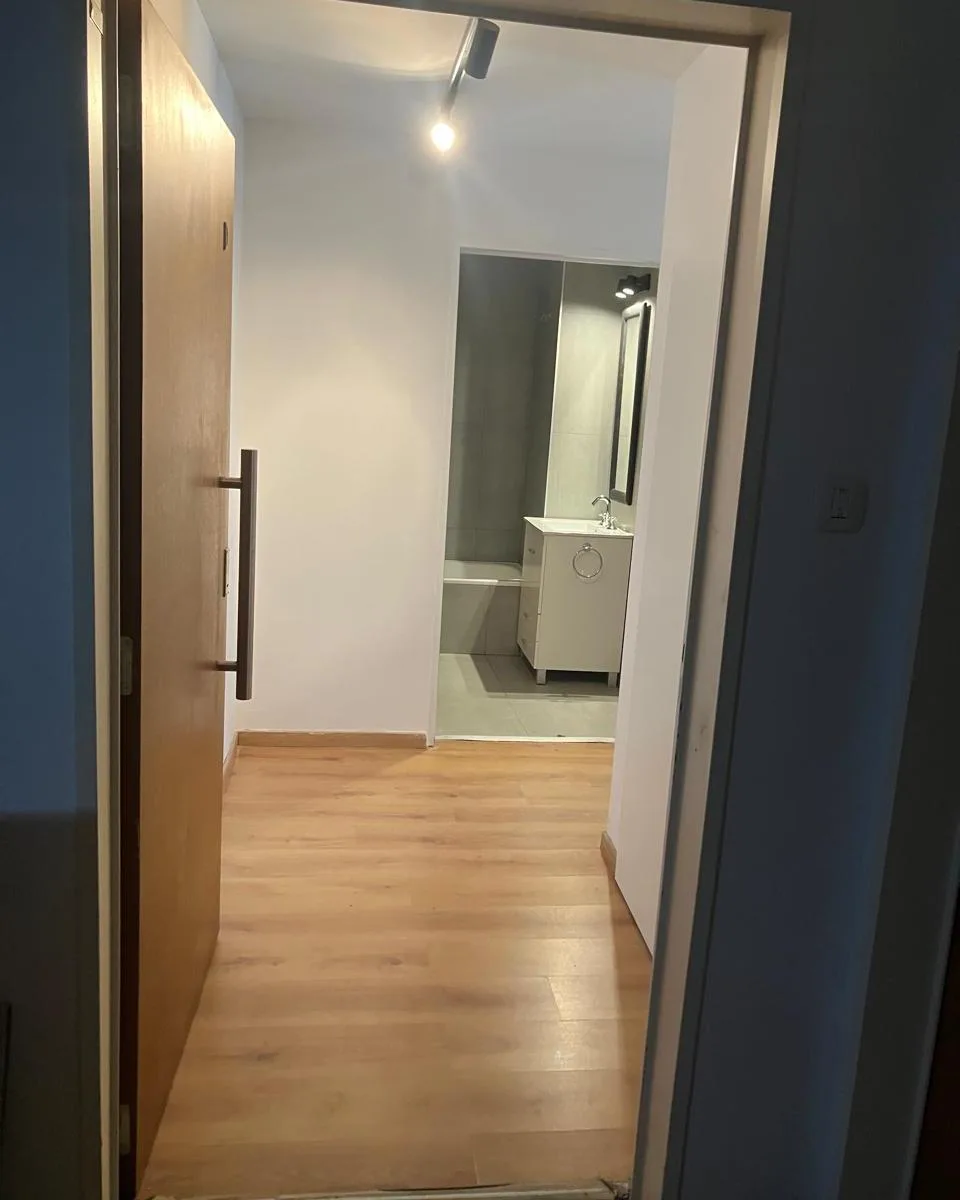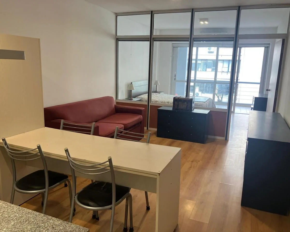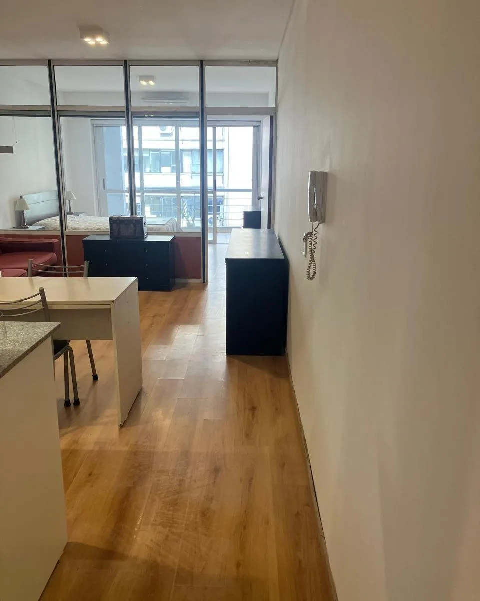 Квартира 2 ambientes площадью 45 m² (38,5 m² крытых и 6,5 m² полукрытых) в новом доме, 5-й этаж, окна на улицу. Ориентация восток, с кондиционером (холод/тепло) и центральной горячей водой. В квартире сделан ремонт, установлены электрическая варочная панель с духовкой, светильники. Из общих удобств указаны бассейн, большая зона солярия, зона гриля, SUM и прачечная, также работает охрана 24 часа. Аренда возможна с мебелью или без мебели по выбору. В объявлении указано, что expensas включают AYSA;