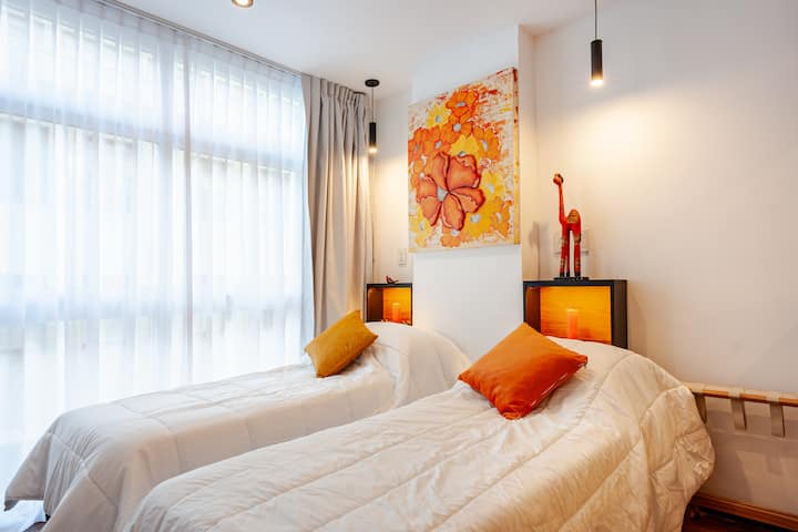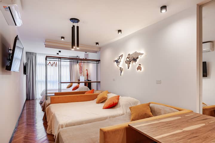 Квартира в San Nicolás. Окна выходят на центральные улицы; в описании указано расположение в пешей доступности от Obelisk и торговых районов. В объявлении говорится, что в одном здании расположен комплекс из 4 идентичных квартир, которые можно арендовать по отдельности или в сочетании в зависимости от потребностей. Расстояния указаны как 50 метров до пешеходной улицы Florida, 100 метров до пешеходной улицы Lavalle, 200 метров до Av. Corrientes, 500 метров до Obelisk и 200 метров до Galerias Pací