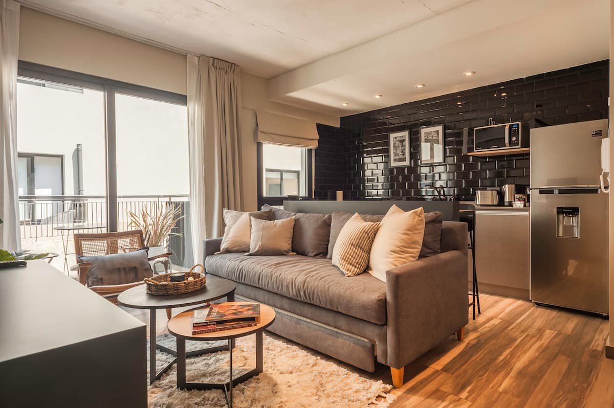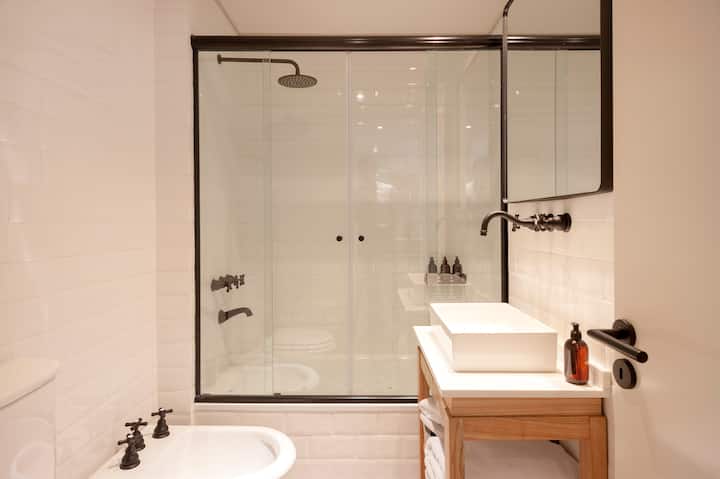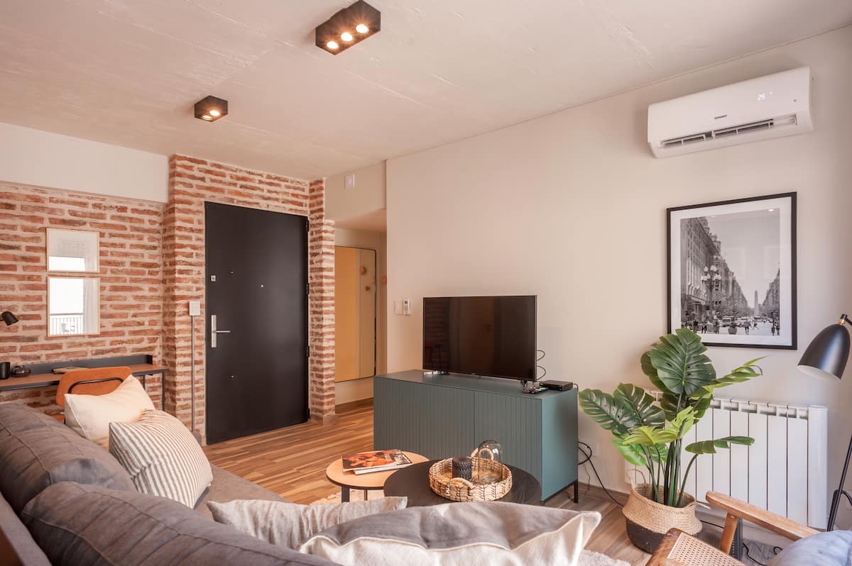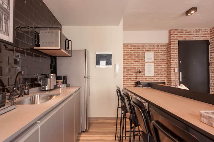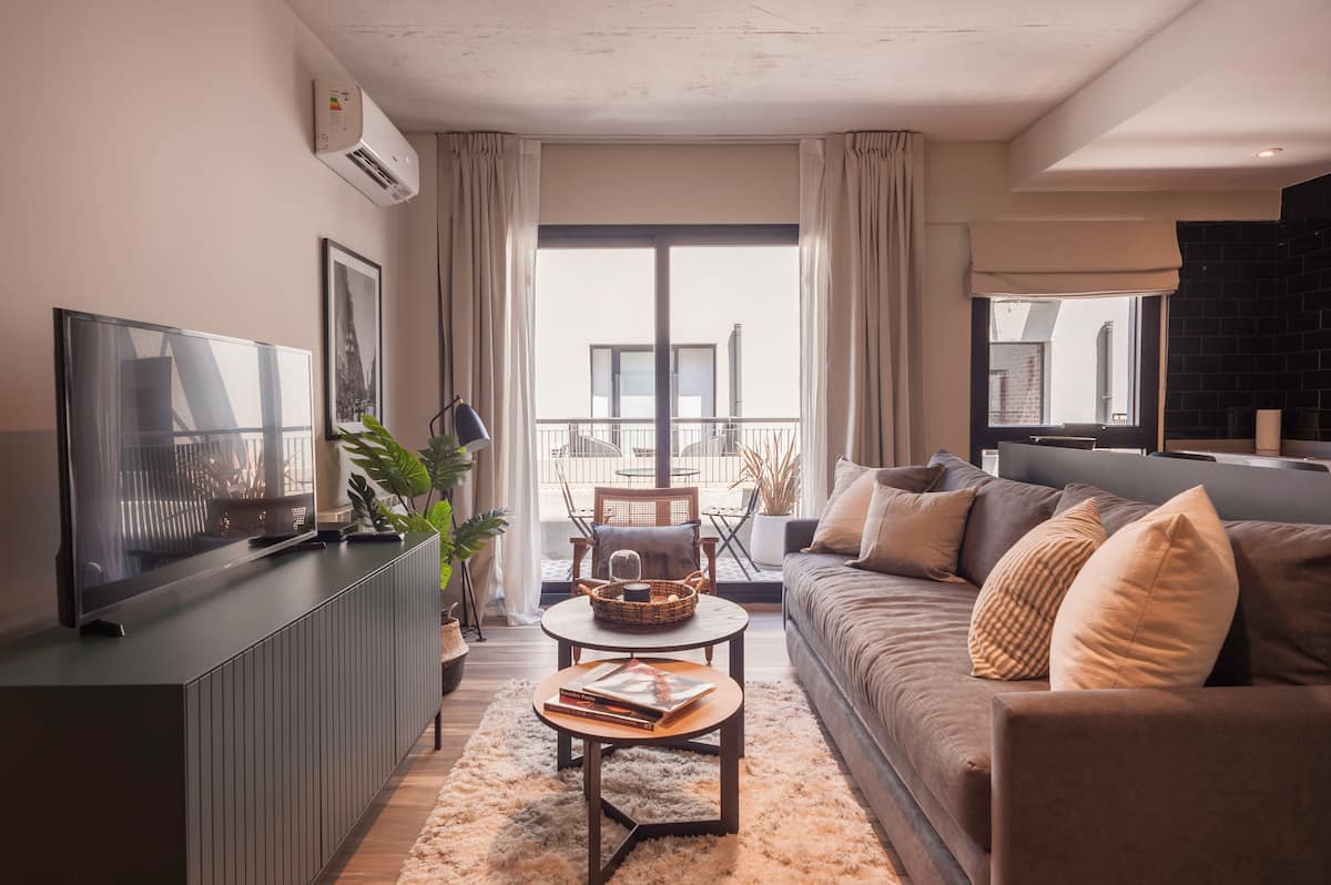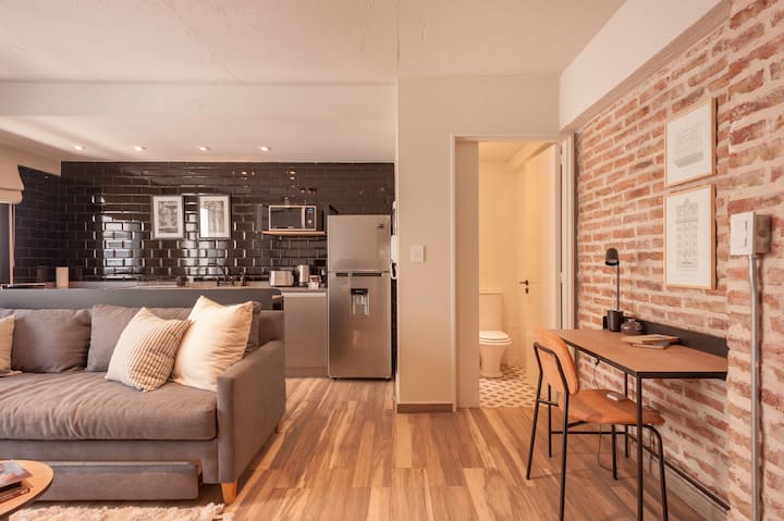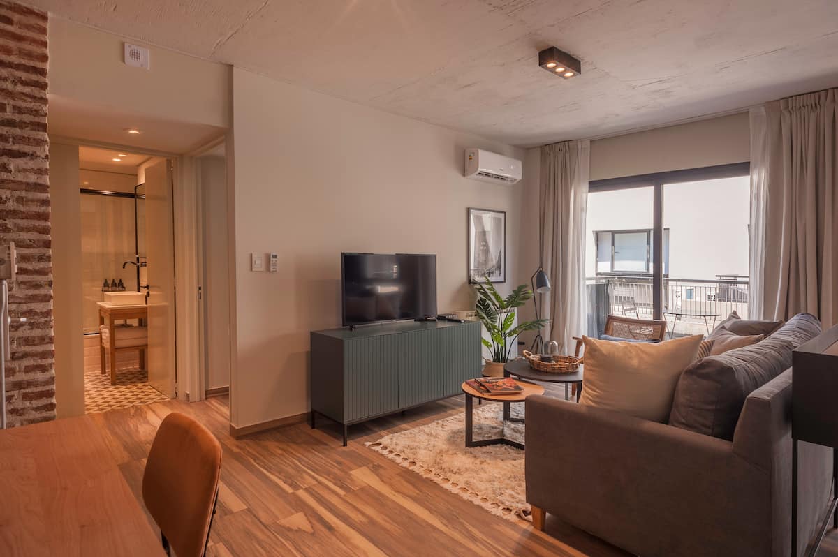 Квартира с 1 спальней в La Galerie в San Telmo: есть полноценная ванная комната, гостиная, интегрированная кухня, балкон и гостевой туалет. Апартамент с мебелью и оборудованием для проживания, включая телевизор с функцией smart TV, Wi‑Fi, сейф, электрическую турку, тостер и кофеварку, а также фен, постельное бельё и полотенца. В здании предусмотрены зоны коворкинга, бассейн, солярий, SUM, зона гриля, прачечная, спортзал и охрана 24 часа. Гости могут пользоваться прачечной, бассейном, солярием, с