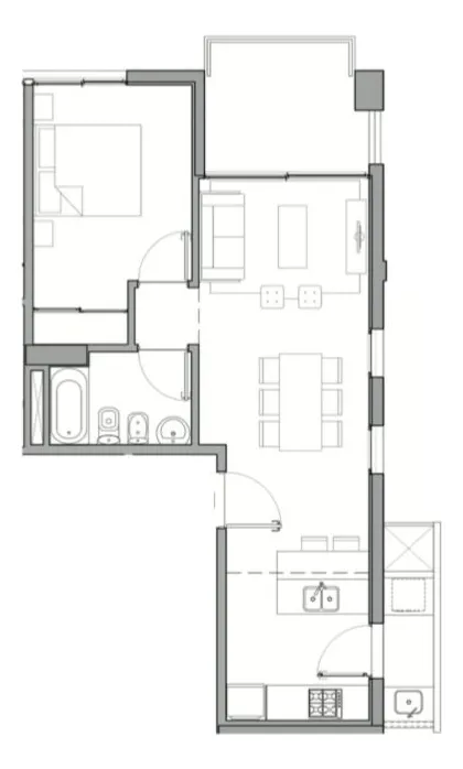 Квартира в Tigre в Torre Cardón на улице Montes de Oca, окна с видом. Площадь 50 m² крытых и 63 m² общих. В планировке гостиная с интегрированной кухней, спальня с встроенным шкафом, полноценная ванная и балкон с открытым видом. В здании предусмотрены бассейн с солярием, зона гриля на открытом воздухе и прачечная. Указан вид на реку.