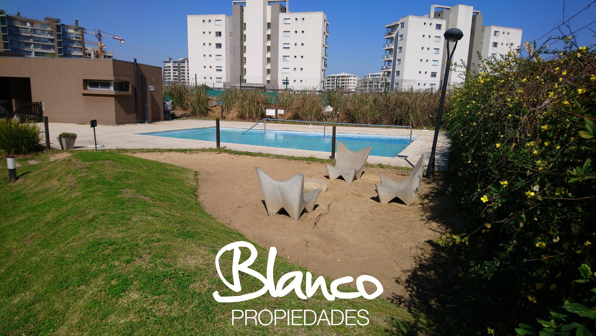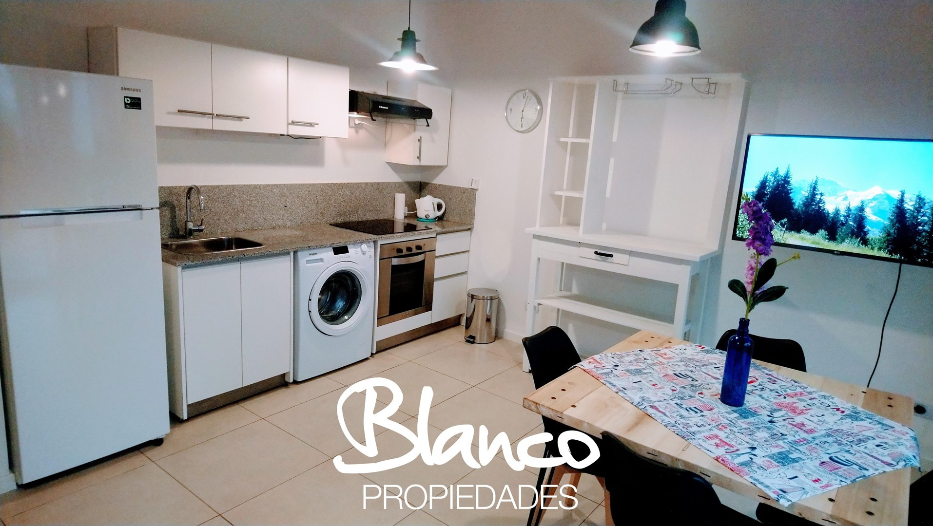 Двухкомнатная квартира в Nordelta Sendero (комплекс Lago del Sendero), в цокольном/на уровне первого этажа. Общая площадь и точные размеры не указаны; квартира с мебелью, окнами в сторону вида на водоём. Кухня объединена с гостиной-столовой; установлен варочная панель и электрическая духовка, стиральная машина, холодильник. В гостиной установлен сплит-кондиционер (холод/тепло) и телевизор; из гостиной выход на балкон-дек со зоной гриля. Спальня с широким окном, отдельная ванная комната. (Закрепл