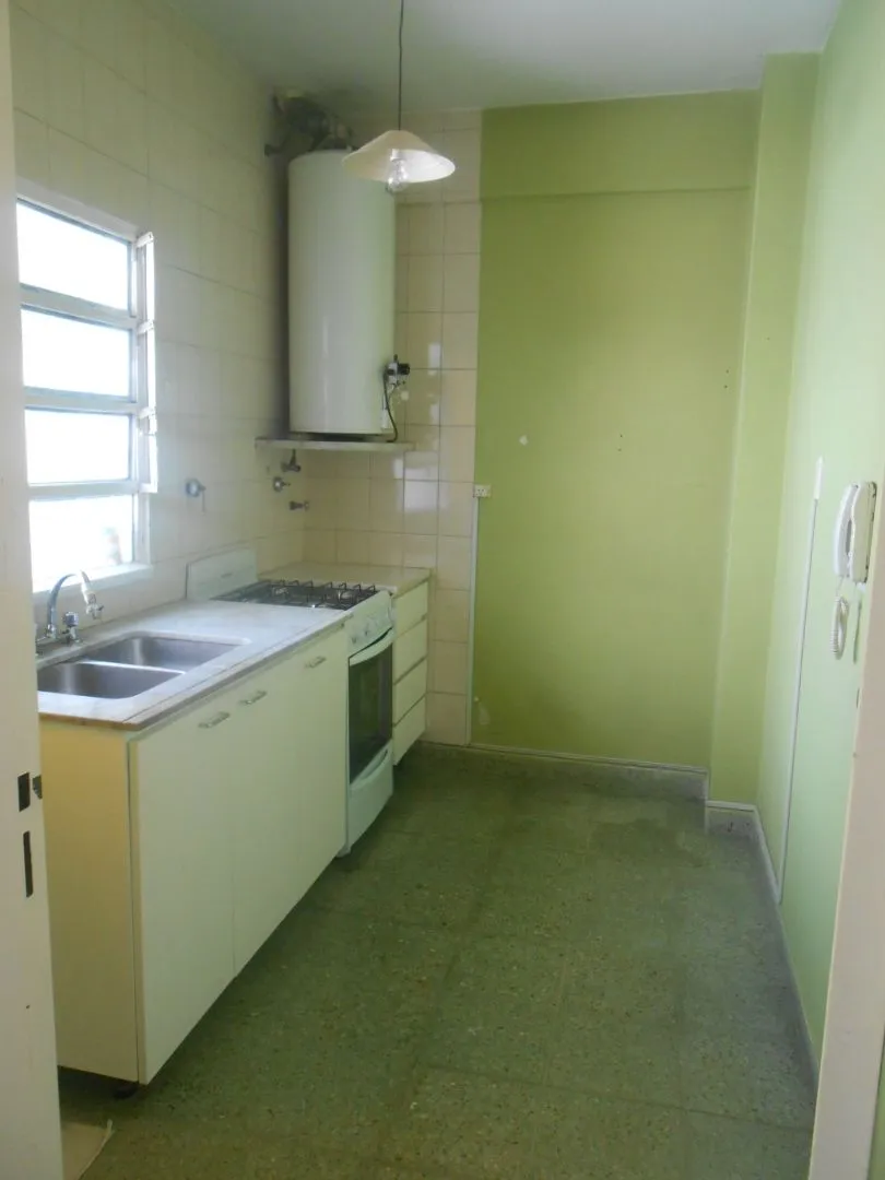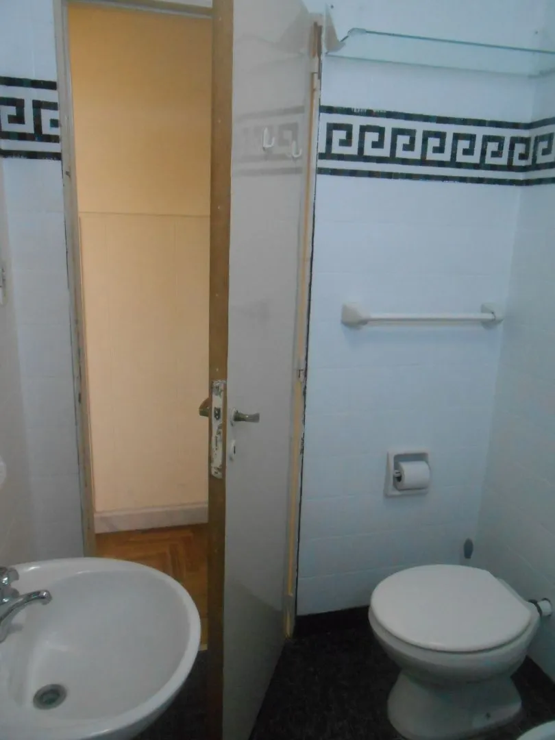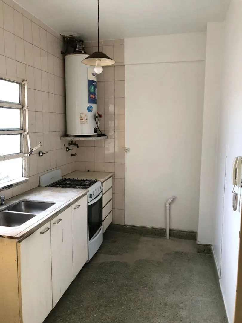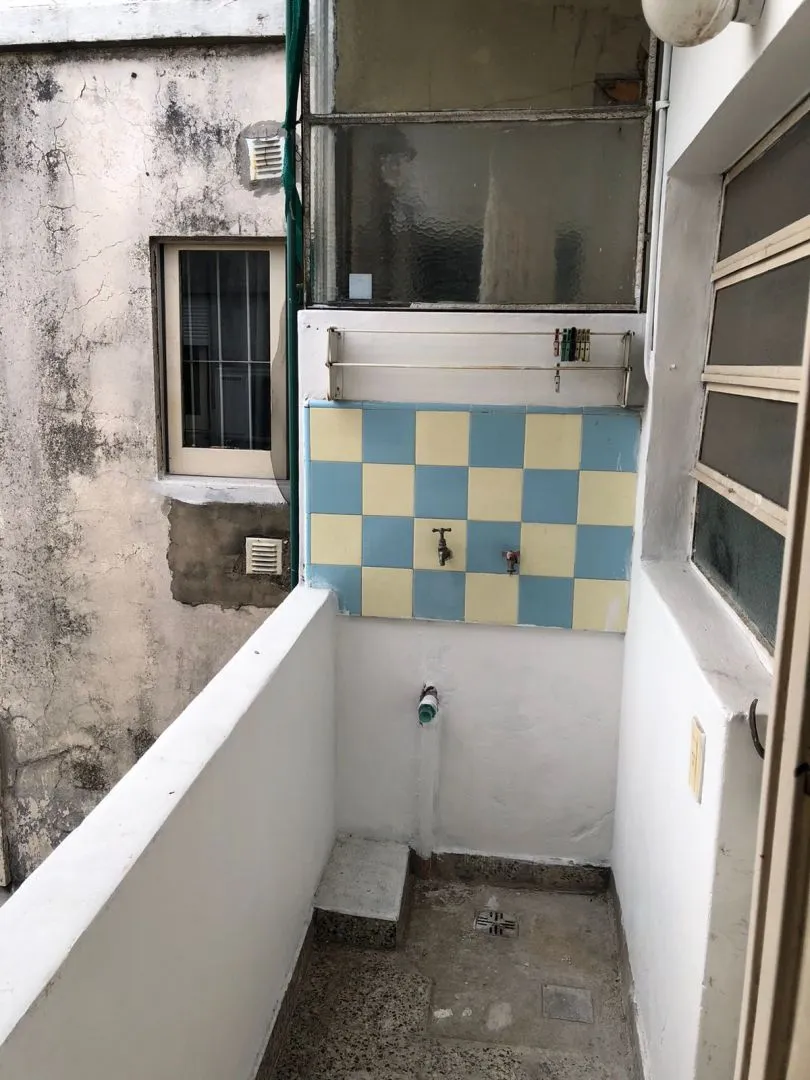 Квартира из 2 комнат на 1 спальню, внутренняя планировка, площадью не указана. Окна во внутренний двор, хорошее естественное освещение, открытая боковая перспектива. Установлен кондиционер. Отдельная кухня с зоной для стирки. Доступ по лестнице. Коммунальные платежи здания указаны как невысокие.