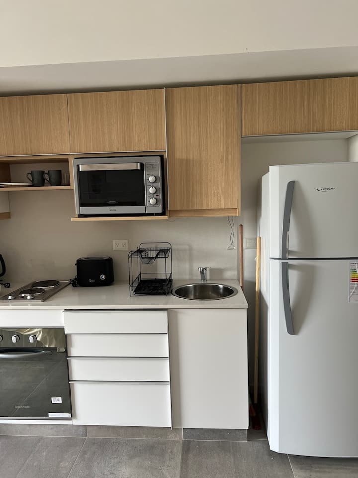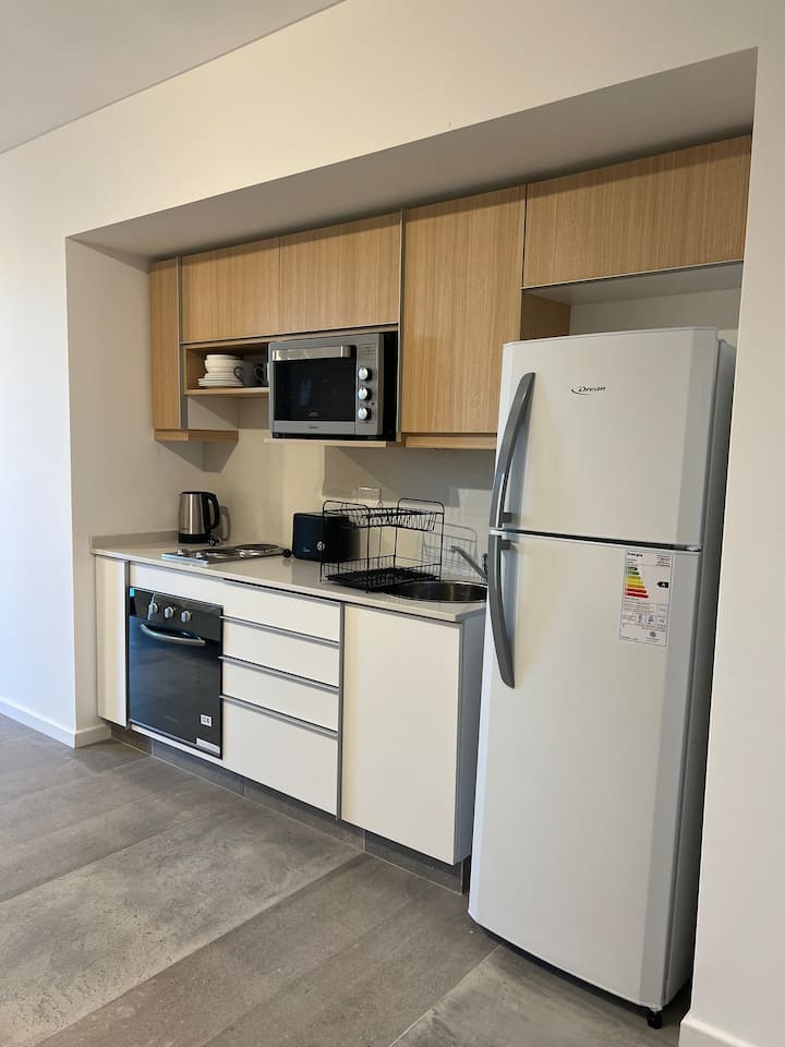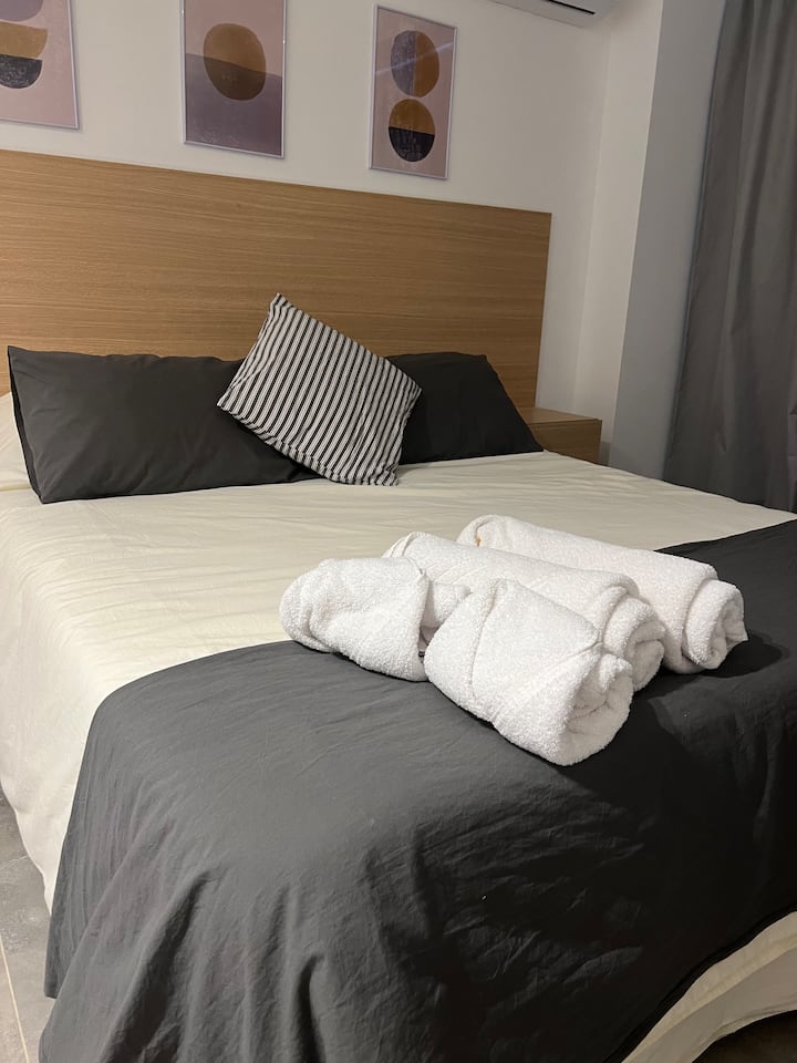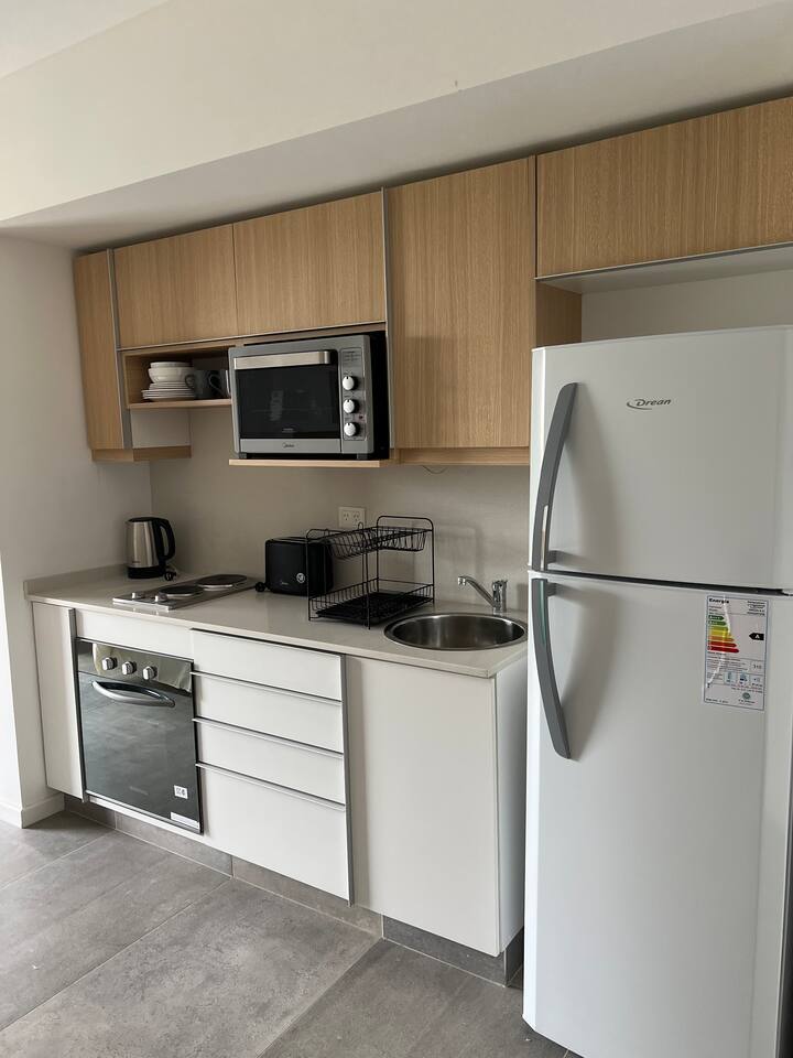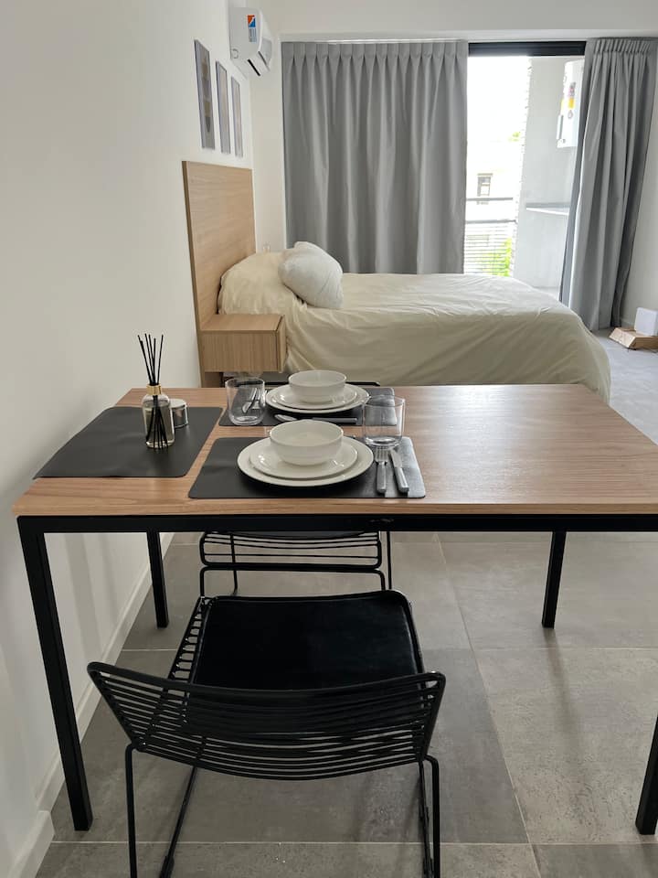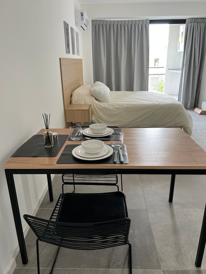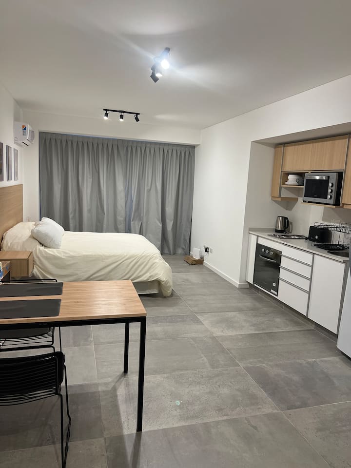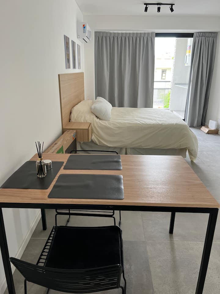 Новая квартира-студия в Villa Crespo на 3-м этаже, окна на улицу Calle Serrano. В здании есть лифт. В квартире установлена новая кухня, холодильник, электрическая плита, посуда и кухонная утварь. Есть двуспальная кровать (160 см), кондиционер, пледы и полотенца, фен, встроенный шкаф, а также 45-дюймовый Smart TV (для просмотра Netflix и других приложений). На студии имеется балкон, а также есть микроволновая печь. В описании указано, что здание находится примерно в 100 м от Av. Córdoba, в пешей