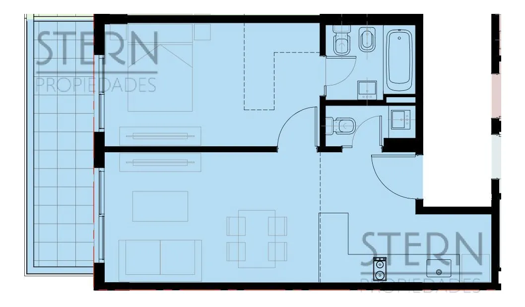 Квартира с 2 комнатами площадью 44 m², с балконом 9 m², всего 53 m², в Villa Crespo. В комплексе предусмотрены мебель и планировка «a estrenar»: объединённая гостиная-столовая, кухня с интеграцией и выводами для стиральной машины или посудомоечной машины, электрический духовой шкаф и варочная панель. Есть центральное горячее водоснабжение (газ), 1 кондиционер холод/тепло, гардеробная в спальне и 2 санузла (гостевой туалет и душевая при спальне), система хранения с внутренними шкафами, электронны