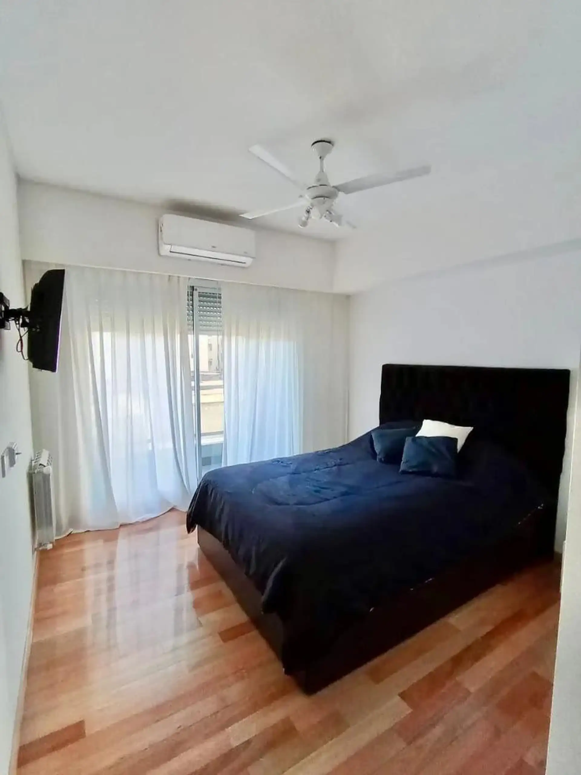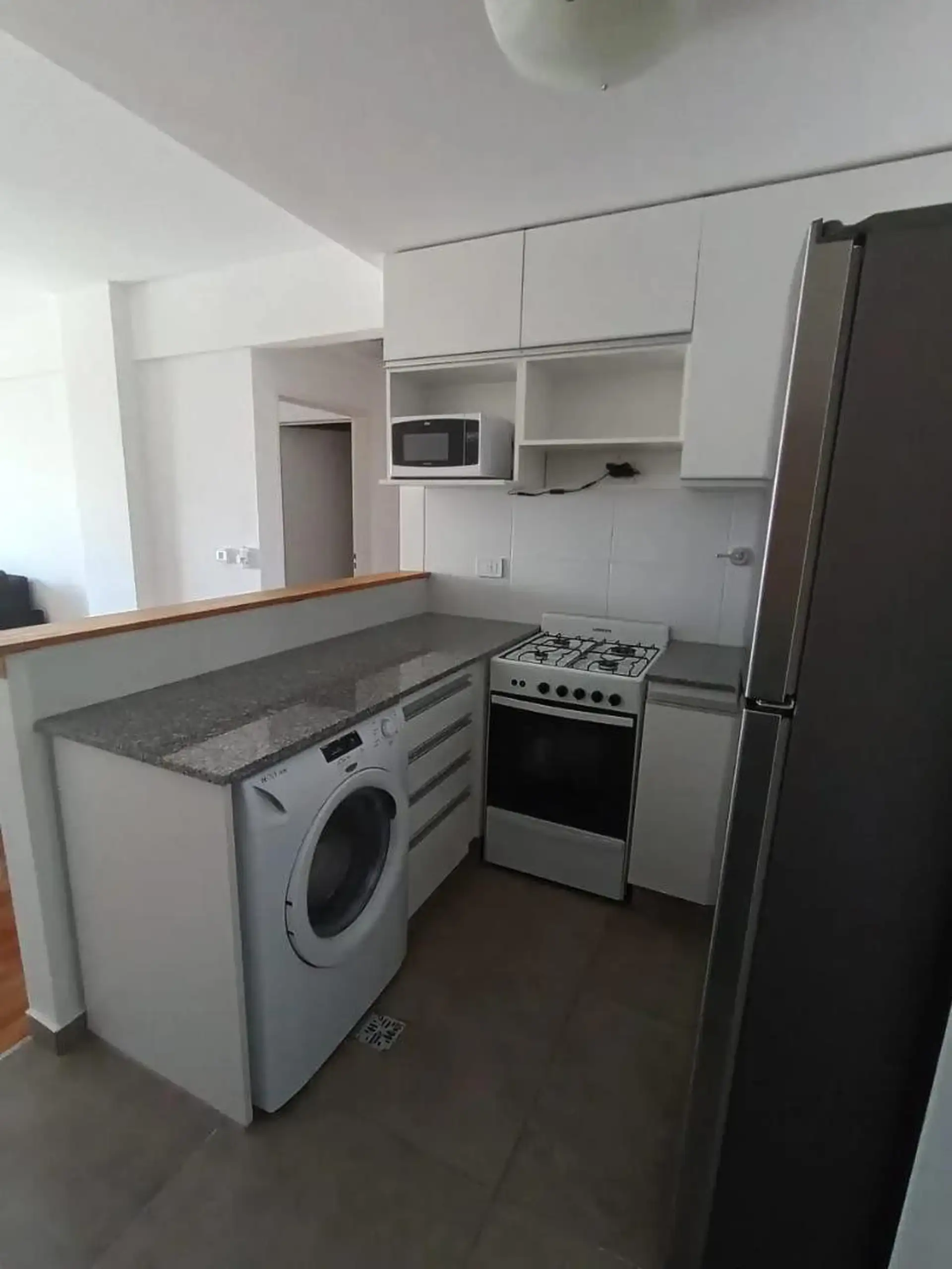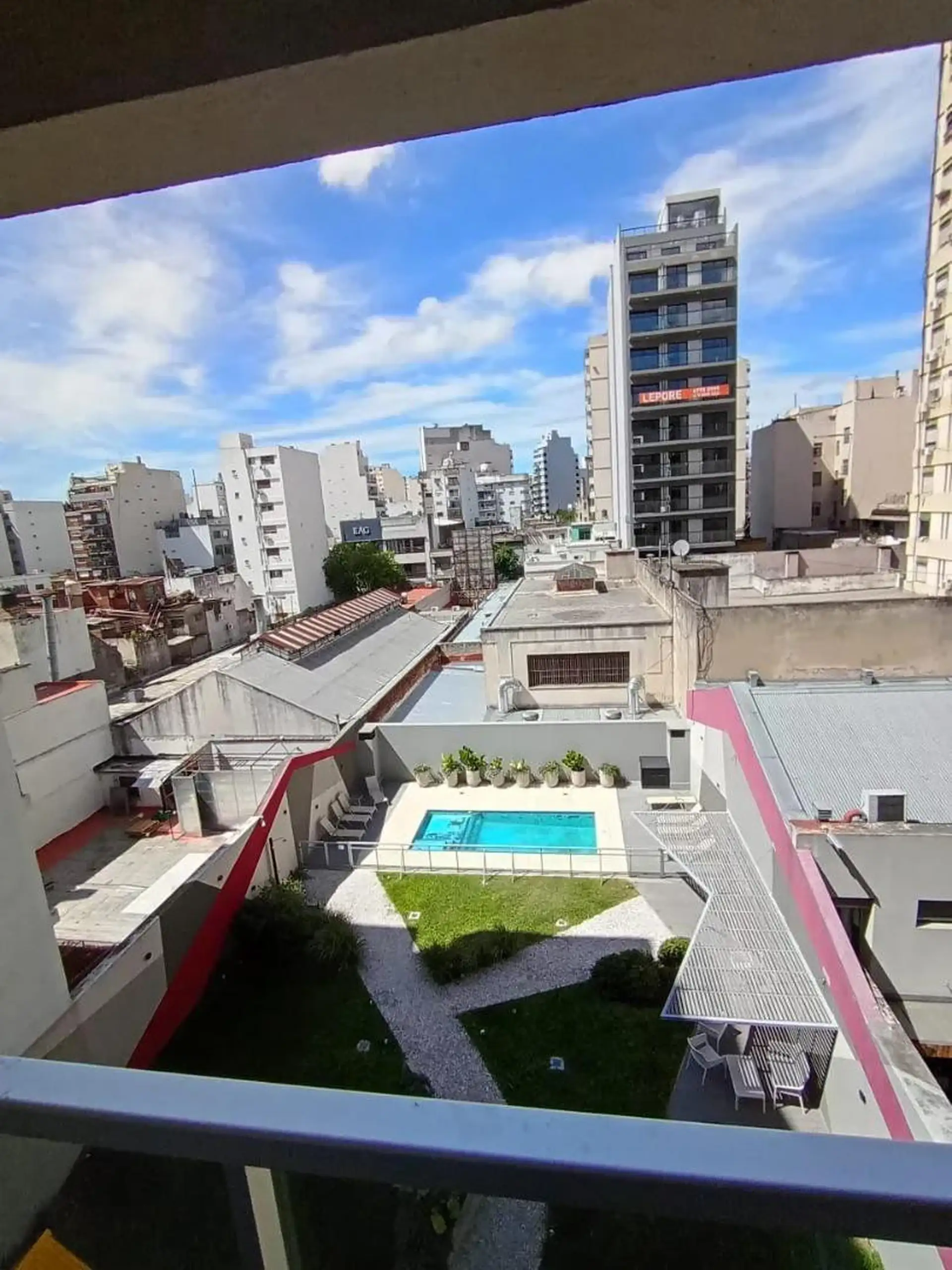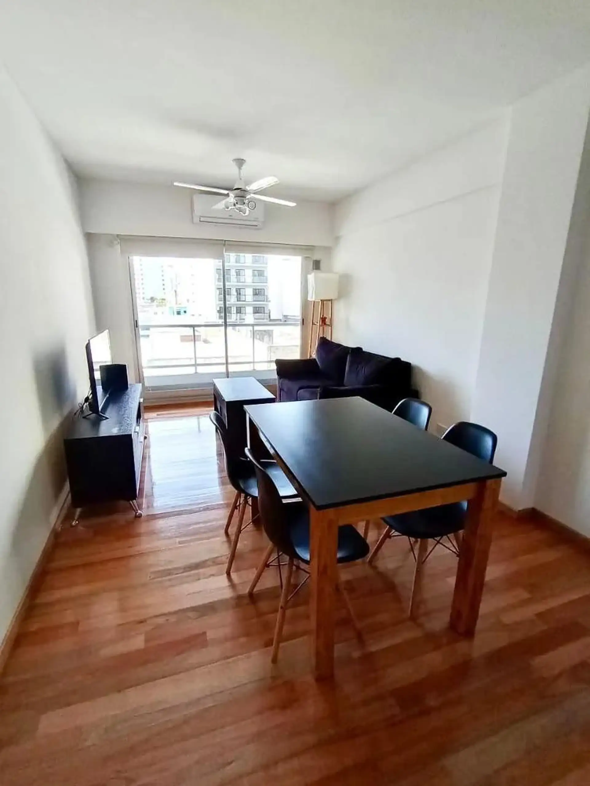 Квартира-студия площадью не указана, окна во двор (contrafrente), с мебелью. В здании 3 года с момента постройки; планировка включает зону гостиной с интегрированной кухней и барной стойкой, полноценную ванную с душем и смежный балкон, который соединяет гостиную и спальную зону. Кондиционер и вентиляторы в обеих основных зонах, двуслойные/пластиковые ламинированные паркетные полы; есть гардероб (walking closet) в спальной зоне. Предусмотрено (закреплённое) парковочное место в подземном паркинге