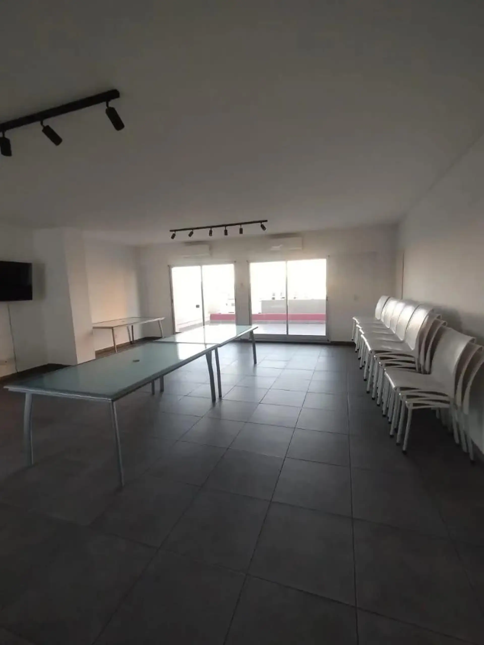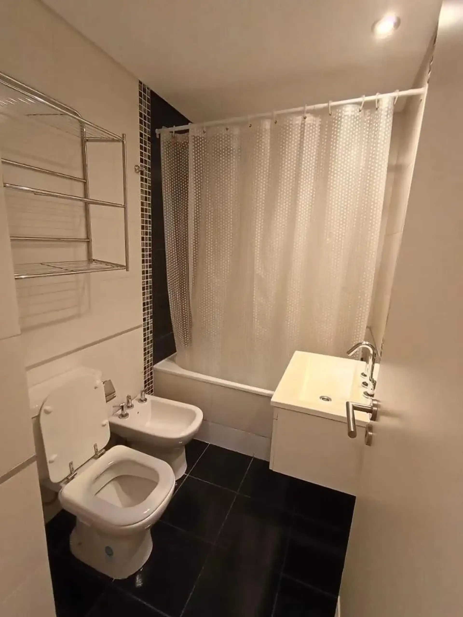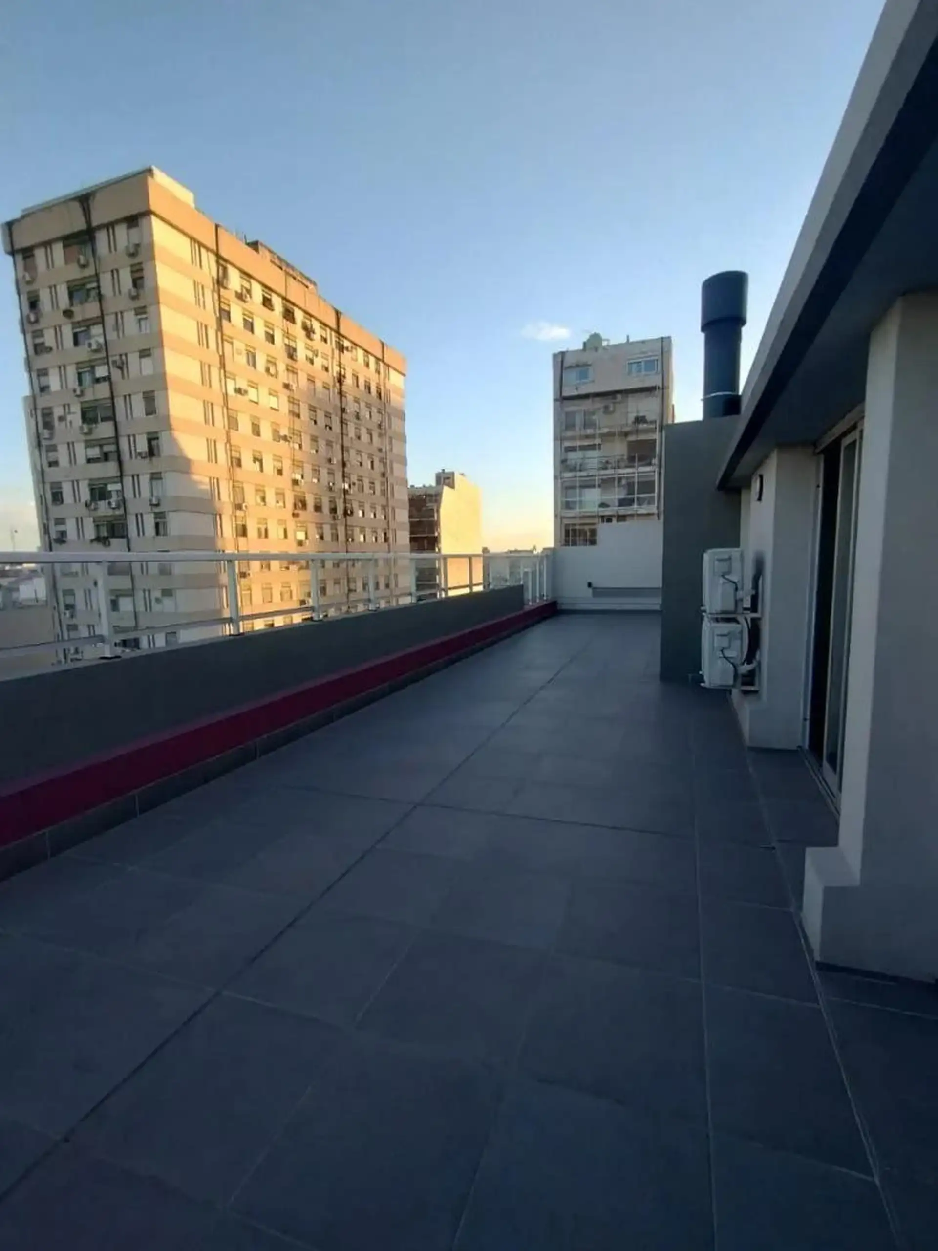 Квартира-студия площадью не указана, окна во двор (contrafrente), с мебелью. В здании 3 года с момента постройки; планировка включает зону гостиной с интегрированной кухней и барной стойкой, полноценную ванную с душем и смежный балкон, который соединяет гостиную и спальную зону. Кондиционер и вентиляторы в обеих основных зонах, двуслойные/пластиковые ламинированные паркетные полы; есть гардероб (walking closet) в спальной зоне. Предусмотрено (закреплённое) парковочное место в подземном паркинге