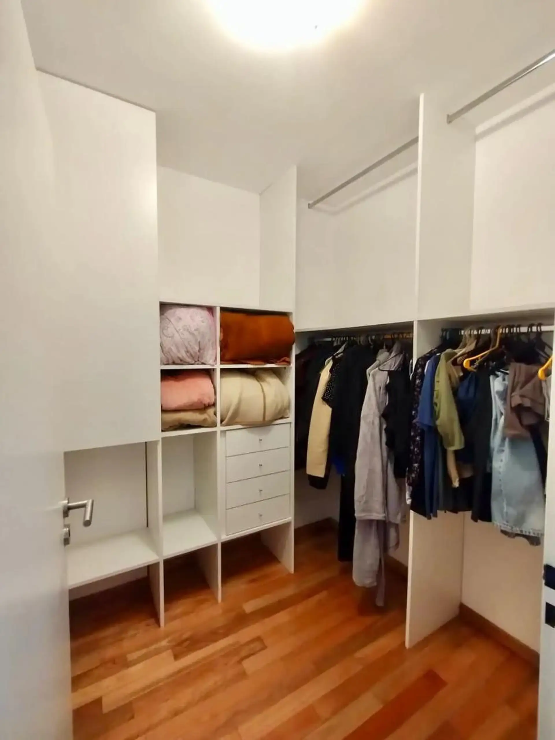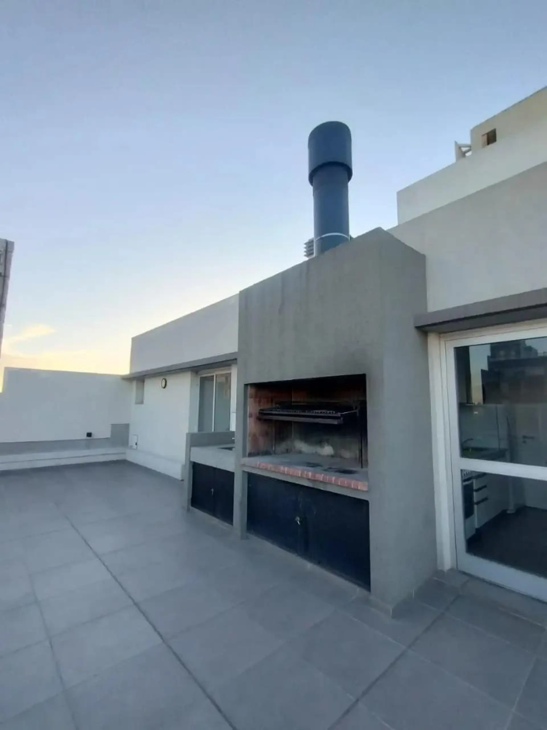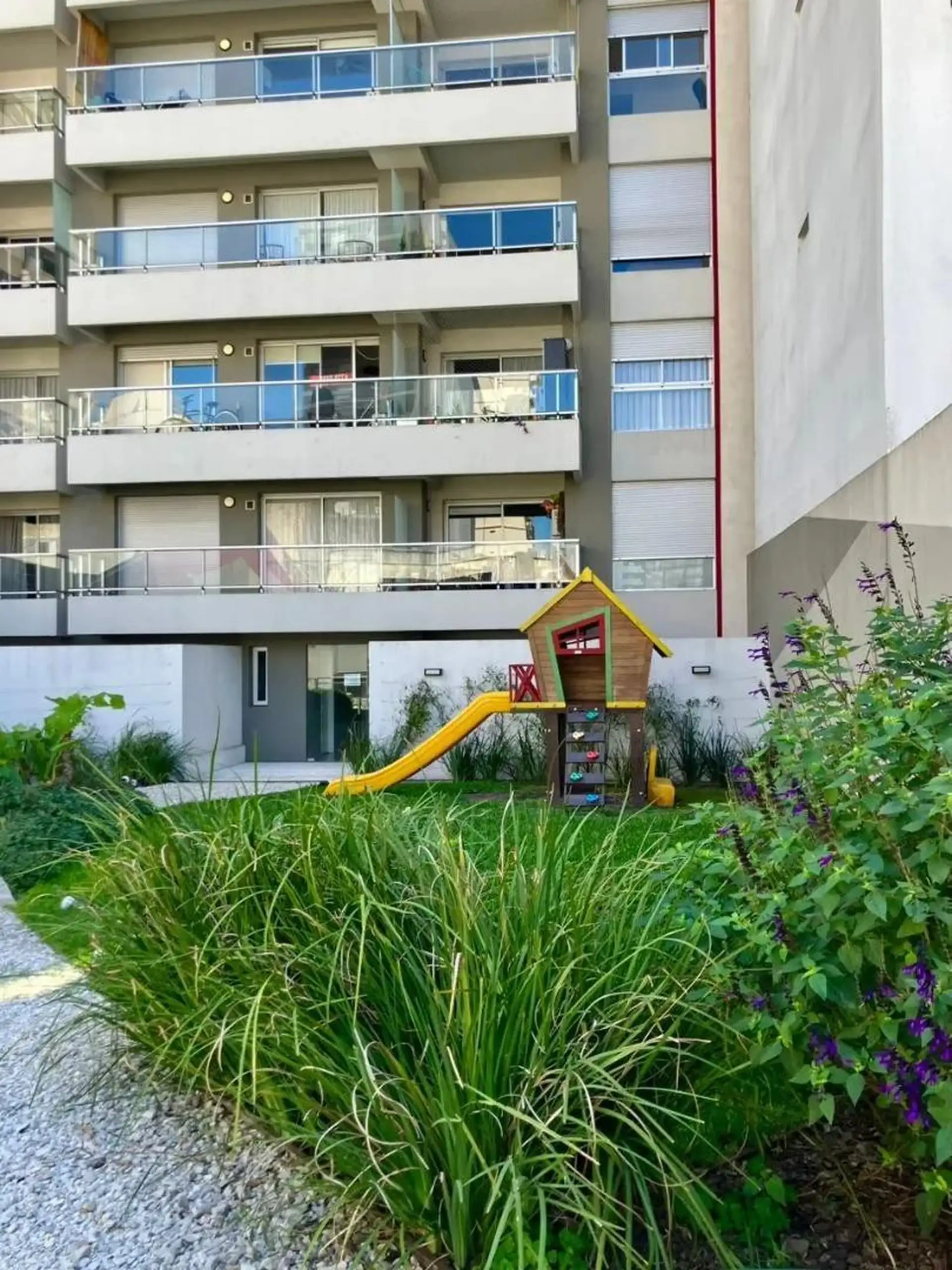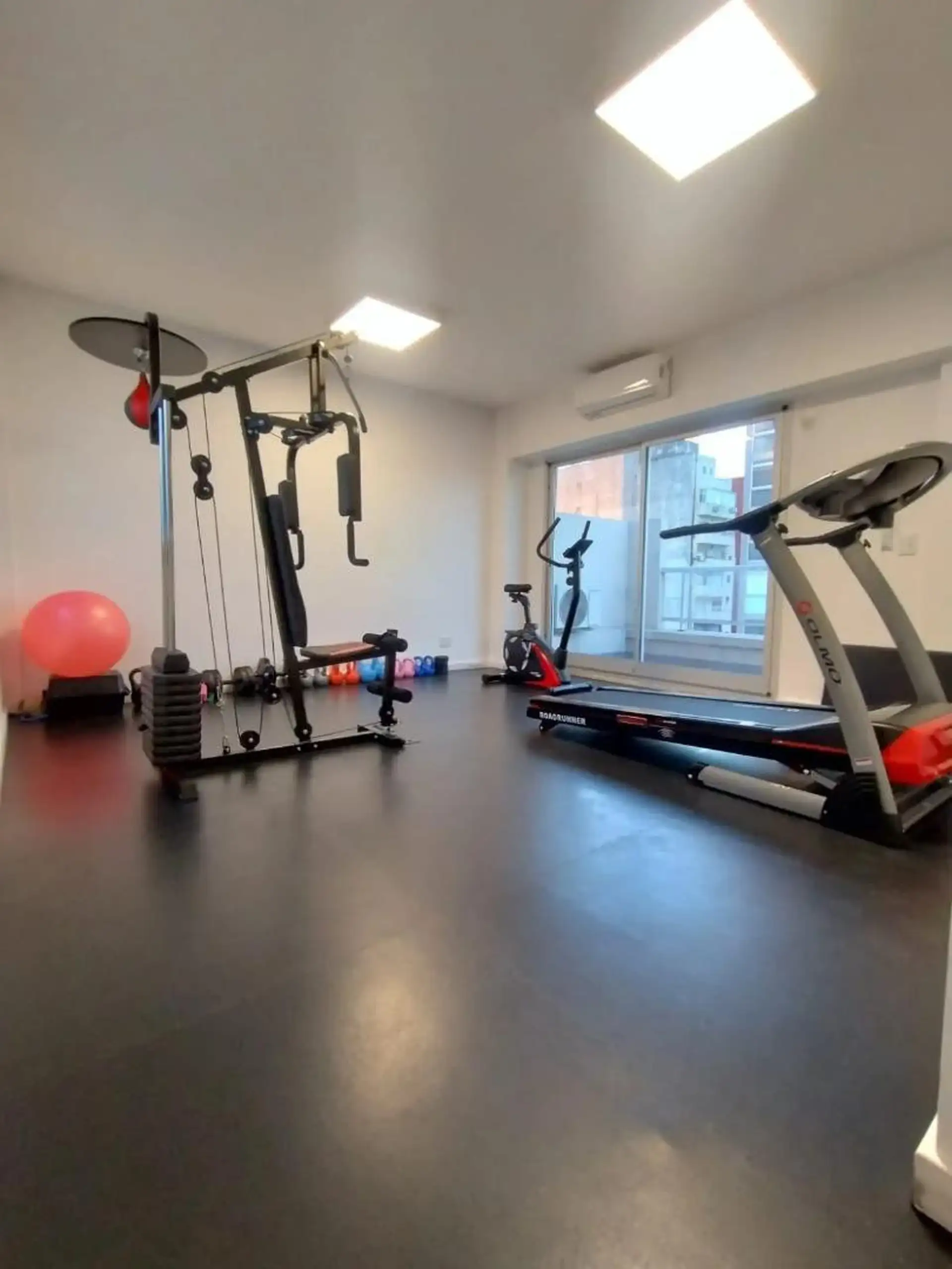 Квартира-студия площадью не указана, окна во двор (contrafrente), с мебелью. В здании 3 года с момента постройки; планировка включает зону гостиной с интегрированной кухней и барной стойкой, полноценную ванную с душем и смежный балкон, который соединяет гостиную и спальную зону. Кондиционер и вентиляторы в обеих основных зонах, двуслойные/пластиковые ламинированные паркетные полы; есть гардероб (walking closet) в спальной зоне. Предусмотрено (закреплённое) парковочное место в подземном паркинге