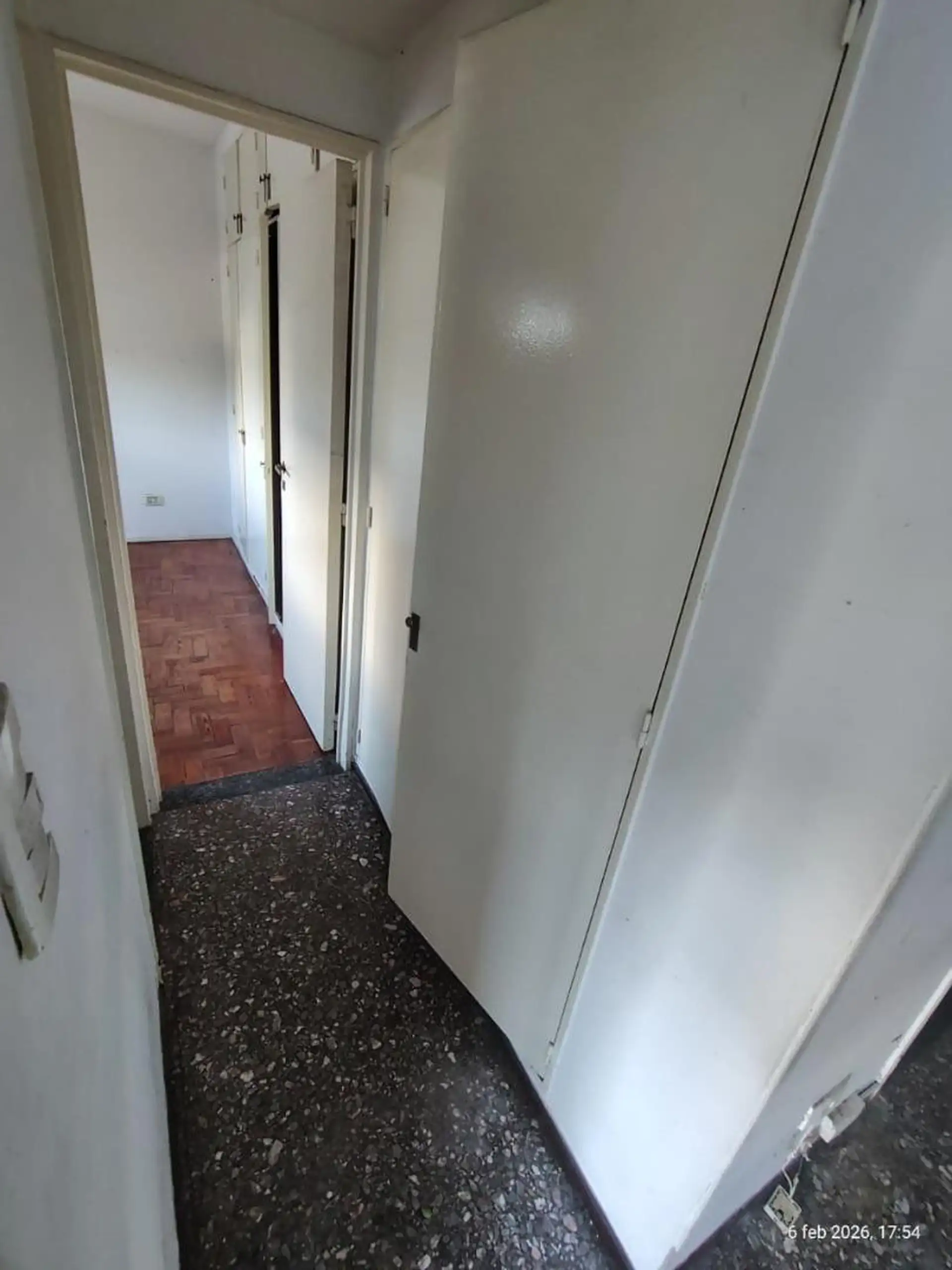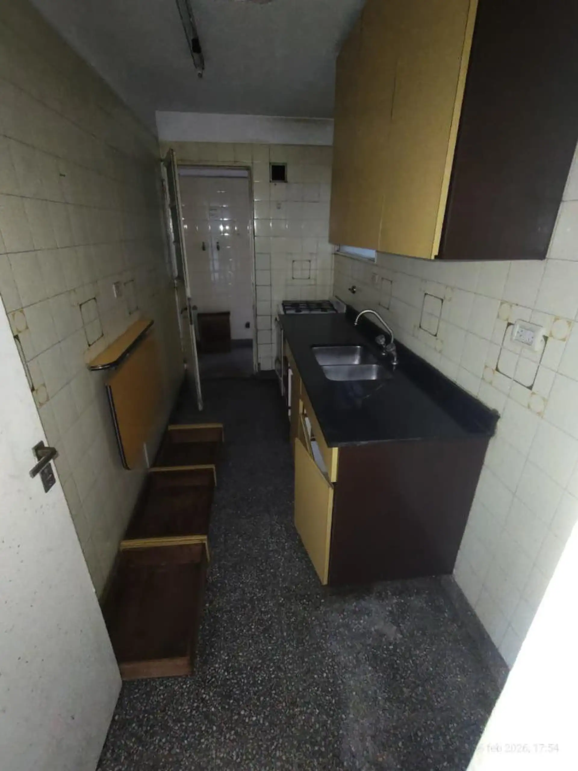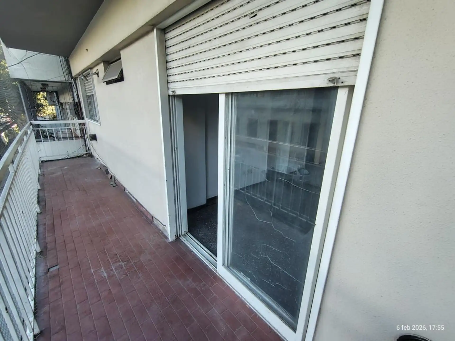 Квартира в Villa del Parque площадью 40 m²: 2 комнаты, окна на улицу, с балконом и патио. Планировка включает гостиную-столовую, кухню и встроенный шкаф. Из инженерных услуг указаны канализация и газ. Требуется залог в размере 1 месяца.
