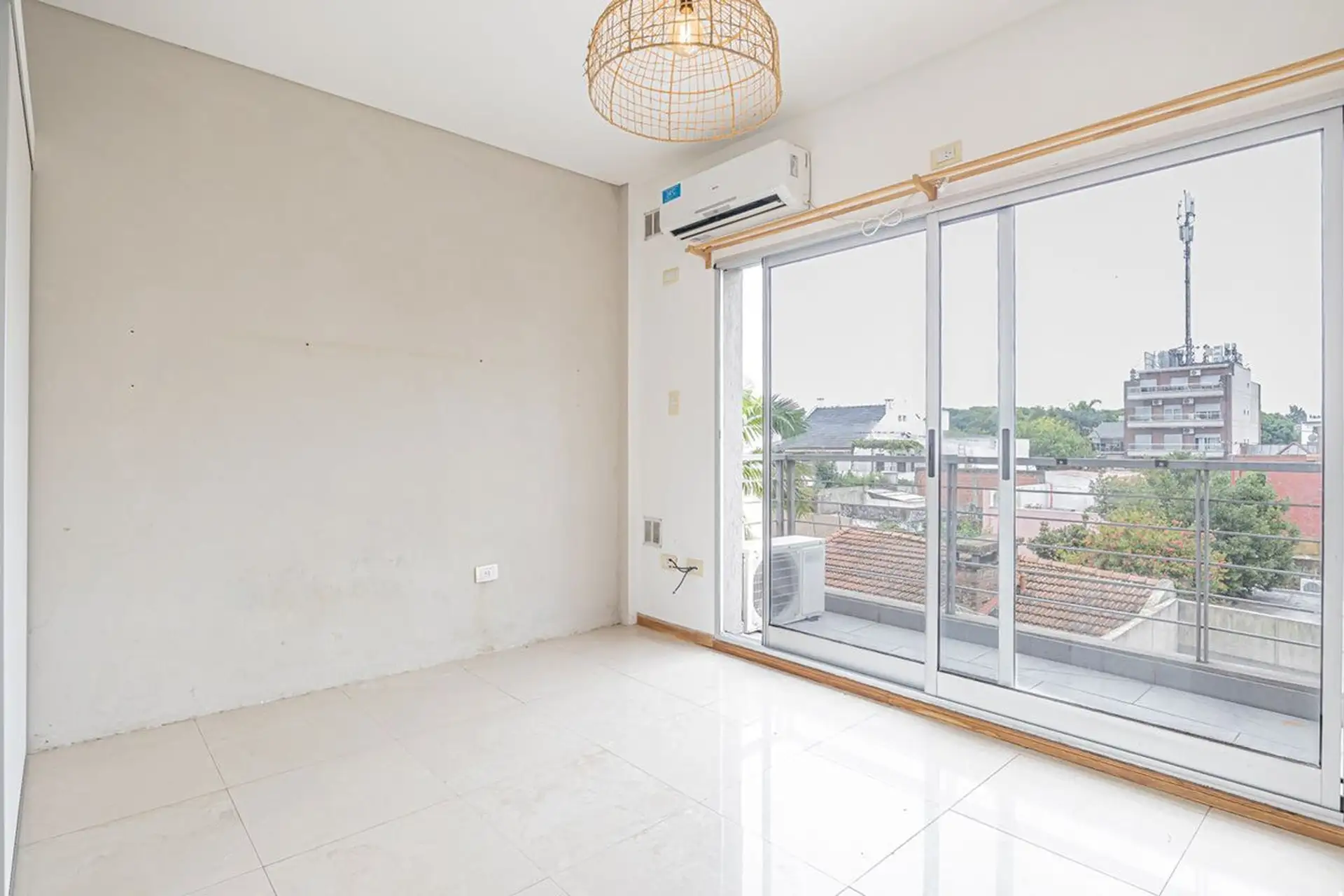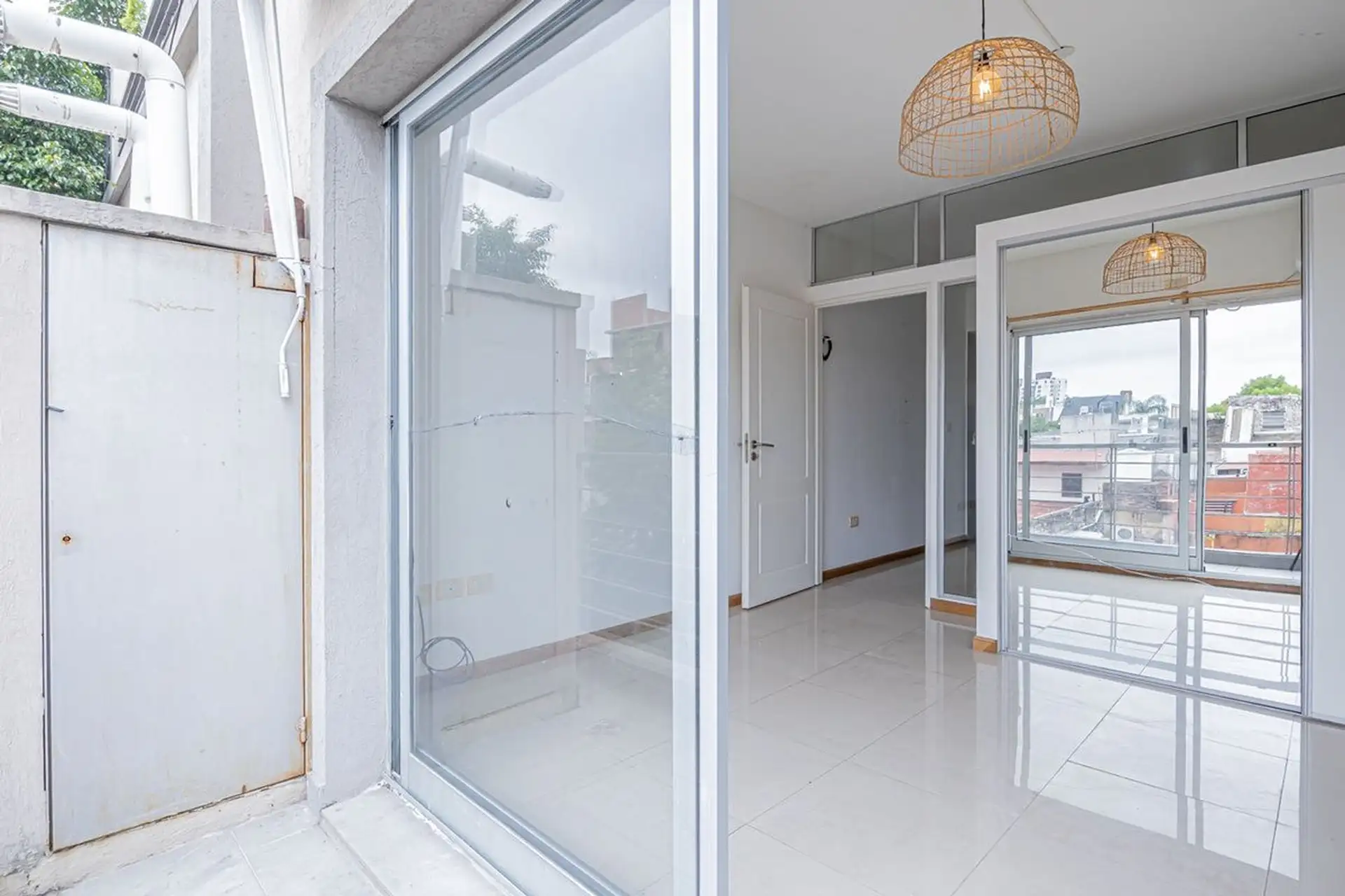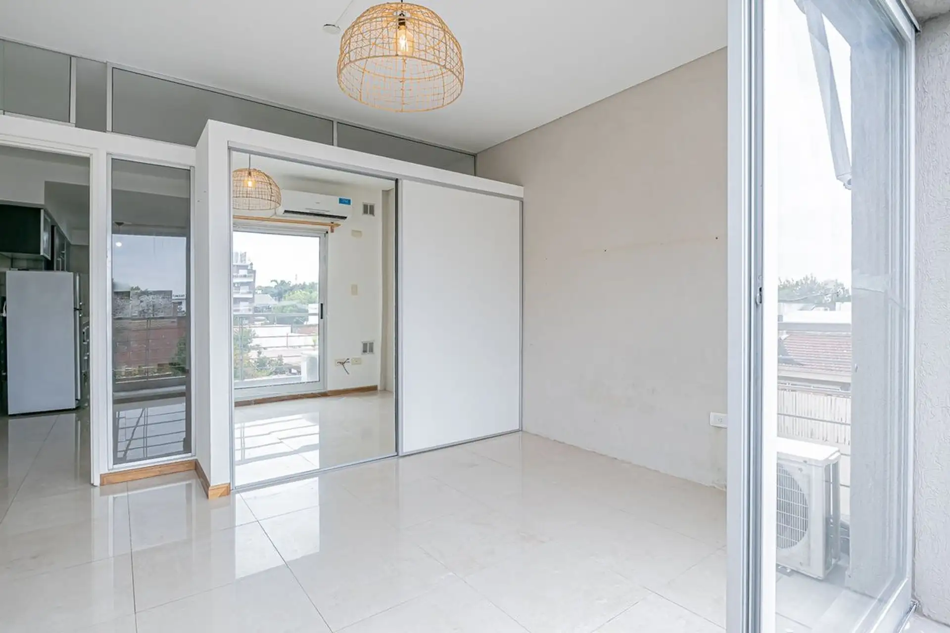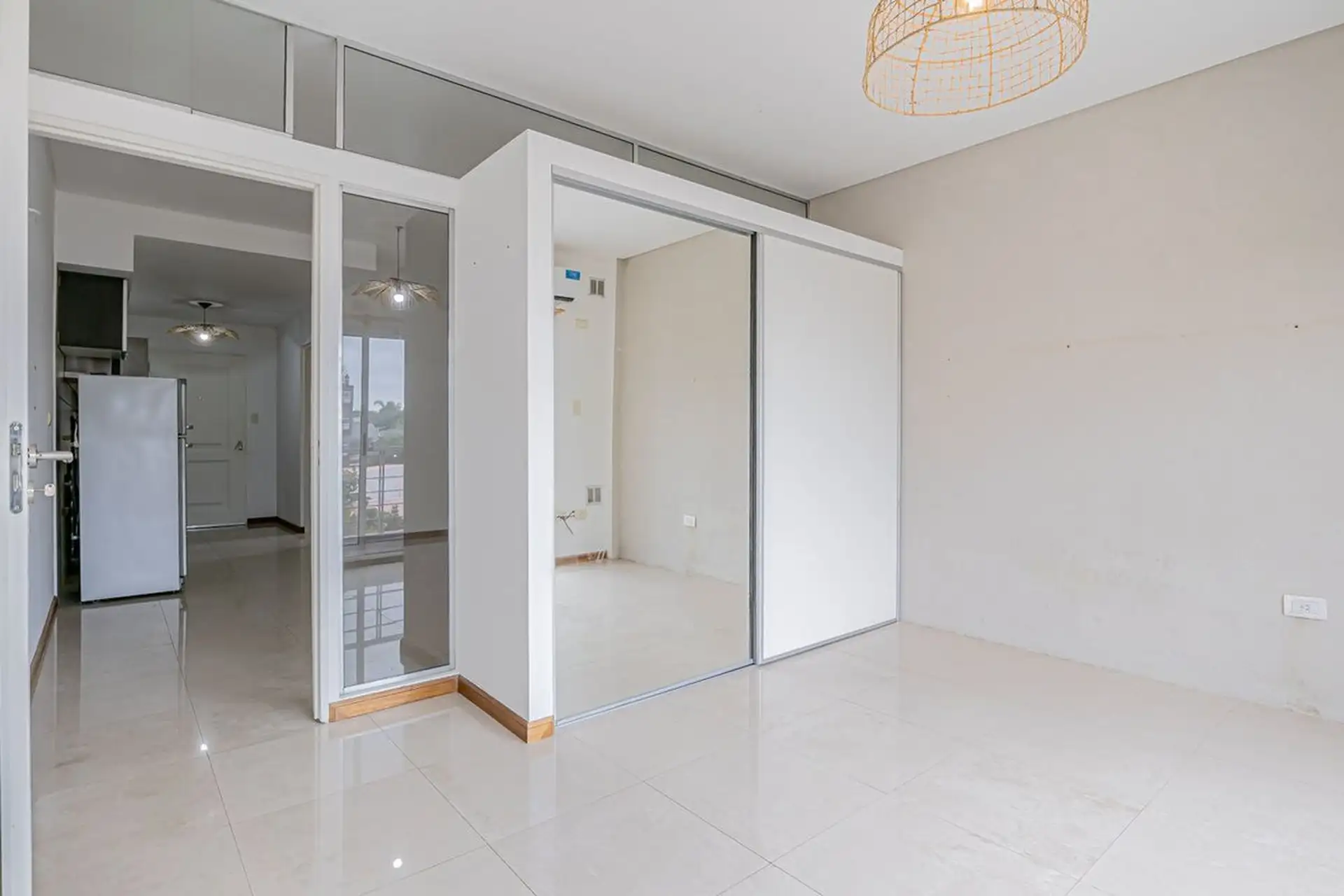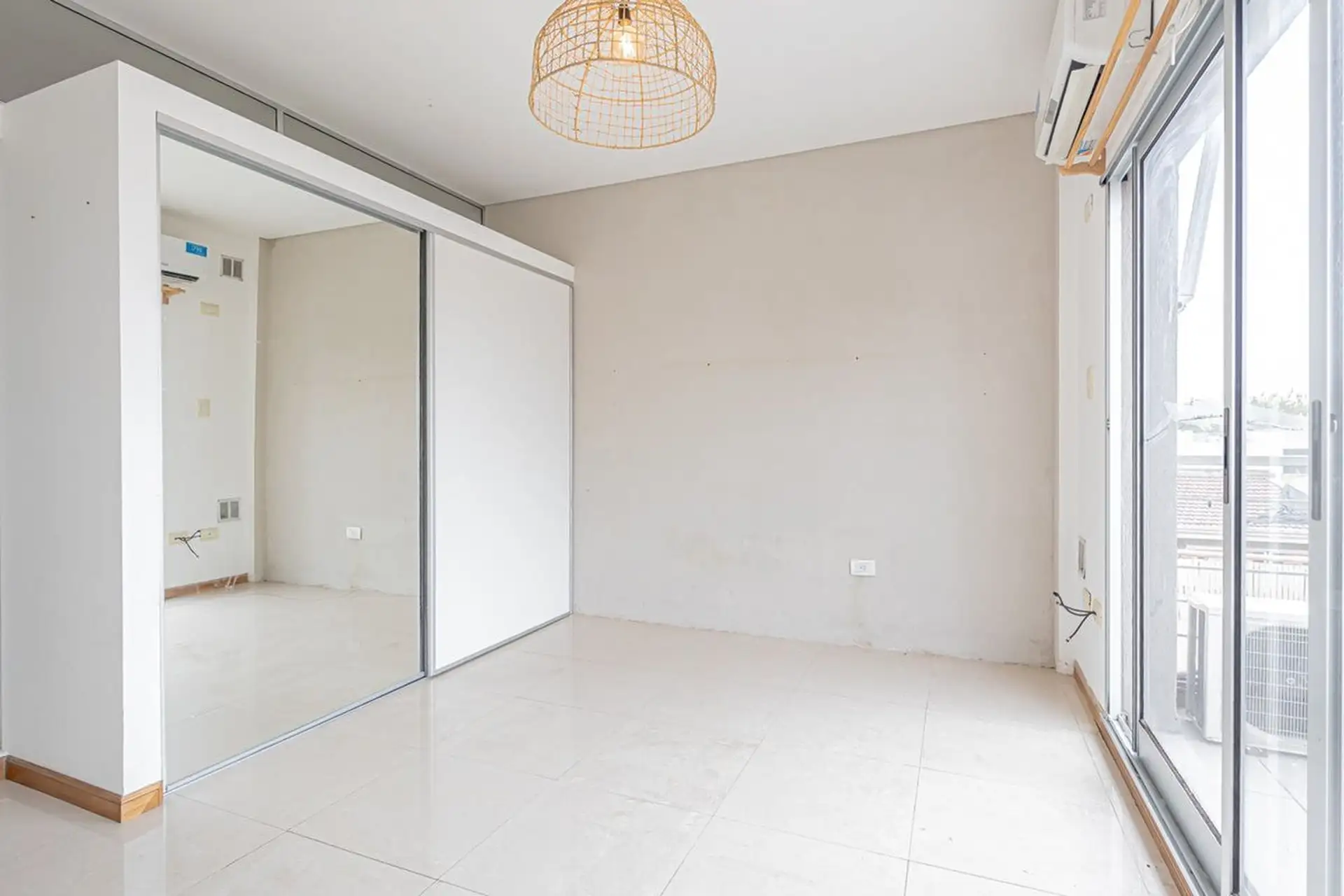 Квартира в Villa Devoto, 2 комнаты (1 спальня) с балконом. В квартире гостиная с интегрированной кухней, в кухне указаны мебель и отделка из меламина и алюминия. Спальня с выходом на балкон через большое окно; предусмотрен шкаф для хранения и зеркало. Ванная комната полностью укомплектована, указаны ванна и сантехника. Коммунальные платежи здания и другие расходы в объявлении не уточнены. Указаны расстояния: 2 квартала до Av. Gral. Paz, 2 квартала до Lope de Vega, 4 квартала до Av. Francisco Bei