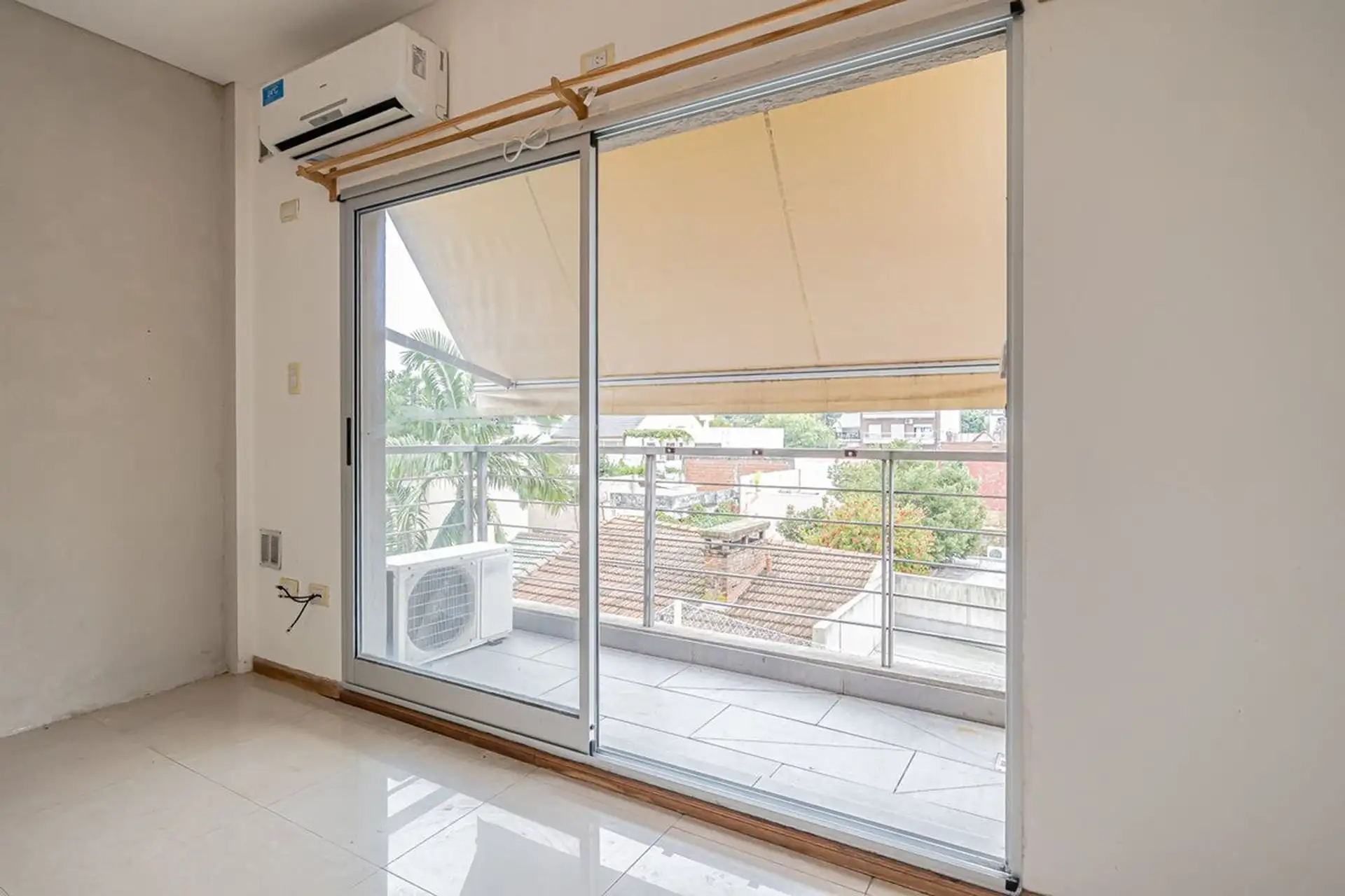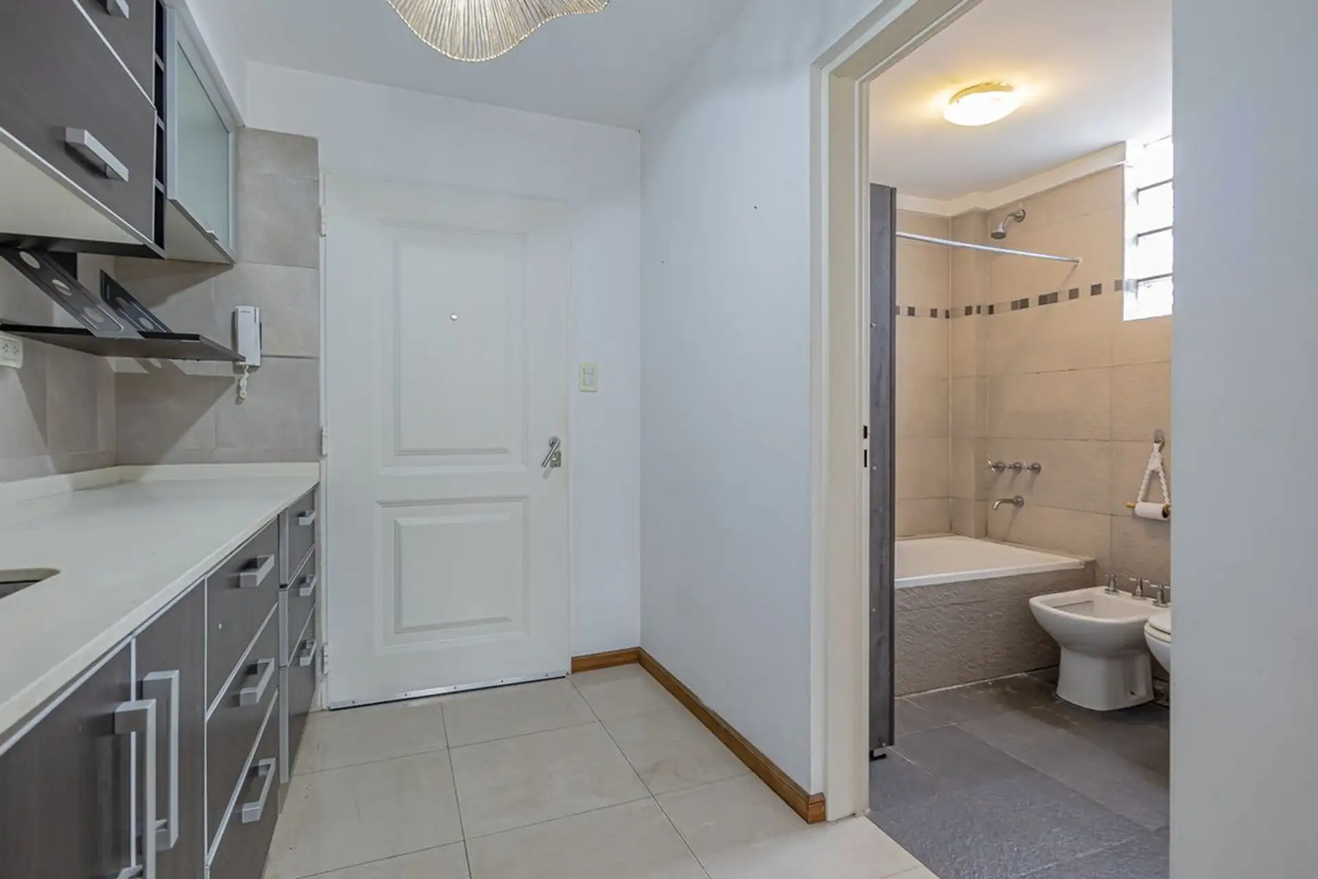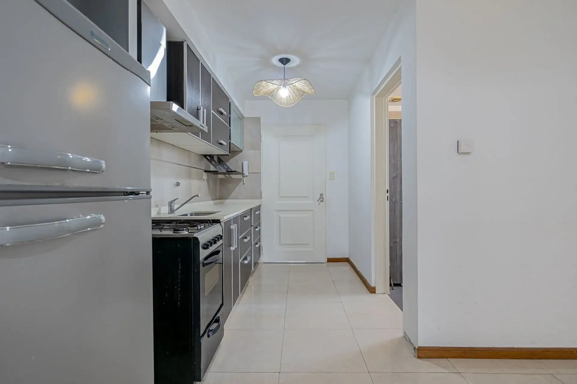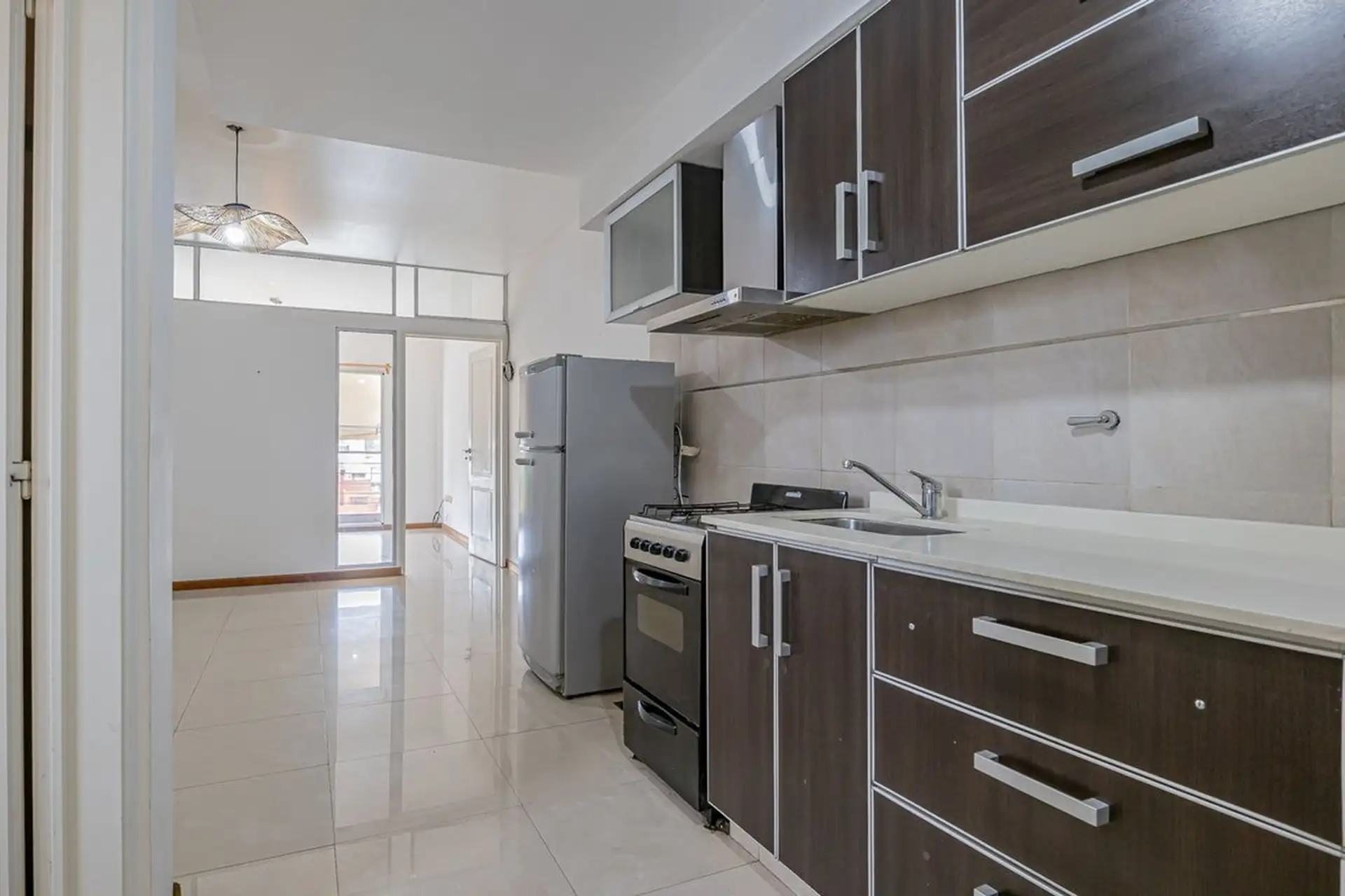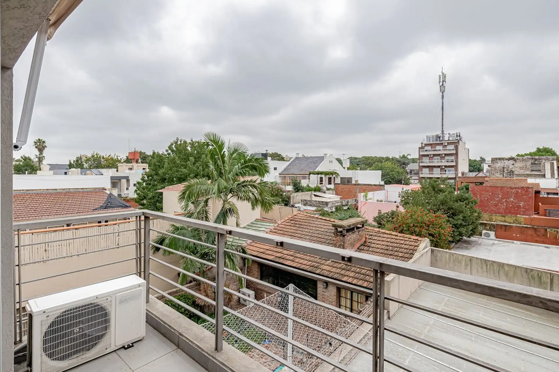 Квартира в Villa Devoto, 2 комнаты (1 спальня) с балконом. В квартире гостиная с интегрированной кухней, в кухне указаны мебель и отделка из меламина и алюминия. Спальня с выходом на балкон через большое окно; предусмотрен шкаф для хранения и зеркало. Ванная комната полностью укомплектована, указаны ванна и сантехника. Коммунальные платежи здания и другие расходы в объявлении не уточнены. Указаны расстояния: 2 квартала до Av. Gral. Paz, 2 квартала до Lope de Vega, 4 квартала до Av. Francisco Bei