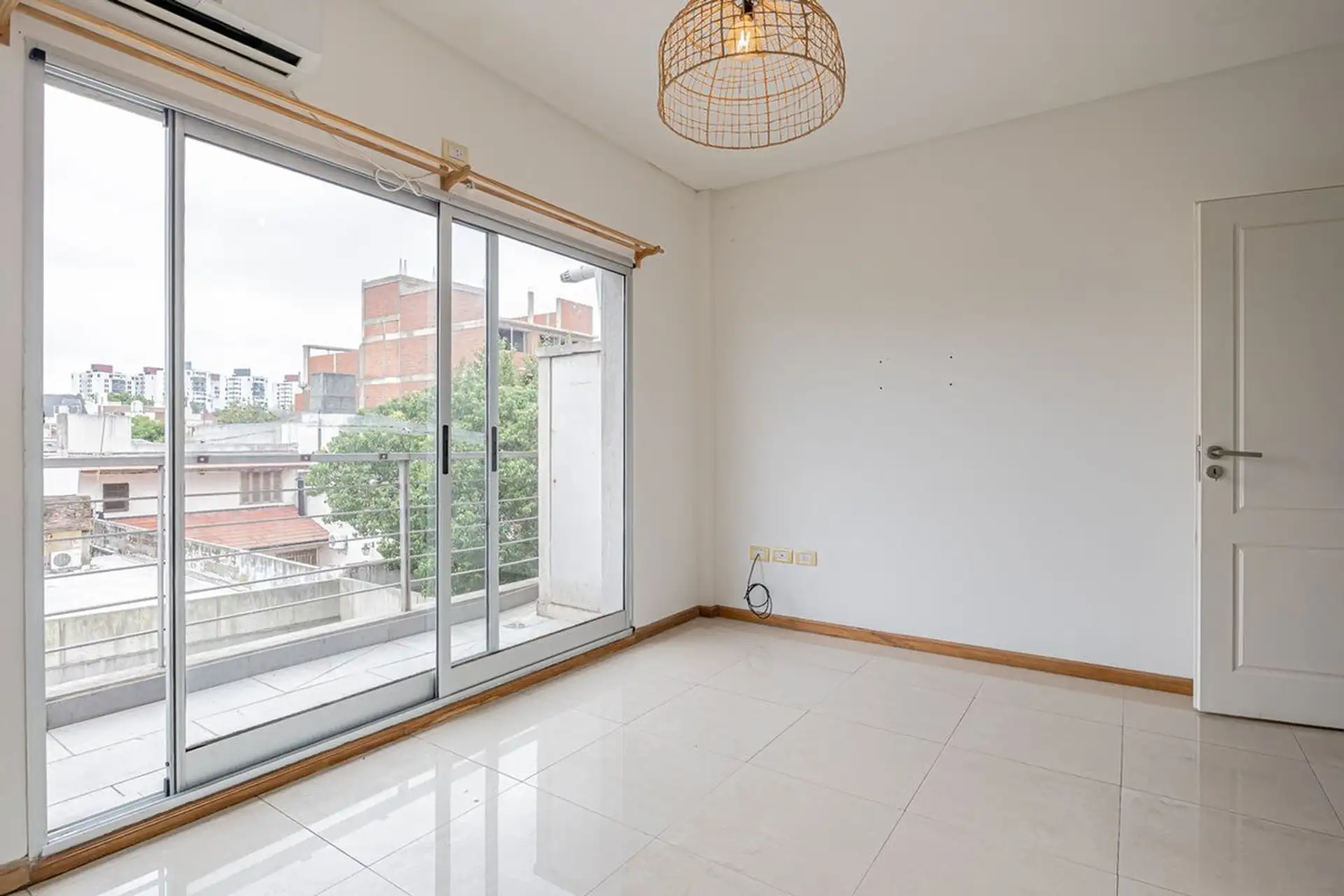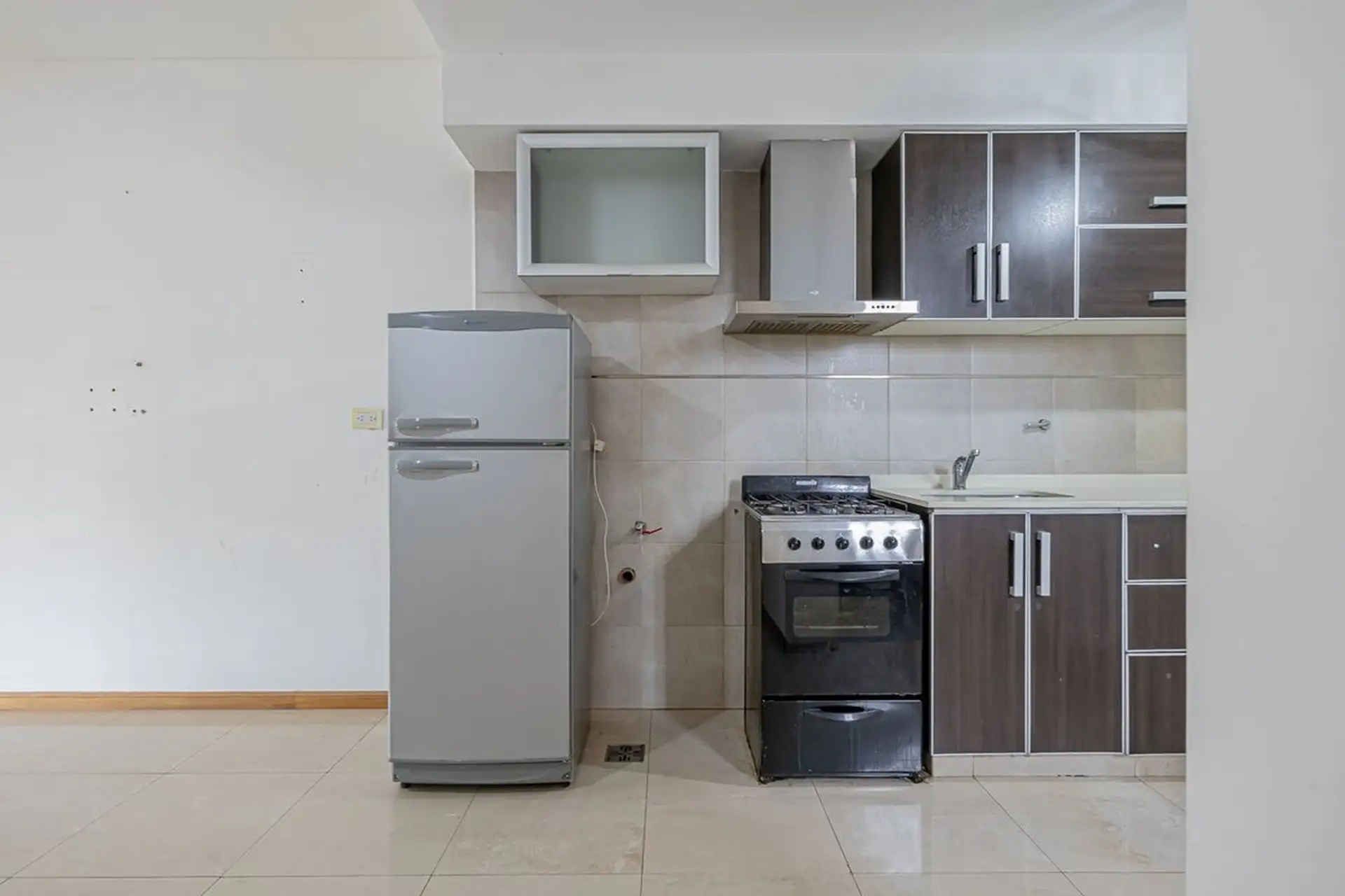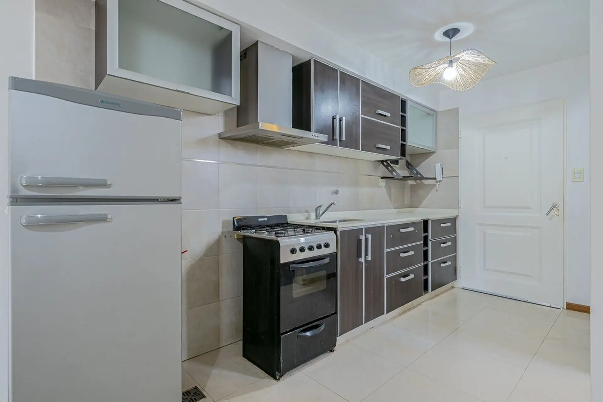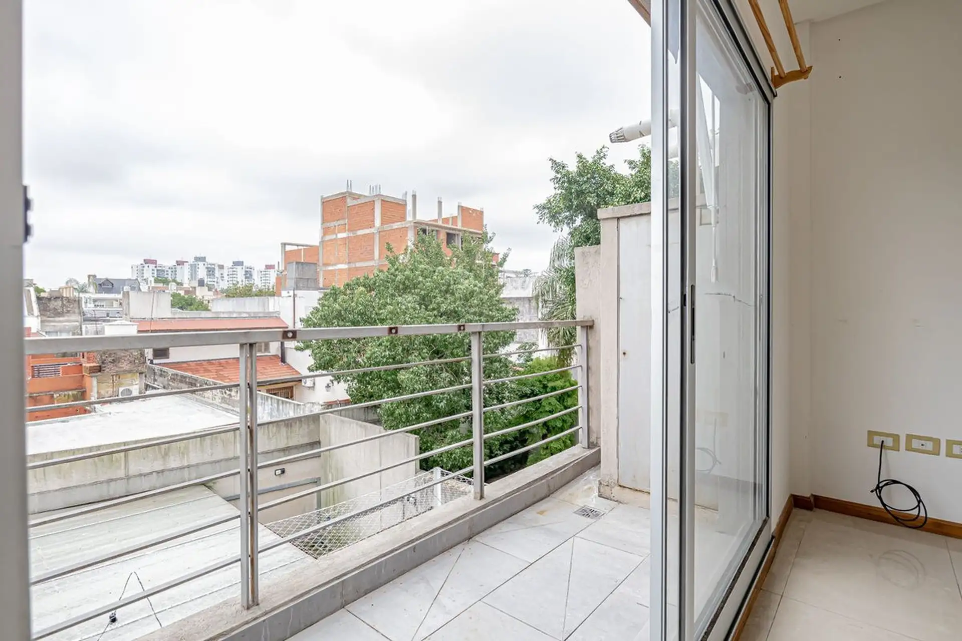 Квартира в Villa Devoto, 2 комнаты (1 спальня) с балконом. В квартире гостиная с интегрированной кухней, в кухне указаны мебель и отделка из меламина и алюминия. Спальня с выходом на балкон через большое окно; предусмотрен шкаф для хранения и зеркало. Ванная комната полностью укомплектована, указаны ванна и сантехника. Коммунальные платежи здания и другие расходы в объявлении не уточнены. Указаны расстояния: 2 квартала до Av. Gral. Paz, 2 квартала до Lope de Vega, 4 квартала до Av. Francisco Bei